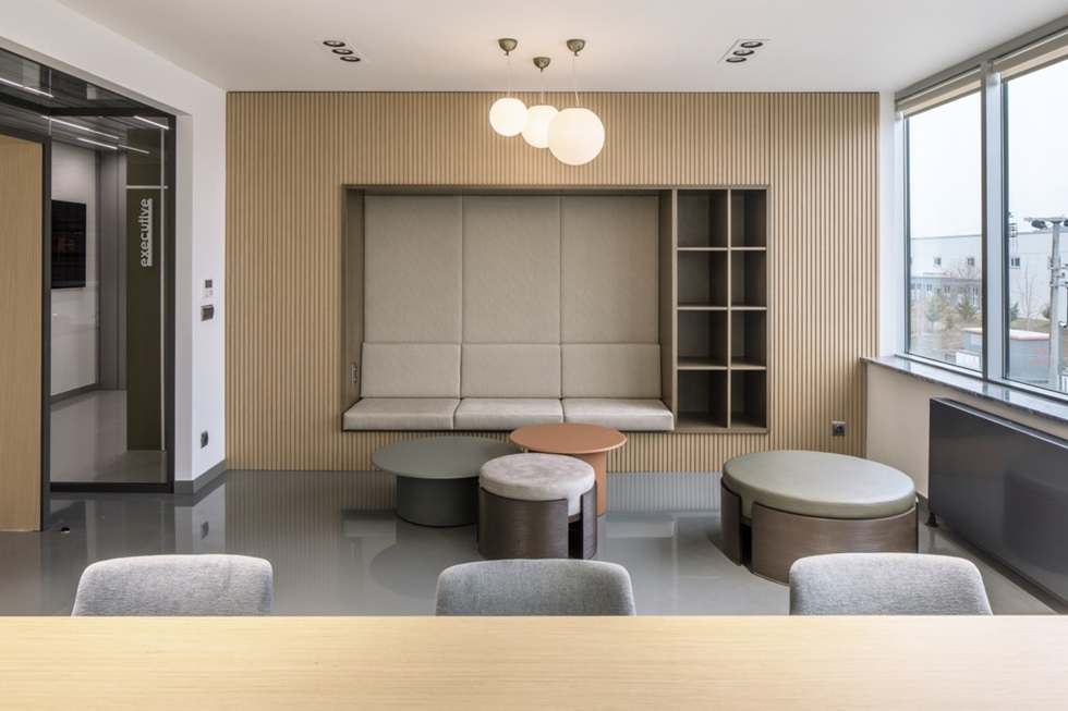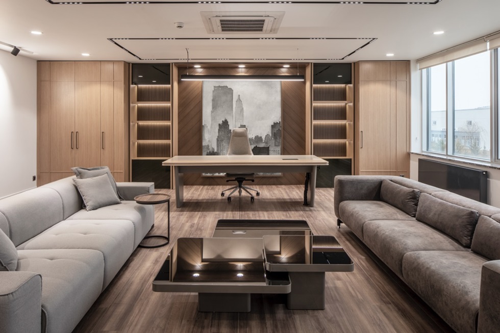 Muhasebe, toplantı ve ikincil ofis odalarının cam blok kütleler ile vurgulanan mimarisi mekanın ana kimliğini oluştururken tutarlı bir anlatım sergiliyor. Cam kütlelerin içinde yer alan ahşap mobilya detayları mahallerin koridor tarafında mahremiyeti sağlıyor. Cam ile bütünleşen mobilyalar aynı zamanda odaların kimliğine uygun kullanımlar ve giriş kapıları için bir alan sağlayıp iç mekanı zenginleştiriyor.
