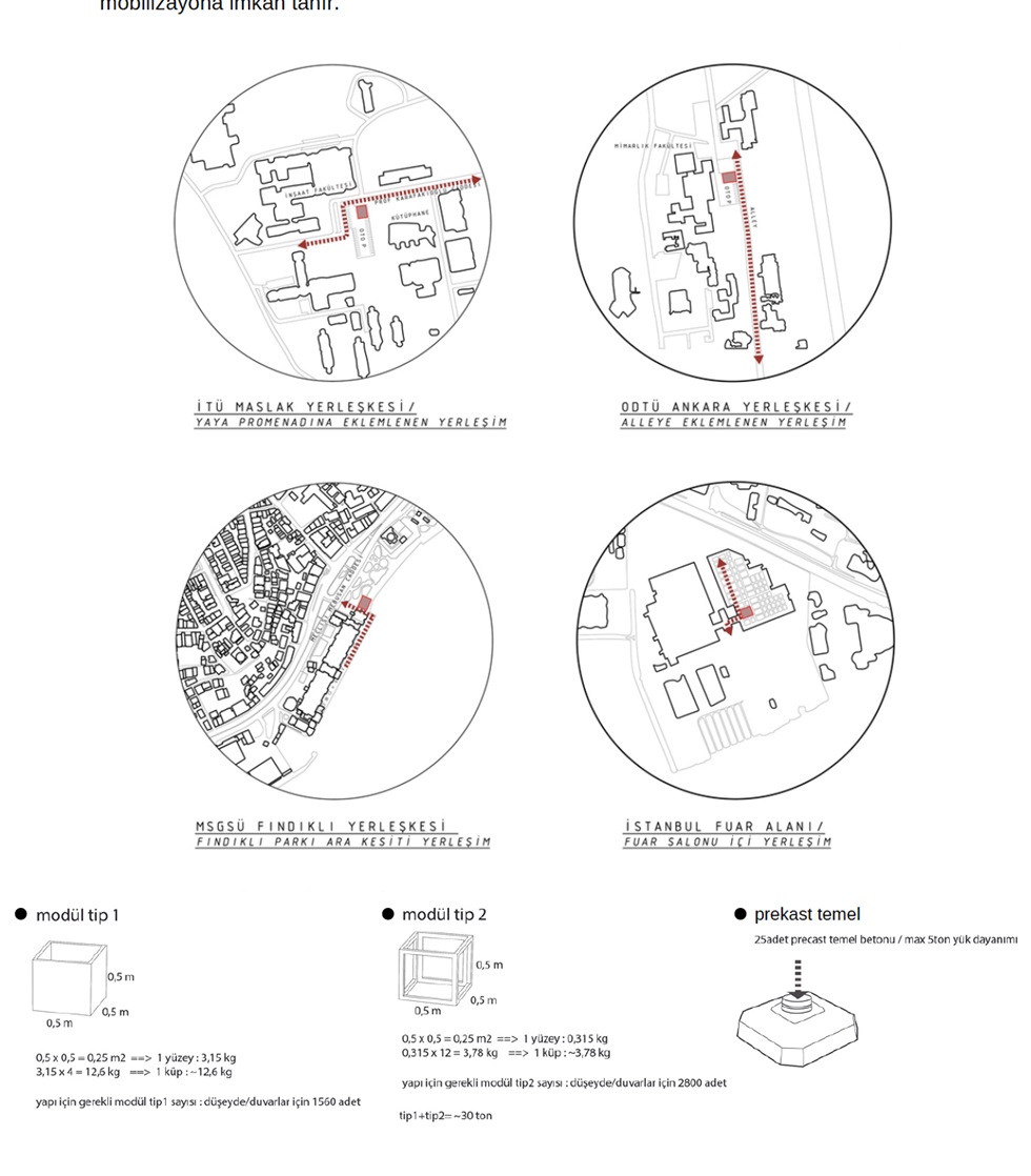 Önerilen proje gerek öğrencilere gerekse halka ulaşabilmesi için demontable şekilde tasarlanmıştır. Üniversite kampüslerinde yaya aksları ve toplanma alanlarına yakın şekilde konumlanabilir. Aynı şekilde fuar alanlarına da adapte edilebilir. Gerek fiyat performansı gerekse geri dönüştürülebilirliği sebebiyle ahşap modüller yıprandığında değiştirilebilir ve mobilizasyona imkan tanır.
