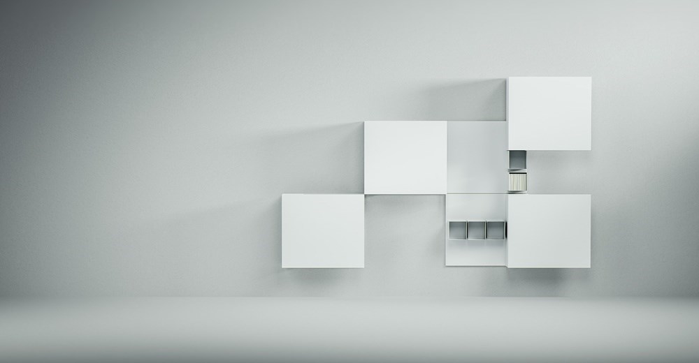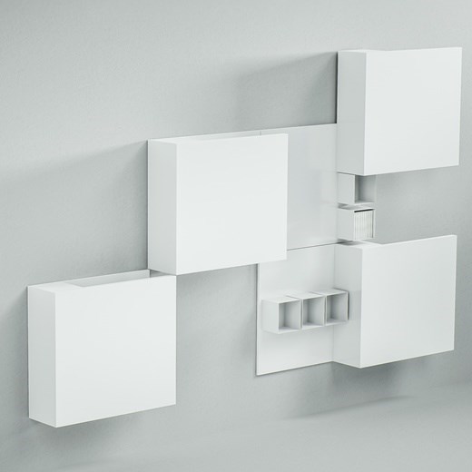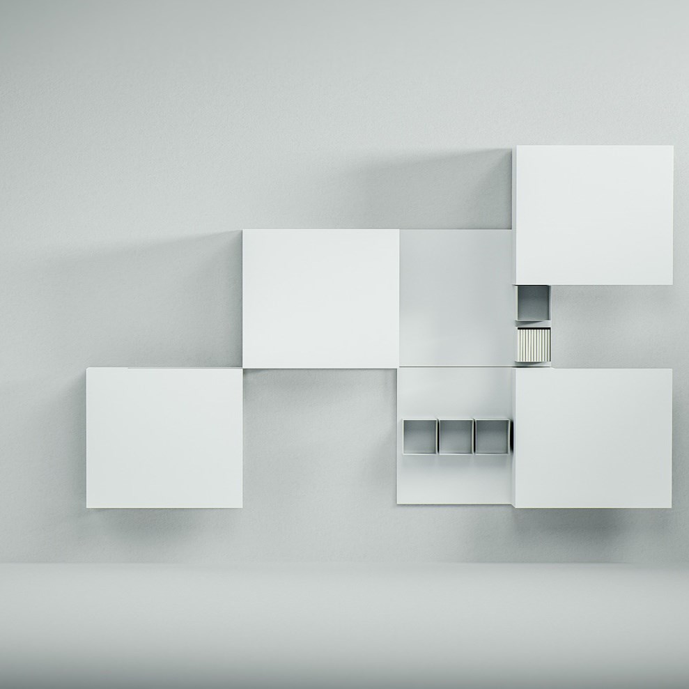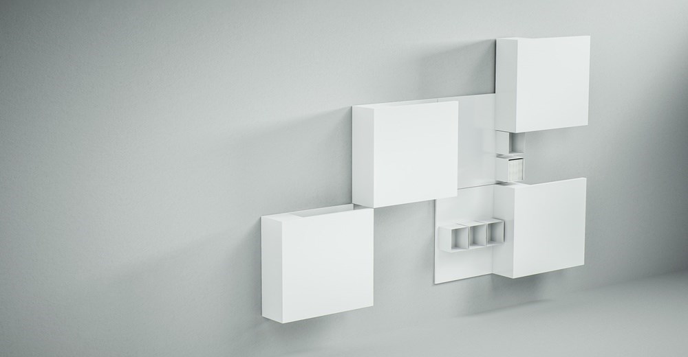 Sağa, sola, yukarı veya aşağı doğru kaydırılabilen sürgülü kapılı, modüler saklama ünitesi.