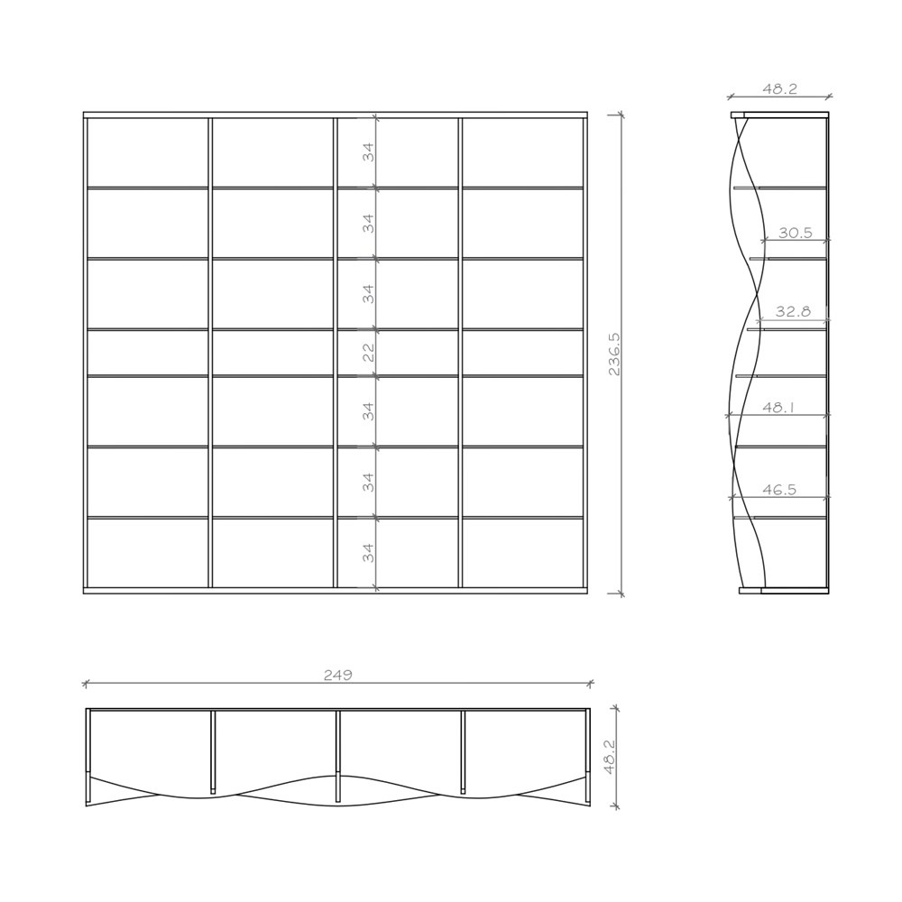 • Tasarım, 1 cm kalınlığındaki MDF ahşap üzerine lake boyalı raf ve dikmelerin birbirlerine geçme sistemiyle bir araya getirilmesiyle oluşturulmuştur.