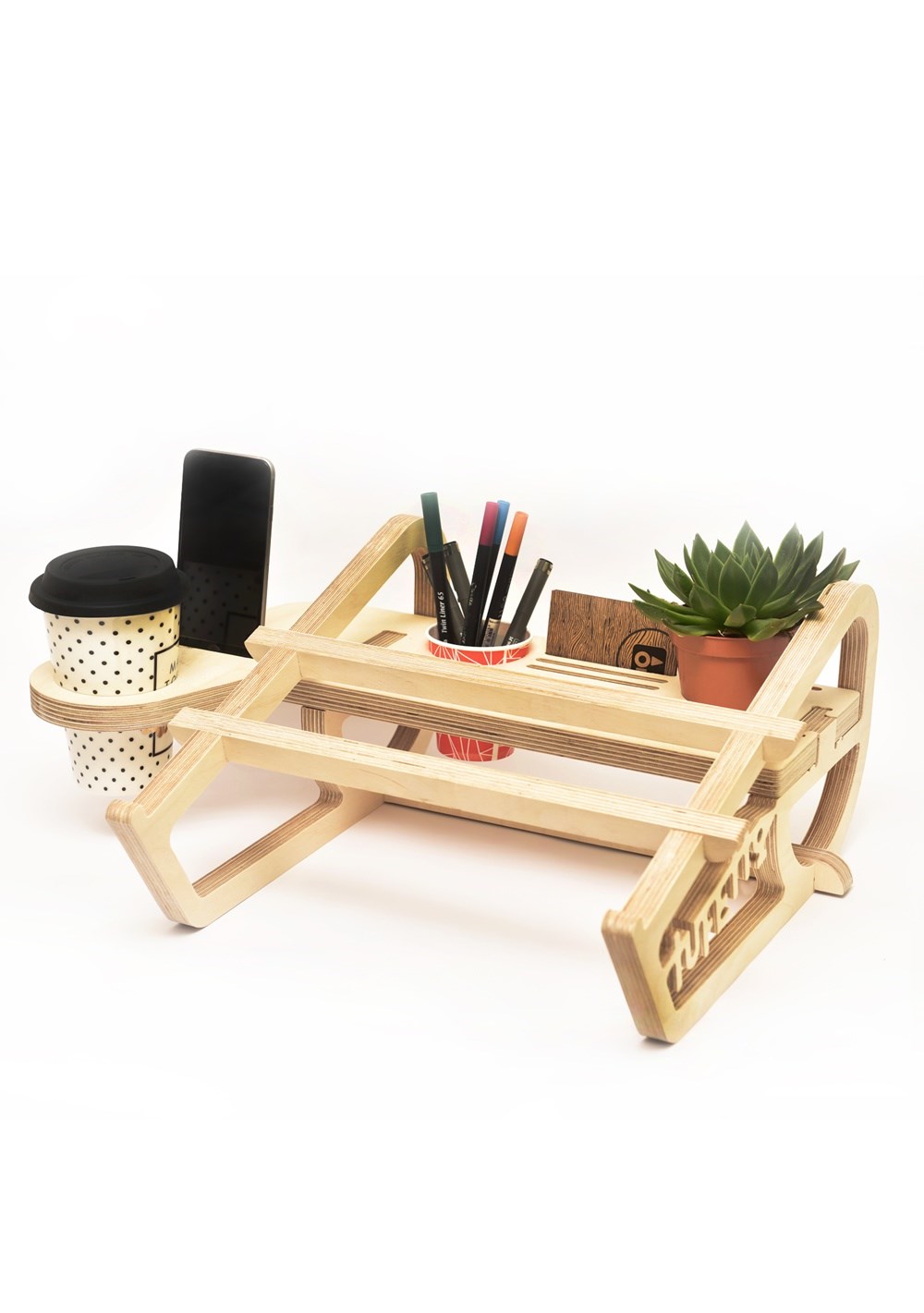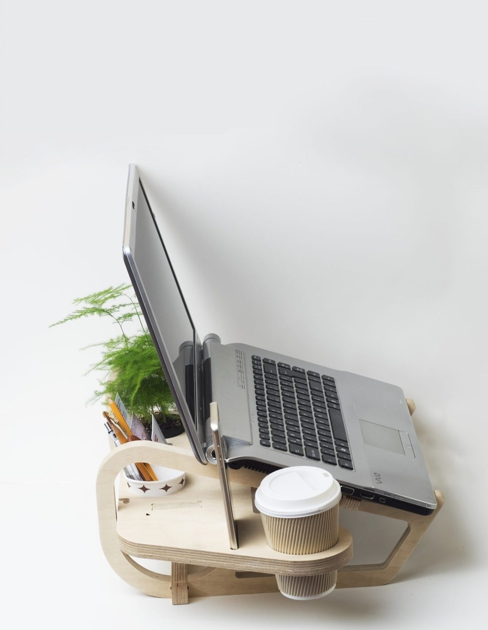 • Wocoo’ya laptopu yükseltmek dışında farklı işlevler de ekledik. Solda kahvenizi koyabileceğiniz bir alan ve telefonunuzu şarj edebileceğiniz bir yuva var. Arka bölümde kalemliğinizi, saksı çiçeğinizi ve kartvizitlerinizi koyabileceğiniz alanlar mevcuttur.