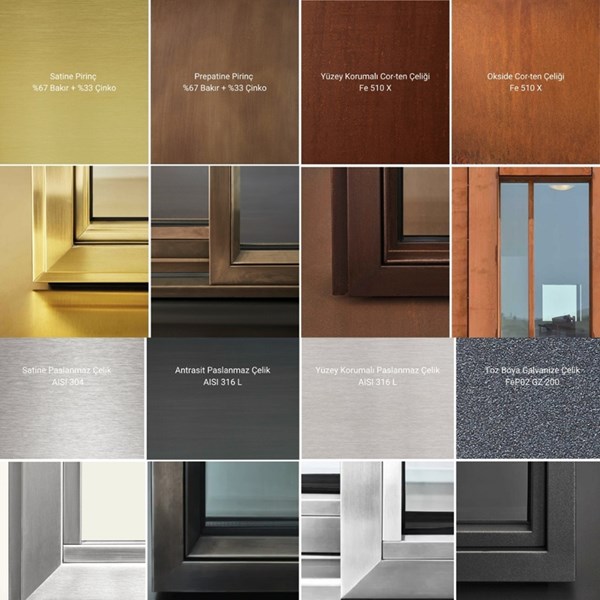 - Pirinç (CuZn33 / CW506L): Saten veya patinalı yüzey seçenekleriyle, soğuk haddelenmiş ve el işçiliğiyle tamamlanan sıcak ve karakterli bir mimari etki sunar.