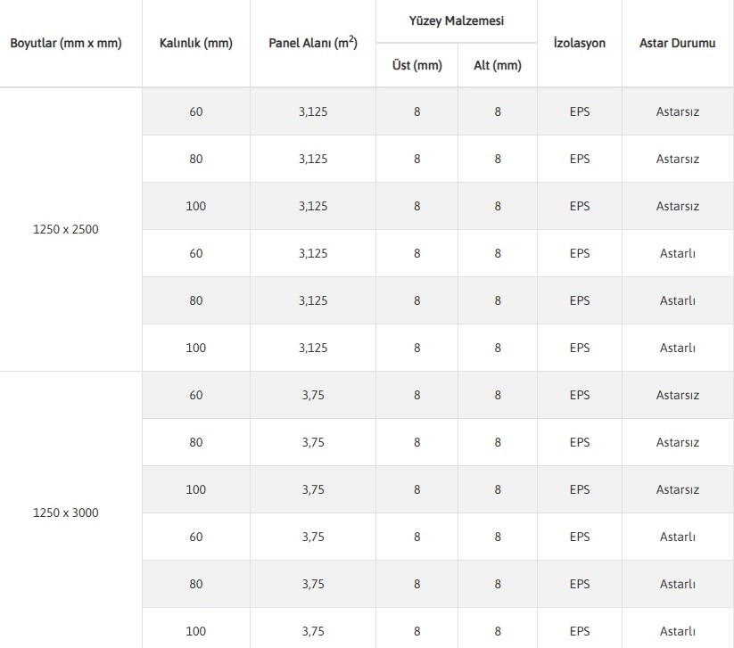 • Panel boyutları 1250 x 2500 mm ve 1250 x 3000 mm olan HEKİMPAN’ın standart panel kalınlıkları ise 60 mm, 80 mm ve 100 mm’dir.