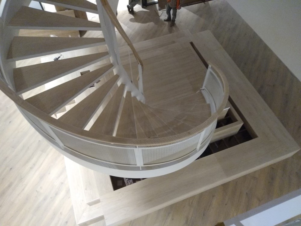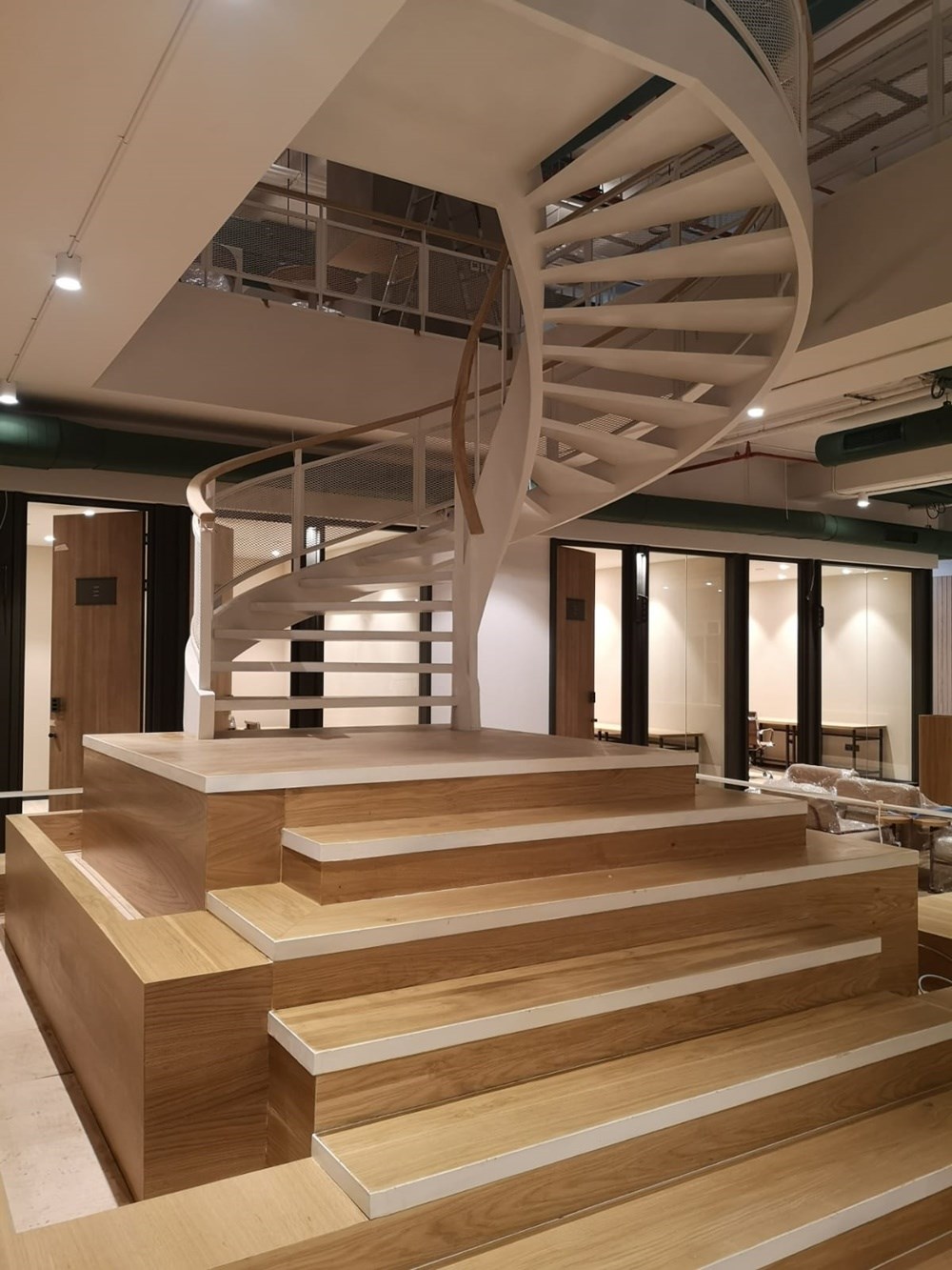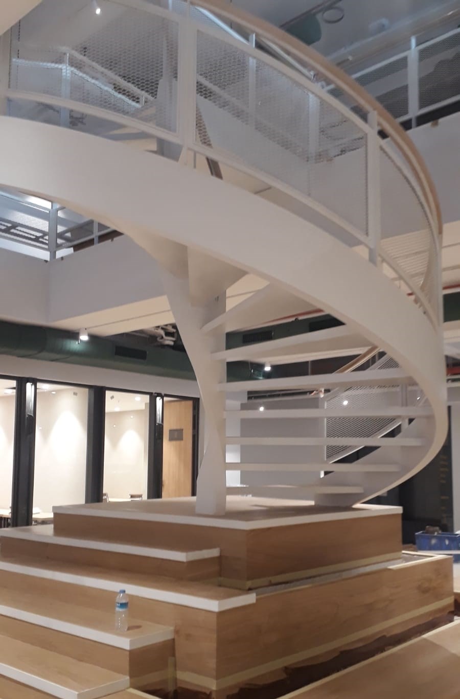 Görsel Örnek1: St 37, 30 mm sactan taşıyıcı kirişler yapılmış, korkuluk 304 kalite paslanmaz lamadan imal edilmiştir. Ahşap giydirme ile basamaklarda kusursuz bir görüntü elde edilmiş, salyangoz merdivenlere eşsiz uygulama örneğidir.