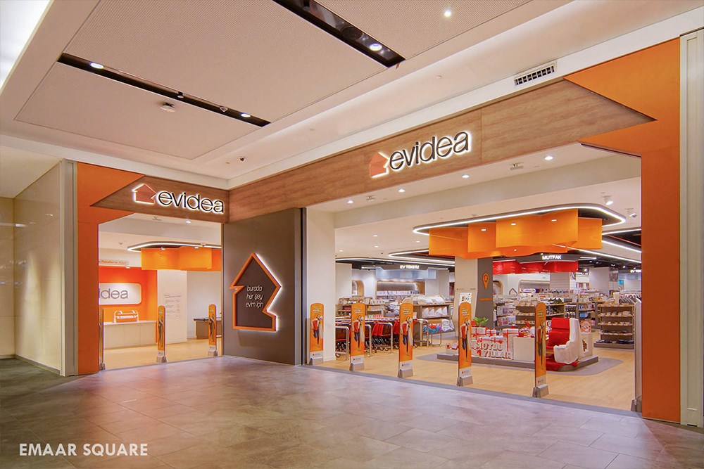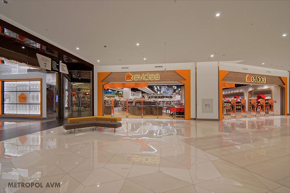Ev dekorasyonu ve ev ürünleri konularında perakende mağazacılık sektörüne giriş yapan Evidea markasına ait zincir mağaza tasarımları projesidir. Ürün gamı itibarı ile hedef kitlesini bayan tüketicilerin oluşturması, tasarımın ana verilerinden biridir. Bu doğrultuda ağırlıklı olarak bayanlara hitap eden, renk kullanımının öne çıkartıldığı, eğrisel ve kıvrımlı formların mimari çizgileri oluşturduğu bir tasarım dili oluşturulmuştur. Girişten itibaren başlayarak, mağazanın tümüne yayılan ve her biri ayrı kategorileri temsil eden bulut formlu ögeler, farklı renklerdeki kumaş kullanımı ve eğrisel formları ile dikkat çeker. Bu ögeler sayesinde hem mağazanın büyüklüğü ve ürün zenginliği müşterilere hissettirilirken, hem de kategori geçişleri tariflenir. İlave olarak bahsedilen eğrisel formlu biçim dili, aydınlatma armatürlerindeki kullanımı ile pekiştirilmiş ve bu konsept vurgusu öne çıkartılmıştır. Ayrıca mağaza cephesinde yer alan giriş takları da firma logosundan esinlenerek yeniden yorumlanmış ve ev formunu temsil etmesi hedeflenmiştir.