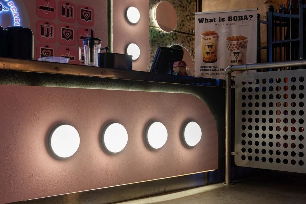 Belirlenen bu sınırlı ve dar alanda, mimarlar tarafından maksimum verim ve kullanım kolaylığı için lineer bir çalışma alanı tasarlanmıştır. AVM içerisinde ve uzak bir köşede bulunan bu satış alanının dikkat çekici ve görünür olması tasarıma yön vermiştir. Renkler, form ve dokular markadan ve “bubble tea”nin kendisinden ilham alınmış; köşeler yuvarlanmış, dairesel ve düz yüzeyler birlikte kullanılmış, balon şeklinde aydınlatma birimleri tasarlanmıştır. K-Pop kültüründen esinlenilerek siyah ve pembe renkler seçilmiştir.