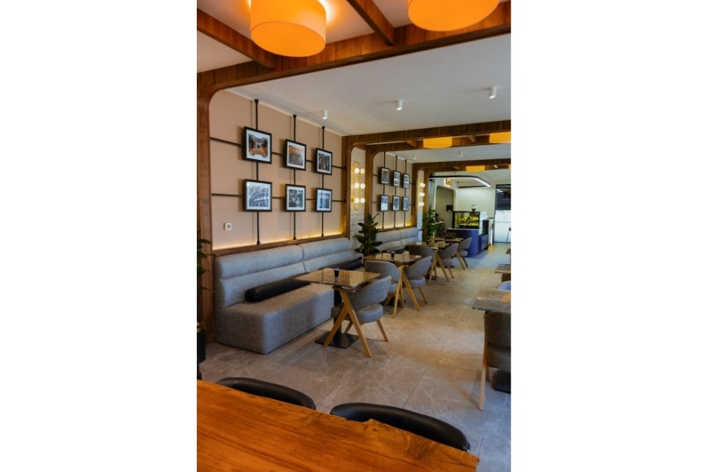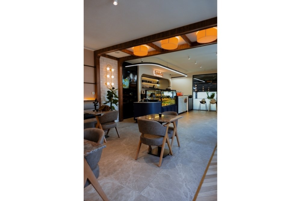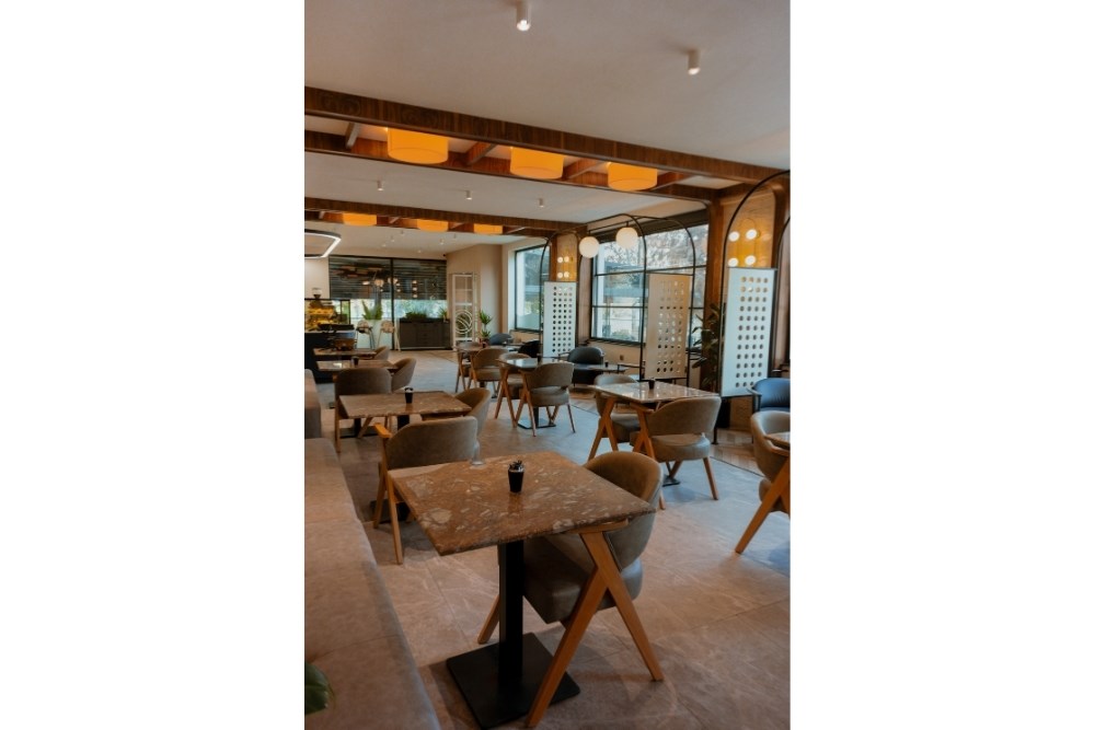 Bovindo Patisserie, Kayseri’nin zarafet ve modernlik anlayışını yansıtan özgün bir iç mimari tasarıma sahiptir. Mekanın sıcak atmosferi, ahşap detaylarla desteklenen doğal dokular ve şık aydınlatma elemanlarıyla harmanlanmıştır. Geniş cam yüzeyler, doğal ışığı içeri davet ederken mekana ferahlık kazandırır. Bölücü paneller ve özenle seçilmiş oturma grupları, hem mahremiyet hem de konfor sağlayarak kullanıcı deneyimini ön planda tutar. Sıcak tonlu aydınlatmalar, yumuşak ve davetkar bir ambiyans yaratırken, modern mobilyalar ve minimalist dekor unsurları mekana sofistike bir kimlik kazandırır. Bovindo, misafirlerine sadece tatlı lezzetler değil, aynı zamanda estetik ve huzur dolu bir deneyim hedeflemektedir.