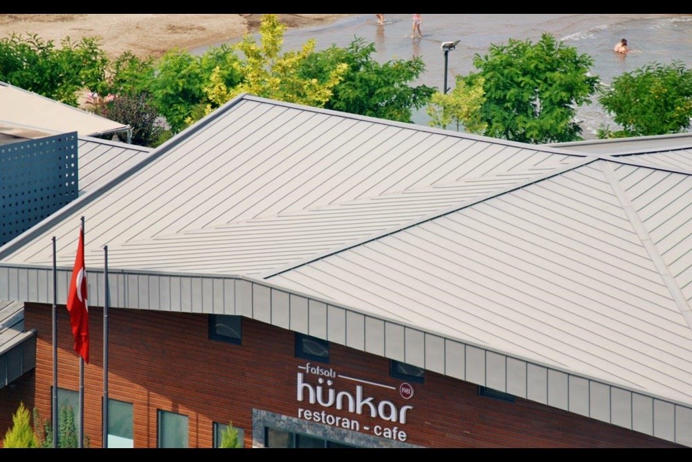 Fatsalı Hünkar Restoran projesinde VMZINC Titanyum Çinko QUARTZ-ZINC® tercih edilmesinin en büyük nedeni, sert iklim koşullarına ve deniz kenarı olmasının vereceği tüm negatif etkilere karşı son derece dayanıklı olmasıdır. VMZINC titanyum çinko minimum %5 eğimli çatılarda ve cephelerde tüm yüzey alanını kaplamak için kullanılabileceği gibi, farklı malzemelerin kullanıldığı çatı ve cephelerde kısmen veya diğer malzemeler ile mümkün olmayan detayların çözümü için de uygulanabilir. Çatılarda mahya, dere, oluk, çatı penceresi, güvercinlik, baca dibi gibi aksesuarlarda esnekliği ve bakım gerektirmeyen doğal yapısı sayesinde güvenle kullanılabilir. Cephelerde kat silmesi, denizlik, söve, kalkan duvarlarda parapet ve harpuşta kaplamalarında; vida, perçin veya silikonun kullanılmadığı birleşimler ile estetik görünümü sebebiyle tercih edilmektedir.