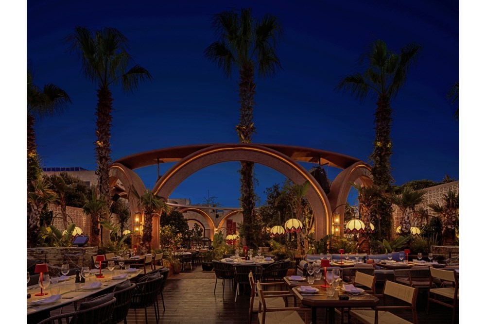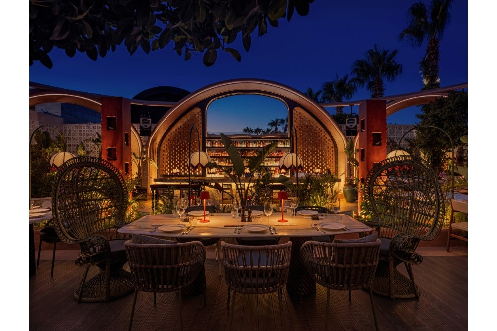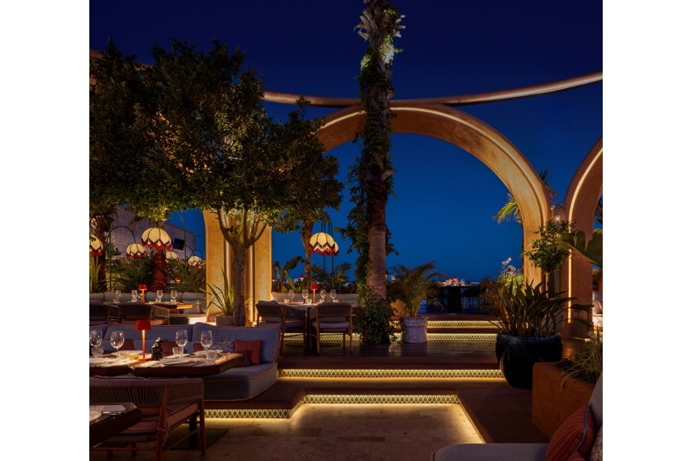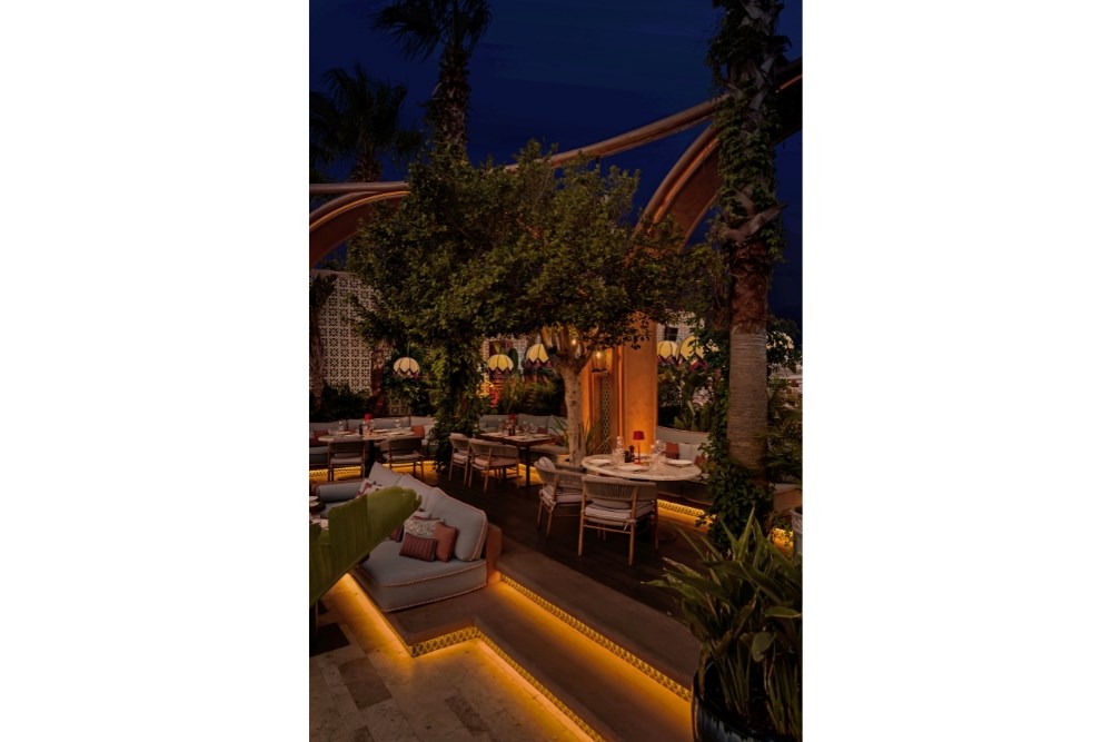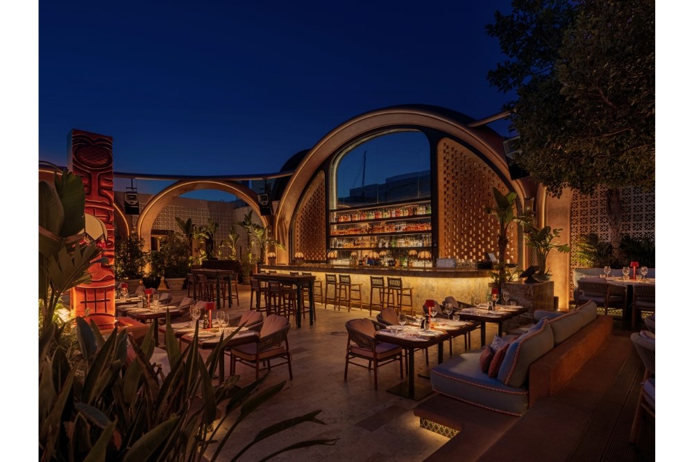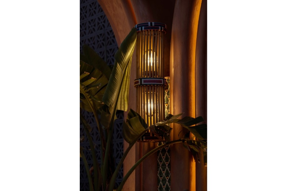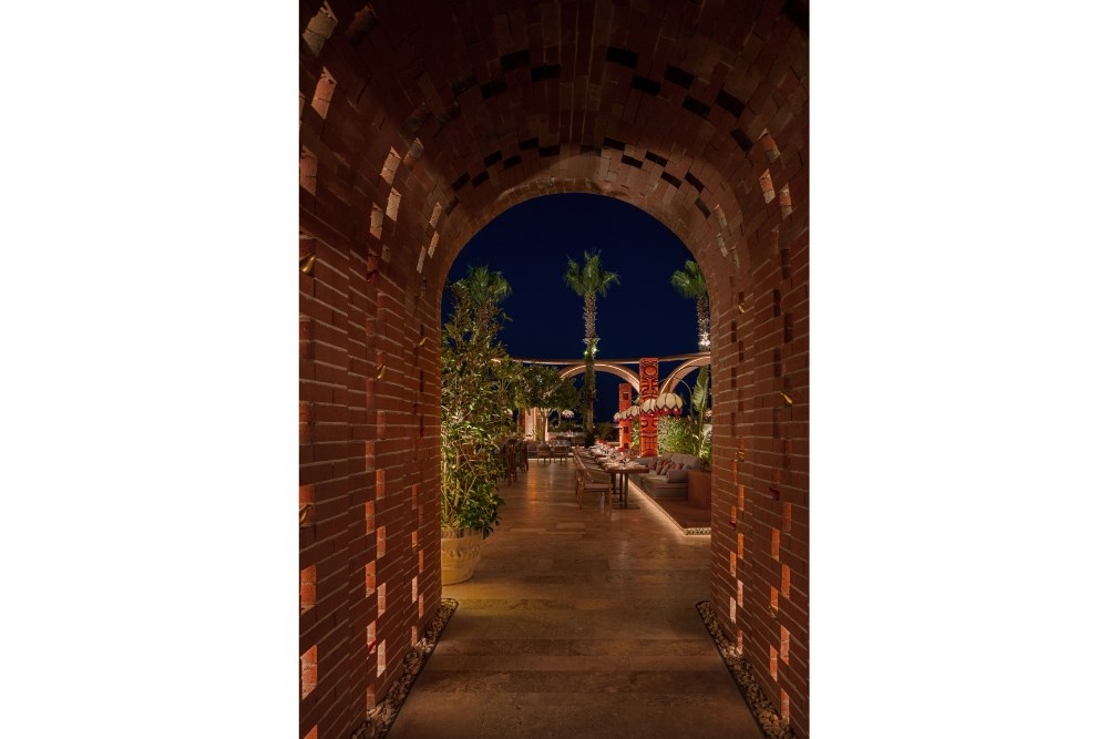 Fenix'in ikonlaşmış tasarım öğelerinden olan Korint başlıklı sütunlar, bir üst seviyeye taşınarak mekânı sarmalayan kemerlerden oluşan yarı geçirgen bir kütleye dönüştürüldü. Mekândaki eğlence merkezini tanımlayan bu kemerler, oluşturduğu duvar yüzeyleriyle aynı zamanda içki barı, sushi barı ve giriş koridoru gibi hacimlere hayat veriyor. Barın arkasında kalan ve kemerlerin formunu takip eden yarım daire şeklindeki ikonik ayna ve etrafındaki tuğla örgü, yine Fenix'in kültleşmiş tasarım öğelerine göndermeler yapıyor. Barın sağ ve sol tarafına şaşırtmalı bir biçimde döşenen tuğlaların arasına yerleştirilmiş olan kuş figürleri ise yaz aylarının ferahlığını ve markanın kimliğini temsil ediyor.
