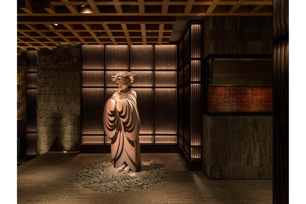 Stüdyonun, Zen bahçeleri ve Sakura dallarından ilham alarak marka için tasarladığı desene projenin önemli noktalarında farklı form ve renklerde yer veriliyor. Giriş alanında, dramatik bir giriş etkisi yaratmak üzere tasarlanan dairesel koridorun yapımında, ahşap kakma el işçiliği ile ön kalıp çalışması oluşturulan rölyef yüzeyler, prekast döküm yöntemi ile üretilerek, paslı bir yüzey bitişi için içeriğinde metal partikülleri barındıran bir boya ile final yüzey oluşturuluyor. Mekânın atmosferine uygun olarak el yapımı Japon kağıtlar üzerine Asya felsefesinde gücü ve başarıyı temsil eden Koi balığı desenleri ile özel olarak tasarlanan kağıtlar, restoranın tavan ve düşey yüzeylerinde, tasarım karakterini yansıtan unsurlar arasında yer alıyor.