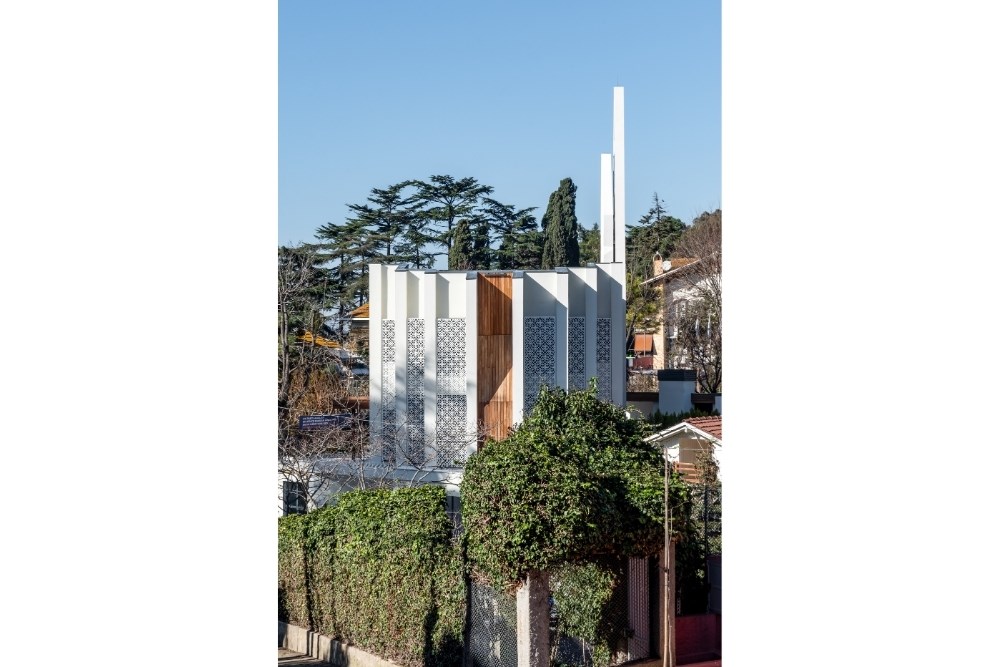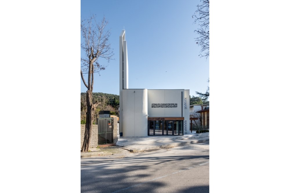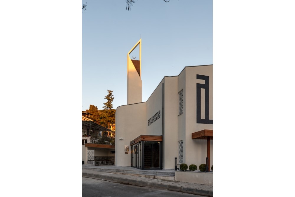 Ana cami kütlesini tamamlayan iki öge daha vardır, birincisi asmakata ulaşımı sağlayan ve eğrisel bir duvarlar çevrelenen merdiven kovası; diğeri de yapı kompozisyonundaki tek dikey öge olan minarenin kendisidir. Günümüzde minareler, işlevden çok simgesel göstergelere indirgenmiş; metal kaplı kubbeler ile birlikte camilerin dini simgeselliğini hem tanımlayan hem de tamamlayan ögelere haline gelmiştir. Burada, herhangi bir kubbenin kullanılmadığı haliyle, minare tek başına yapının bu sembolizm yükünü sırtında taşır.