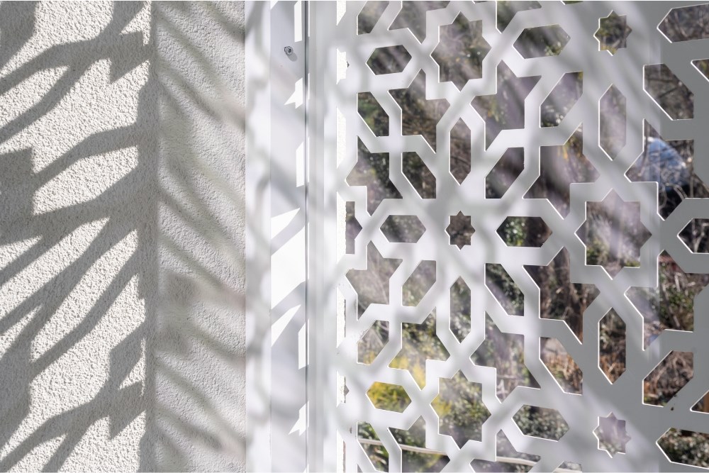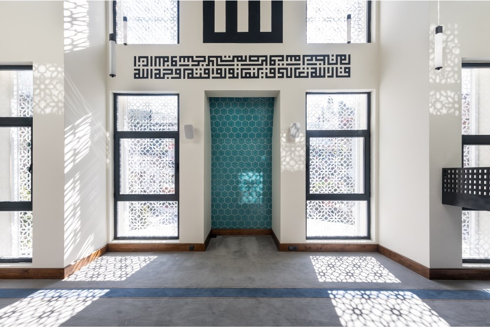 Parçalı duvarlar arasına yerleştirilen dikey doğramalar, hem kütleyi hafifletmekte, hem de gün boyunca iç mekâna doğal ışığın sızmasını sağlamaktadır. Böylece mihrap duvarı, mihrap nişi dışında tamamen transparan bir hâle bürünmekte, güneşin hareketi iç mekanda hissedilmektedir. Bu durumun yapı içinde özellikle yaz günlerinde termal yük yaratmaması için, mihrap doğramalarının önüne metal güneş kırıcılar yerleştirilmiştir. Geleneksel desenlerden esinlenen güneş kırıcıların iç mekâna düşen gölgesi gün boyunca değişmekte ve her namaz vaktinde içeriye bıraktığı izler ile yapın dinamik bir tezyine sahip olmaktadır.