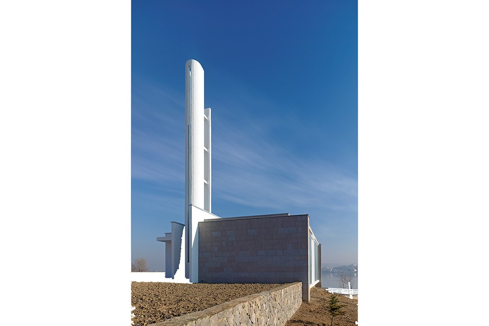 Dış avlu tarafında minareyle bütünleşen bir duvar-yapı olarak algılanan Cami kitlesi, bunun arkasında taş kaplı iki yan cephe ve cam kaplı mihrap cephesinin dışta vurgulanması ile oluşan dikdörtgen prizma bir şeklindedir. Mihrap duvarı eğim yönünde yerden koparılarak ayrıştırılmıştır. Bu noktada her iki yanda kaba taş duvarlar ile arazi kademeleri mimari olarak ele alınmıştır.