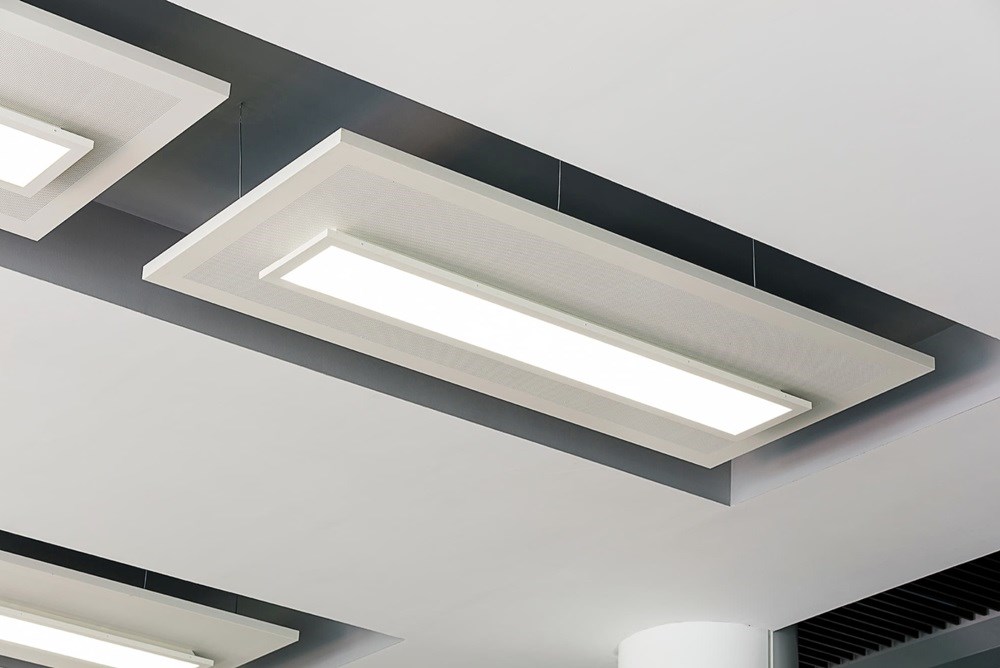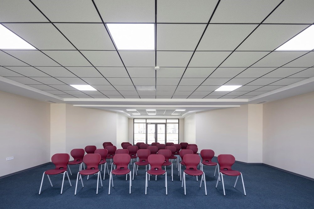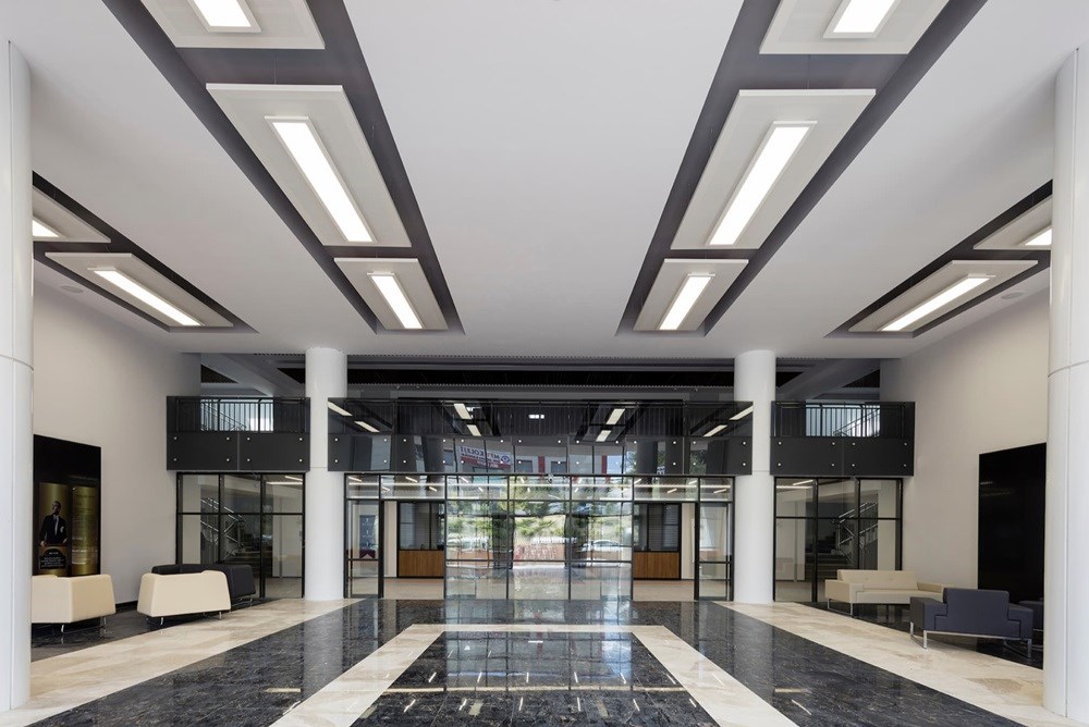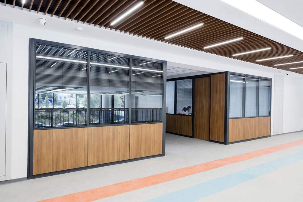 DM-106 modüler bölme duvar sistemi, okulun farklı kullanım ihtiyaçlarına göre alanların hızlı ve esnek biçimde düzenlenmesine imkân tanımaktadır. Wooden Baffle LED aydınlatma ise koridor ve ortak alanlarda bir ritim yaratırken, homojen ışık dağılımıyla mekânın ferahlığını artırmıştır. Bu çözümler, eğitim alanlarının görsel kimliğini güçlendirmiş ve kullanıcı deneyimini üst seviyeye taşımıştır.
