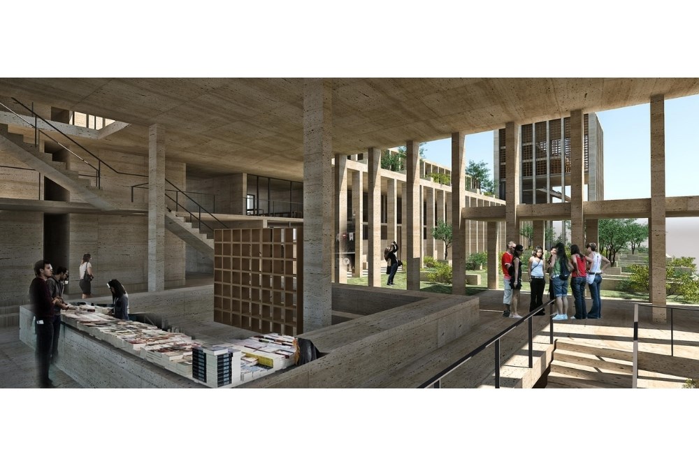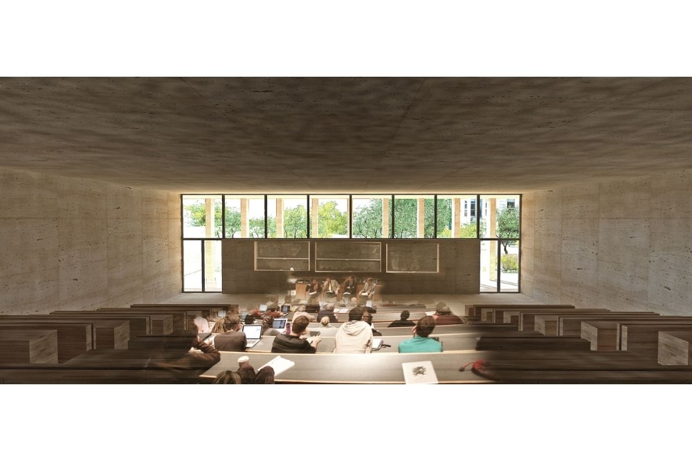 Amfiler, derslikler, öğretim ve araştırma görevlileri odaları ile bahçeler vadi bitimindeki İTÜ Makina Fakültesi ile Mimarlık Fakültesi ile görsel iletişim kurarken, kule üzerindeki kütüphane ve konferans salonu bir kültür vadisi olan Maçka Vadisi'ne katılır. Yapı, yalnızca derse girip çıkılan bina değil, sosyal etkileşimere olanak veren medrese avlu ve revak hacimlerini örnek alır. Halihazırda kampus kent içine yayılmış binalardan oluştuğundan, medrese avlusu kentsel bir ölçek kazanır ve İTÜ Maçka'nın eski binaları arasına sızan bir merkez olarak açılmayı ve kentsel bir toplanma alanı yaratarak Maçka vadisini karşılamayı amaçlar. Tüm birimler vadiyi kucaklar.