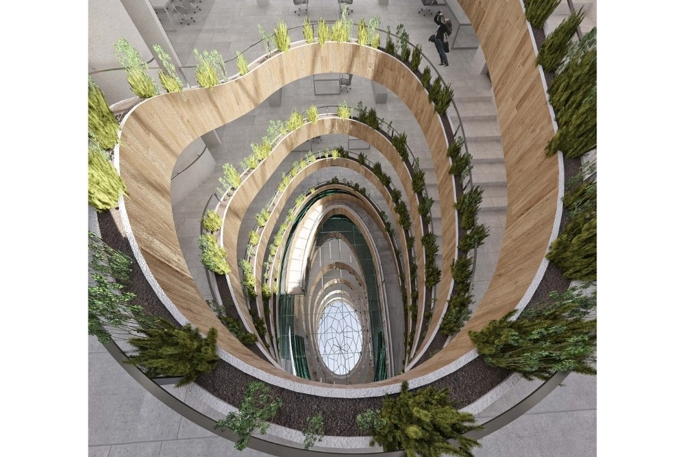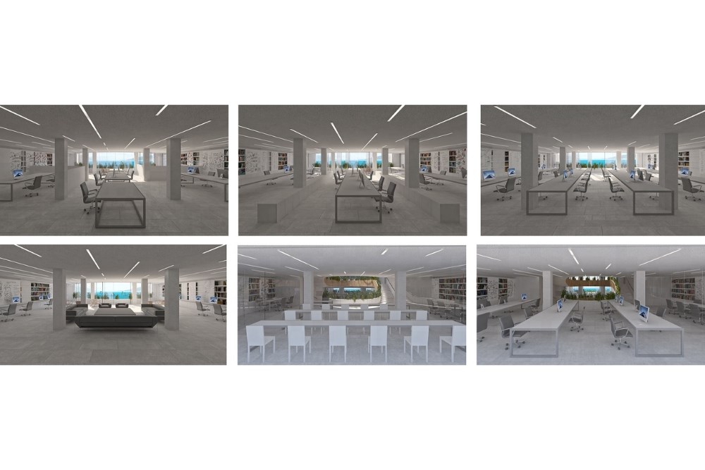 Seyir sarmalı, bütün katların etkileşimini sağlayan bir strüktürdür. Seyir sarmalı sayesinde etkileşim yalnızca ofisle etkileşim değil, kentle etkileşim alanını oluşturur. Ofis mekanları sarmal ve cephe arasında tek mekan olarak kurgulanmıştır. Farklı yoğunluklardaki tefriş çözümleri her zaman deniz bakışına izin verecek doğrultuda yerleştirilmiştir. Ofis alanlarını tanımlayan sınırlar sarmal ile ön cephede katmanlaşırken güneş kırıcı çizgisi, peyzaj çizgisi ve tamamen açılan cephe olarak tanımlanmıştır. Yan yüzeyler ise ofisin tüm kapalı hacim ihtiyaçlarına cevap verecek olan kitaplık, projeksiyon perdeleri ve yazılabilir kayar yüzeyler olarak tasarlanmıştır. Deniz cephesi ve kapalı yarı yüzeylerdeki lineer ve statik çizgiye karşı güneş kırıcı perdeler ve paneller ihtiyaca göre sürekli değişken ve dinamik bir yüzey oluşturur.