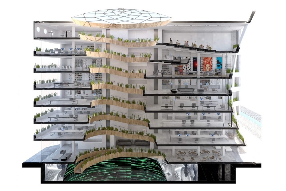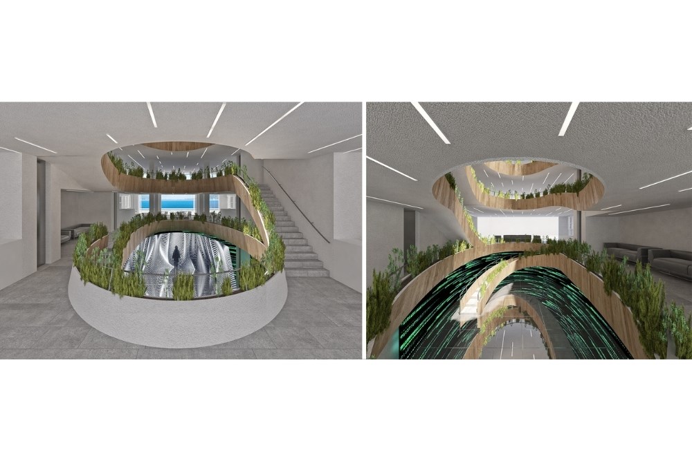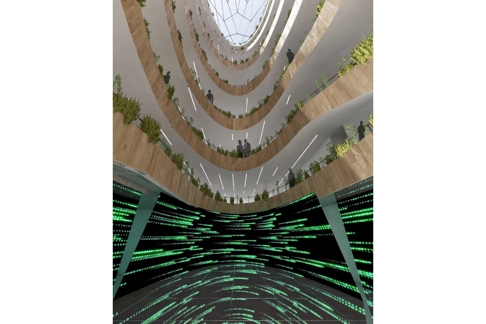 Tasarımda zemin altı kot, giriş katı ve dokuzuncu katlar kamusal etkinlik alanı olarak tasarlanmıştır ve ofisler bunların arasında yeralır. Bina, giriş katında yeme içme mekanları ile kullanıcıyı selamlar. Dijital deneyim merkezi sürprizli bir biçimde zemin altı kot açılır ve giriş kotundan aşağıdaki delikte kullanıcıları davet eder. VR deneyim merkezi bu boşluğu gerçek dünyadan donanımlarla koparırken dijital mekan geçidi projeksiyon yüzeyleri ile kullanıcıyı reel olarak gerçekten koparır. Tasarım, dijital performansların seyir sarmalı ile dokuz kat boyunca izlenebilmesini esas alır. Burada dijital deneyim, sanatçının belirlediği kadar, mekanın da kendini belirlediğidir.