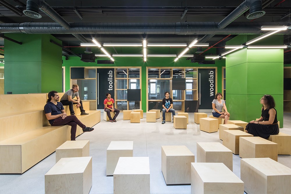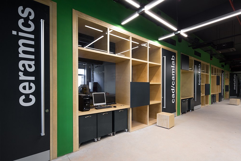FabLab kapsamında yer alan mekânlar, dört ana işlev grubu olarak düzenlenmiştir. Birinci bölüm, toz oluşumuna yol açan, metal, kereste veya seramik gibi malzemelerin ve CNC cihazının kullanıldığı alana hizmet etmektedir. İkinci bölüm, etkileşim atölyeleri olarak tanımlanan, prototip üretimi, üç boyutlu çıktı, deprem simülasyonu, fotoğraf çekimi, toplanma ve görüşme vb. faaliyetlere olanak tanımaktadır. Diğer iki bölüm ise genel üretim alanı ve ofisler olarak tanımlanmıştır.