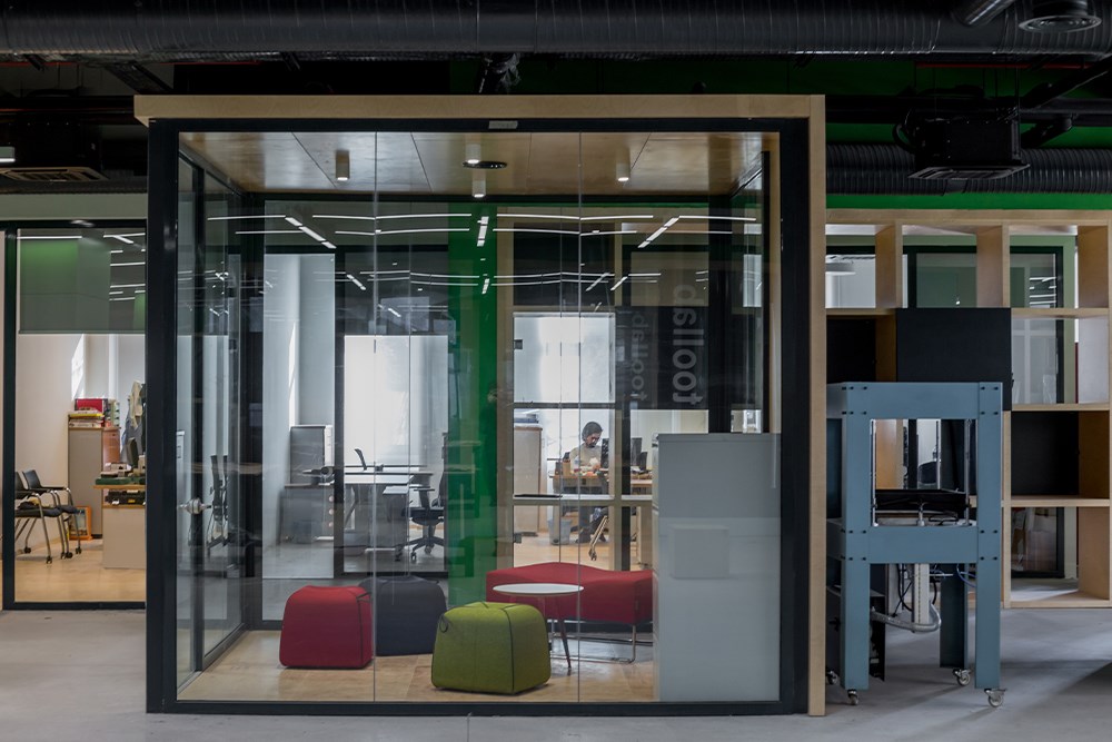 Hareketin ve fiziksel eylemin ön planda olduğu atölye tasarımında üretkenliği güçlendiren ve aynı zamanda sakinleştirici etkiye sahip yeşil renk projenin geneline hakim kılınmıştır. Bununla birlikte, atölye içerisinde oluşacak yüksek trafik göz önünde bulundurularak zeminlerinde yüzey sertleştirici beton kullanımı ile aynı zamanda maaliyet açısından da avantajlı bir ürün tercihi yapılmıştır.