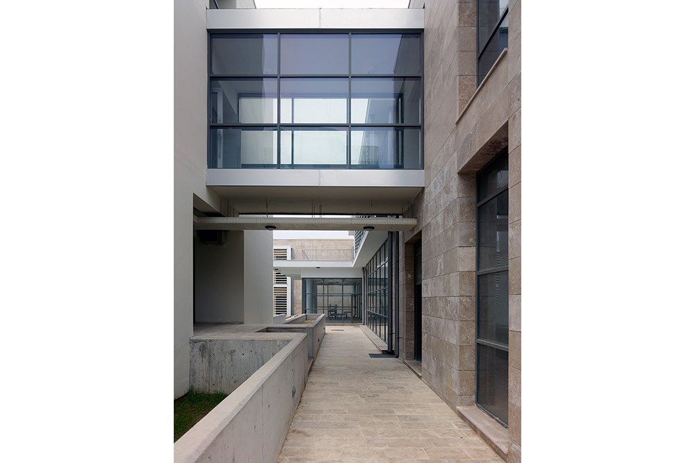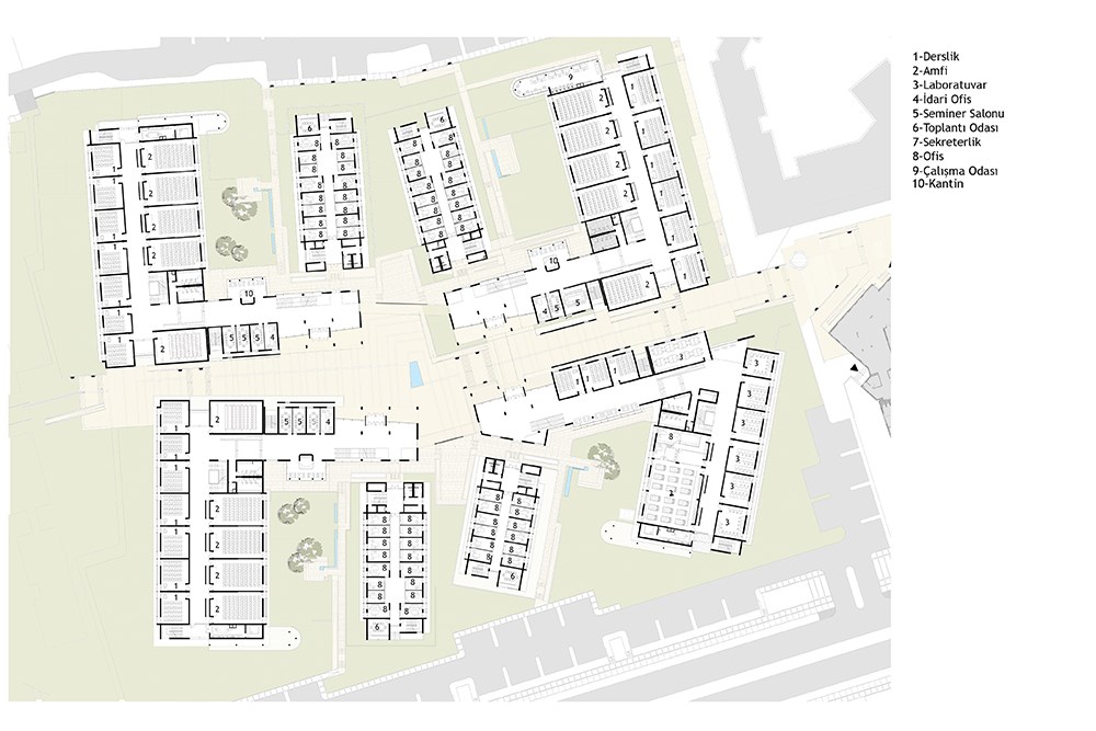 Bloklar, avluları manzaraya doğru açılacak şekilde, U şemada tasarlanmıştır. Ayrıca, yapıların yerleştiği alanların iki yöne eğimli doğal zeminleri dikkate alınarak, yapı kolları farklı açılarda yönlendirilmiş ve kademelendirilmiştir. Araziye uyumlu yapılaşma, hem dış hem de yapı içlerinde, dinamik kesitlerle farklılaşan bir mekan kalitesi sunar. Bu proje özelinde çevre ve topografya ilişkileri gözetilerek geliştirilen ve “yönlendirilmiş ızgara dokular” olarak tariflenebilecek plan şeması, Akdeniz iklimine uygun gölge dış alanlar- yollar, geçitler, avlular, meydanlar- oluşturulmasını sağlamıştır.