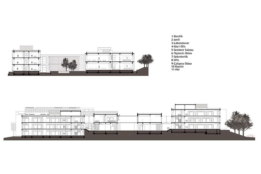 Traverten kaplı ofis kolları malzeme olarak andezit kaplı diğer iki kanattan ayrıştırılmıştır. Yapı saçakları ve döşemeleri bütün bloklarda beyaz betondur. Serbest duvarlarda ve yapıların oturduğu kademelerde ise brüt beton kullanılmıştır. Yapıların tüm açıklıkları için tasarlanan güneş kırıcı sistemler fonksiyonel özelliklerinin yanında mimari ve cephe dilinin önemli unsurları olmuşlardır. Özellikle derslik bloğunda doğal hava akımını sağlayacak hava bacaları tasarlanmış, mekanik havalandırma ve soğutma ihtiyacını en aza indirilebilmek hedeflenmiştir.