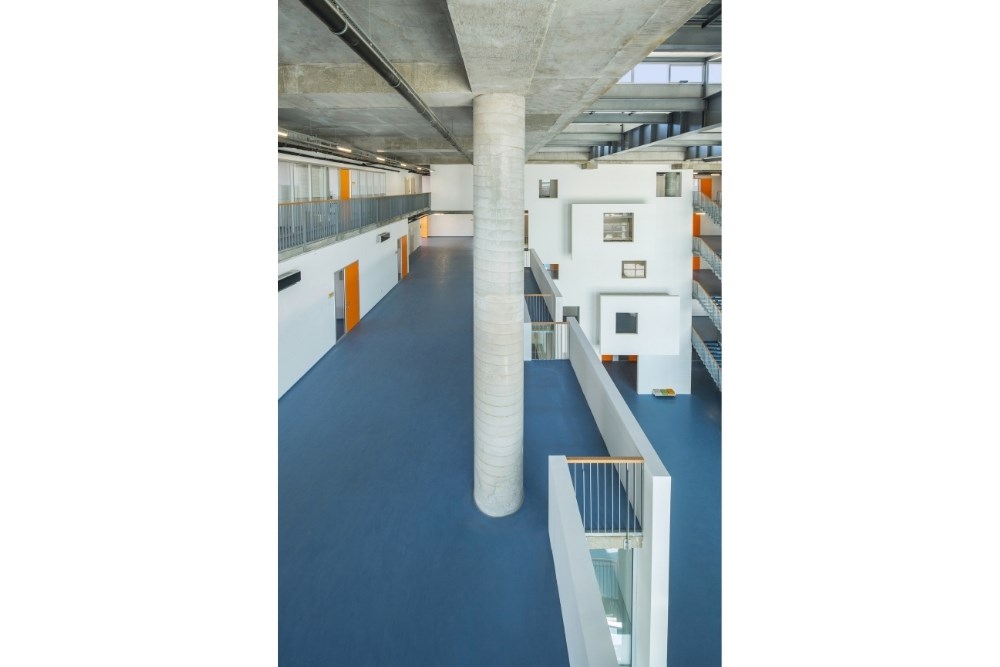 Teknik lise yapısının ruhuna uygun olarak malzeme çeşitliliği azaltılmış; yapım teknolojisinin görünür olması hedeflenmiştir. Zemin ve duvar kaplamaları kaldırılarak strüktür ile elektrik ve mekanik sistemler doğrudan mekâna yansıtılmıştır. Brüt beton yüzeylerde yüksek imalat kalitesi elde edebilmek amacıyla, daha önce O’live Park Evleri ve OİB MTAL projelerinde kullanılan kâğıt kalıp teknolojisi bu projede de uygulanmıştır. Kâğıt kalıpların dairesel formu, kolonların dairesel tasarlanmasını zorunlu kılmış; bu yaklaşım brüt beton yüzeylerde nitelikli bir sonuç üretmiştir.