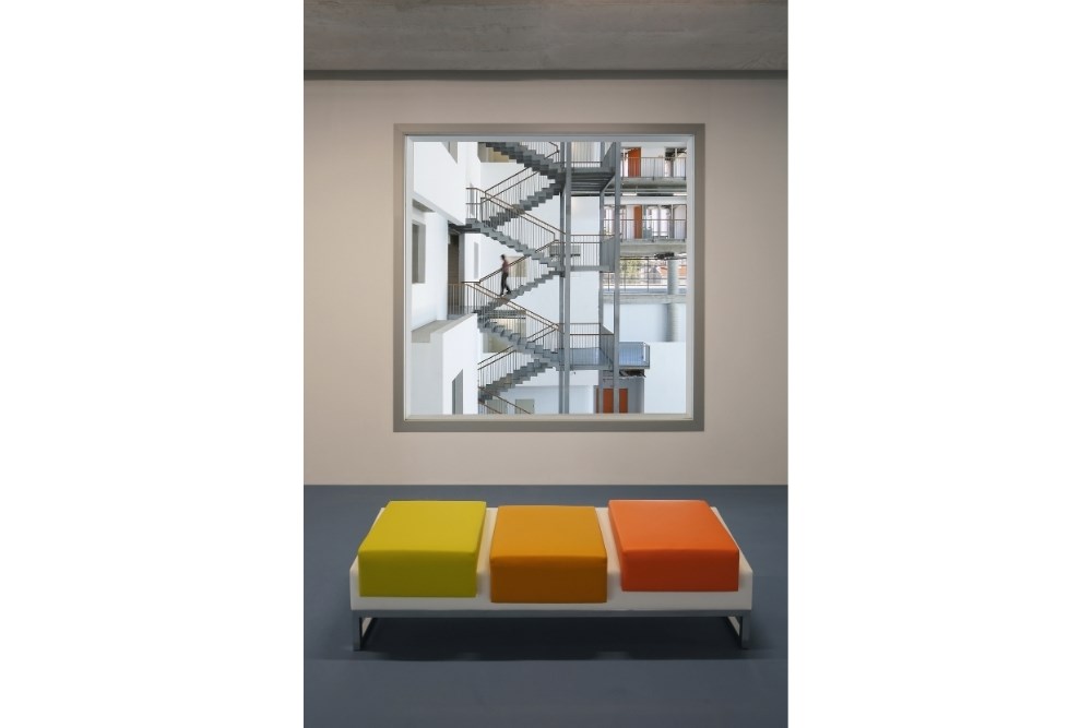 Dinamik ve zengin bir iç yaşantı hedefiyle, yüksek hacimli bir orta galeri etrafında sürekli görsel ilişki kuran mekân dizgesi oluşturulmuştur. Geçirgen duvar yüzeylerinin tanımladığı bu iç galeri, yapının kurumsal kimliğini yansıtan bir kamusal mekân niteliği taşırken; galeri çevresine dizilen birimler, büyük açıklıklar ve sosyal programlı nişlerle bu boşluğa dâhil edilmiştir.