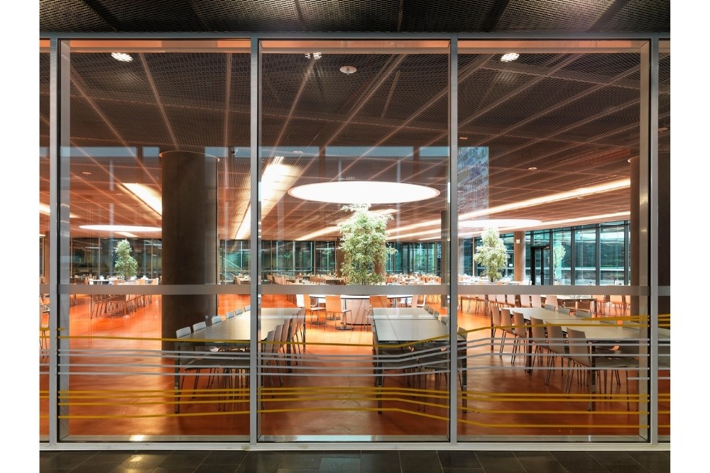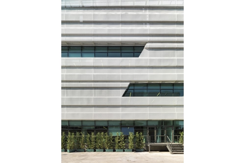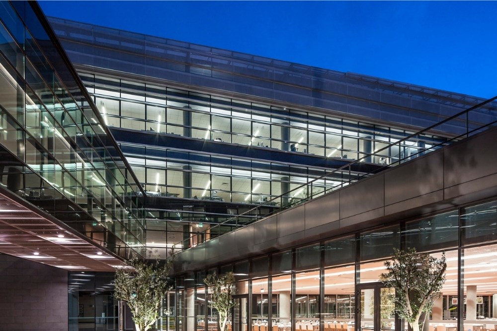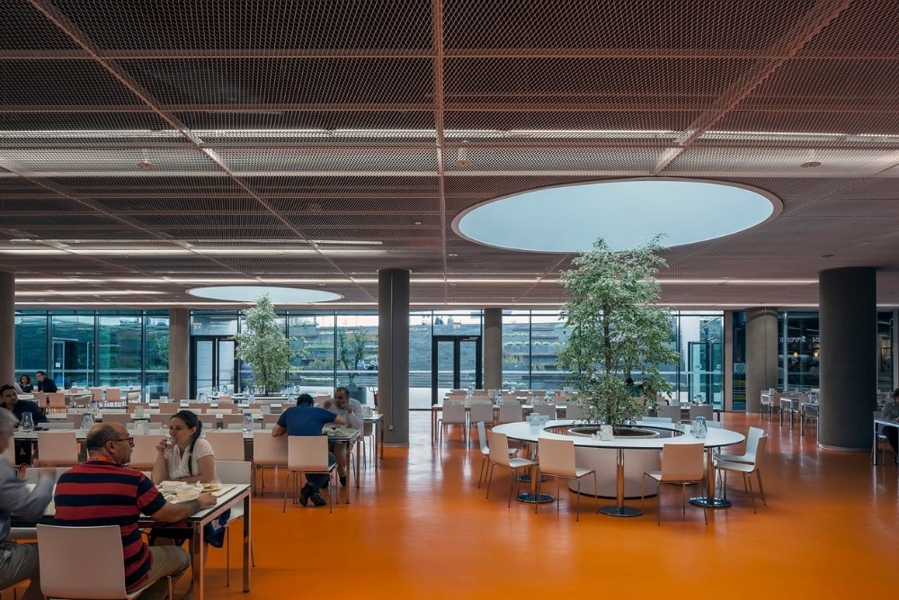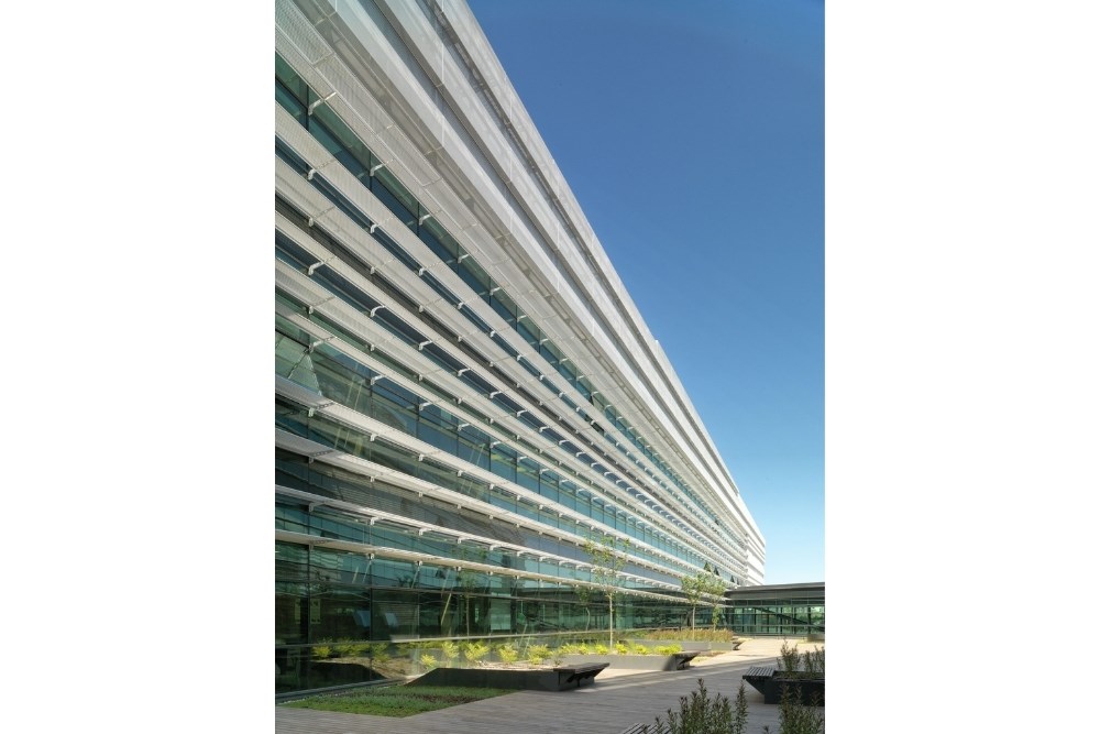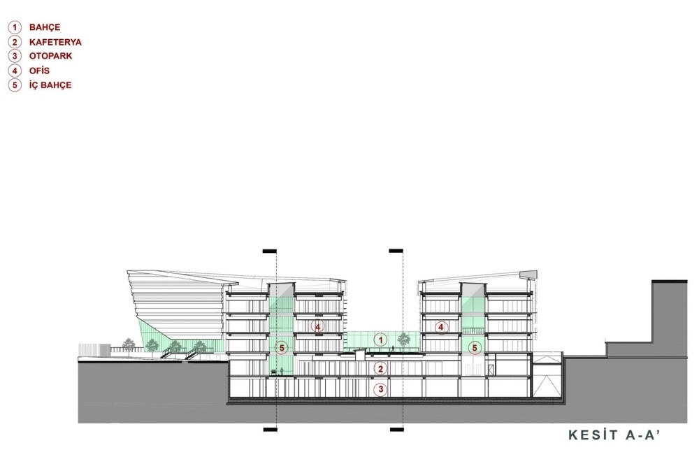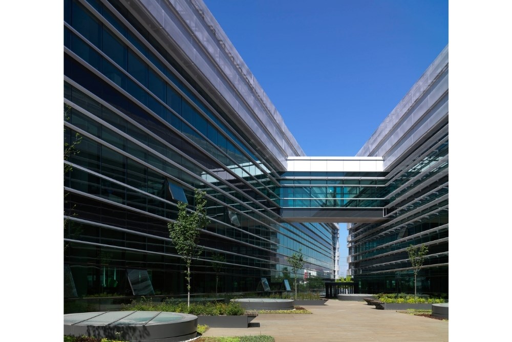 Paralel ofis blokları açılı bir şekilde avlu boyunca uzanır ve köprülerle bağlanırlar. İki kitlenin arasında yer alan kafeteryaya çökük bir avluya inilerek ulaşılır. Kafeteryanın çatısı aynı zamanda ofis zemin katlarından ulaşılabilen bir iç bahçe olarak kullanılır. Tasarım stüdyoları kompleksin girişten uzakta ve alt kotta yer alır. Bodrum kotunda konumlanan stüdyolar çatıdan doğal ışık alan mahrem mekanlardır. Yapıların dış çeperleri pasif güneş kontrolü sağlayan, farklı geçirgenlik değerlerine sahip perfore aluminyum levhalar ile kaplıdır. Ancak avluya bakan cephelerde bu kaplama tamamen kaldırılarak cephe şeffaflaşır ve avlu ile doğrudan görsel temas kurulur. Bu tavır mühendislik merkezinin aslında bir bütünün ortadan ikiye ayrılarak ortadaki avluyu oluşturduğunu ifade eder.