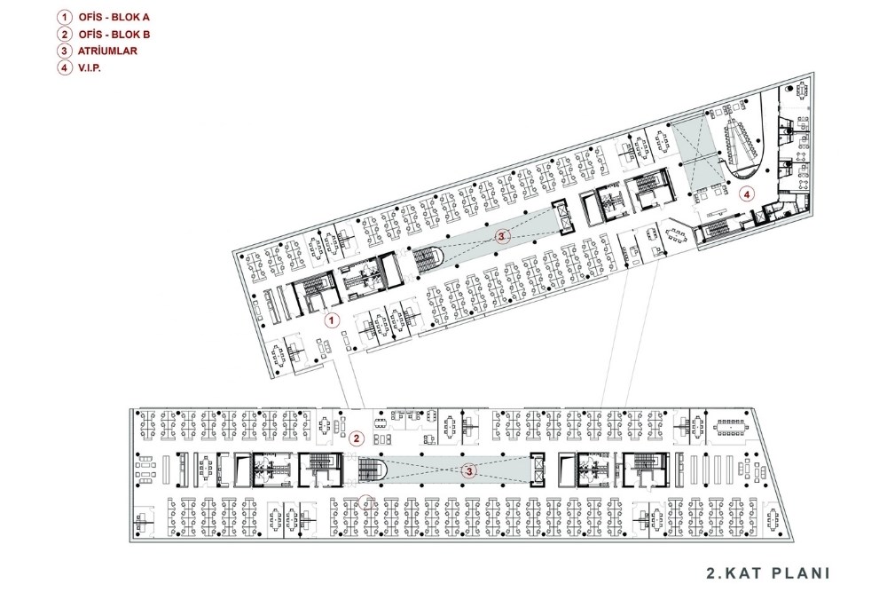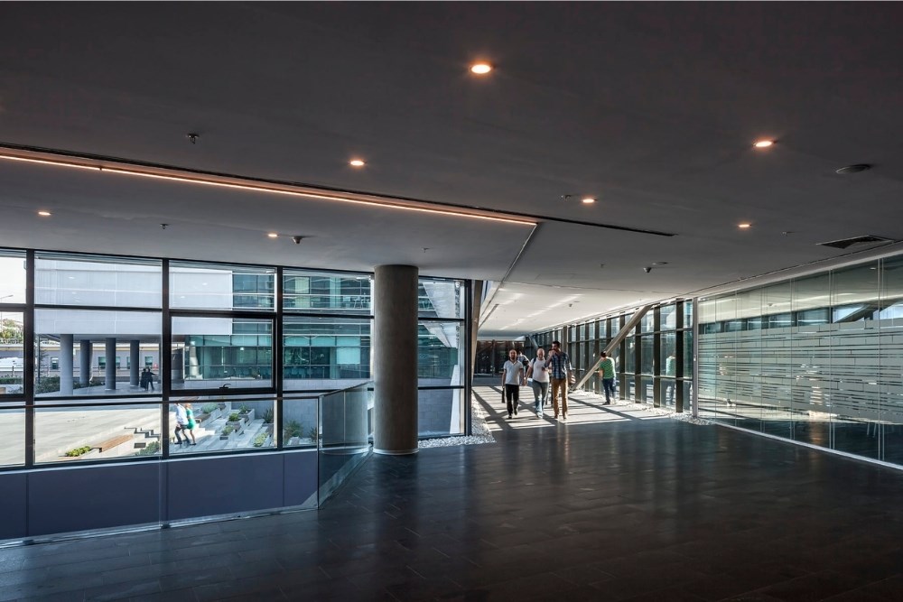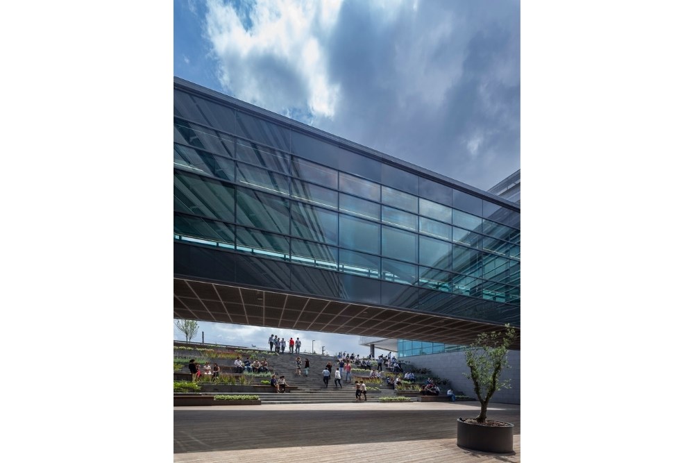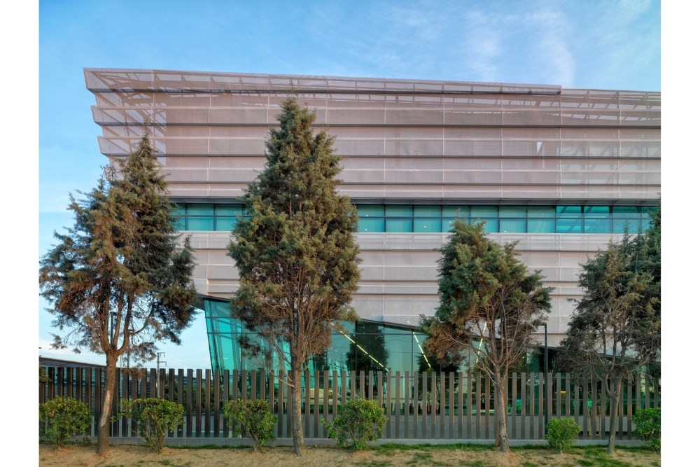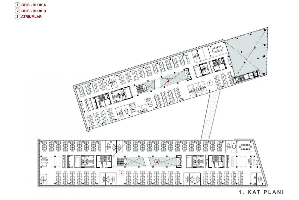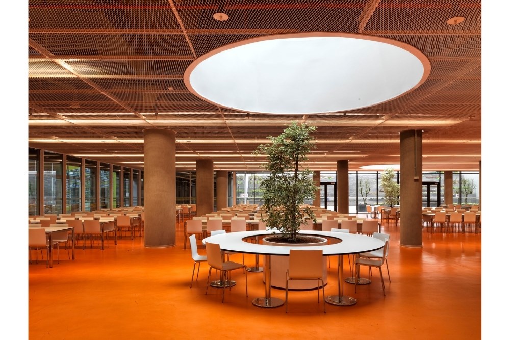Paralel ofis blokları açılı bir şekilde avlu boyunca uzanır ve köprülerle bağlanırlar. İki kitlenin arasında yer alan kafeteryaya çökük bir avluya inilerek ulaşılır. Kafeteryanın çatısı aynı zamanda ofis zemin katlarından ulaşılabilen bir iç bahçe olarak kullanılır. Tasarım stüdyoları kompleksin girişten uzakta ve alt kotta yer alır. Bodrum kotunda konumlanan stüdyolar çatıdan doğal ışık alan mahrem mekanlardır. Yapıların dış çeperleri pasif güneş kontrolü sağlayan, farklı geçirgenlik değerlerine sahip perfore aluminyum levhalar ile kaplıdır. Ancak avluya bakan cephelerde bu kaplama tamamen kaldırılarak cephe şeffaflaşır ve avlu ile doğrudan görsel temas kurulur. Bu tavır mühendislik merkezinin aslında bir bütünün ortadan ikiye ayrılarak ortadaki avluyu oluşturduğunu ifade eder.