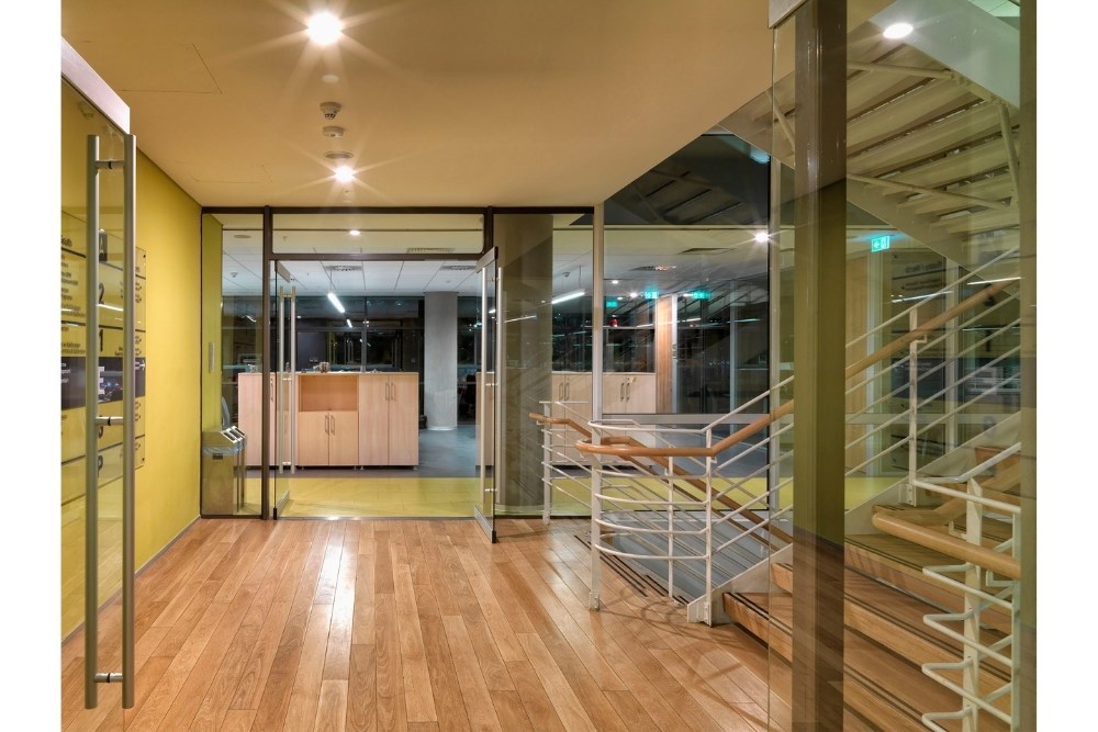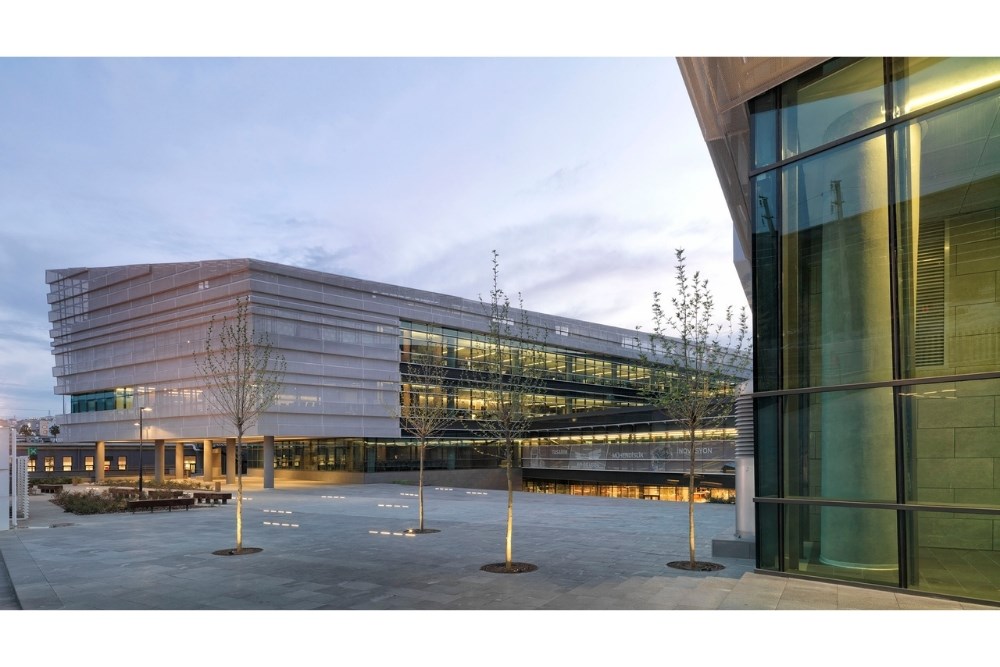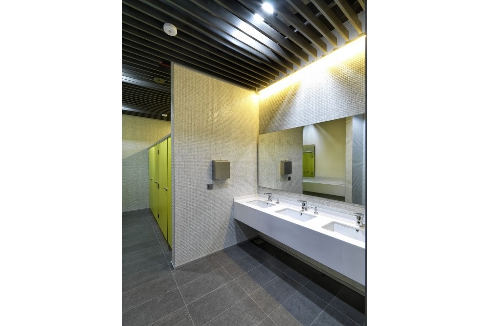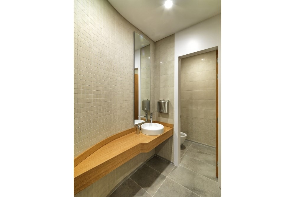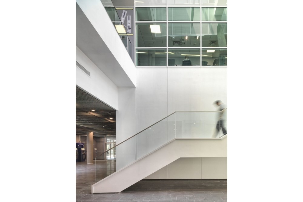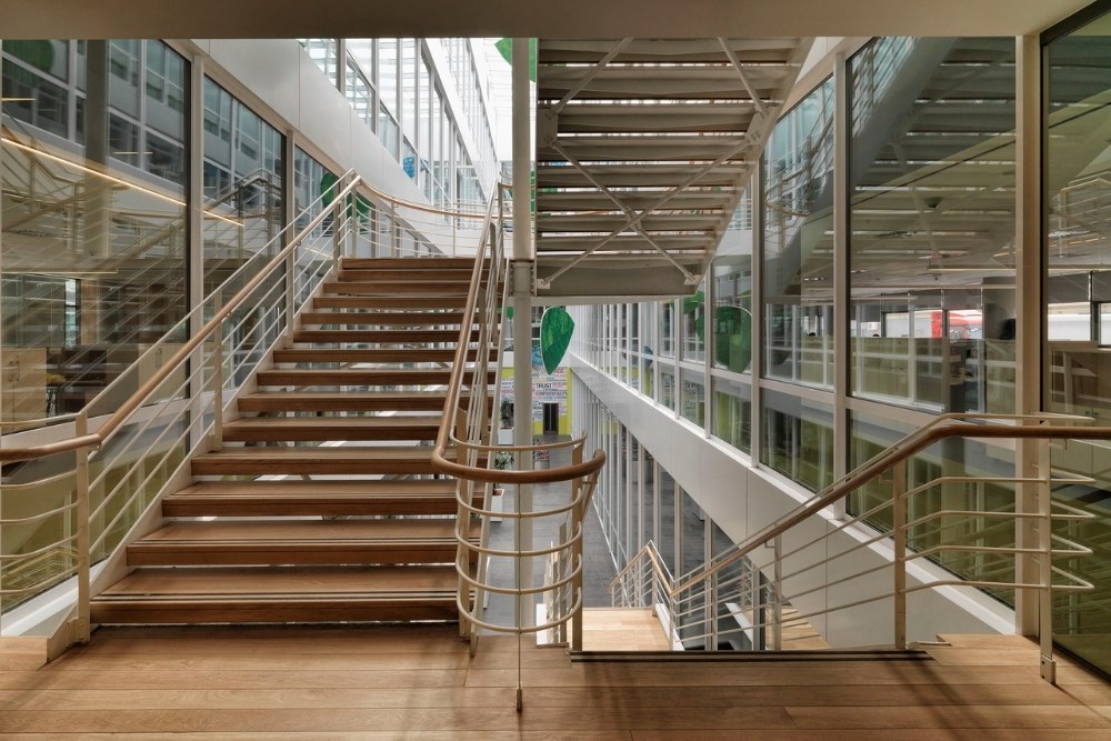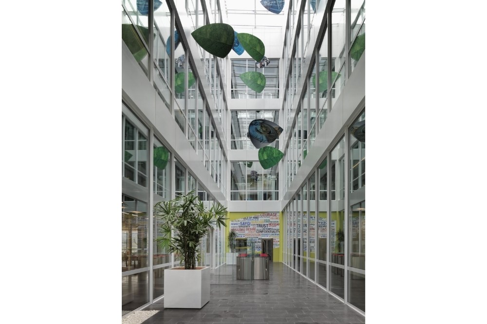Paralel ofis blokları açılı bir şekilde avlu boyunca uzanır ve köprülerle bağlanırlar. İki kitlenin arasında yer alan kafeteryaya çökük bir avluya inilerek ulaşılır. Kafeteryanın çatısı aynı zamanda ofis zemin katlarından ulaşılabilen bir iç bahçe olarak kullanılır. Tasarım stüdyoları kompleksin girişten uzakta ve alt kotta yer alır. Bodrum kotunda konumlanan stüdyolar çatıdan doğal ışık alan mahrem mekanlardır. Yapıların dış çeperleri pasif güneş kontrolü sağlayan, farklı geçirgenlik değerlerine sahip perfore aluminyum levhalar ile kaplıdır. Ancak avluya bakan cephelerde bu kaplama tamamen kaldırılarak cephe şeffaflaşır ve avlu ile doğrudan görsel temas kurulur. Bu tavır mühendislik merkezinin aslında bir bütünün ortadan ikiye ayrılarak ortadaki avluyu oluşturduğunu ifade eder.