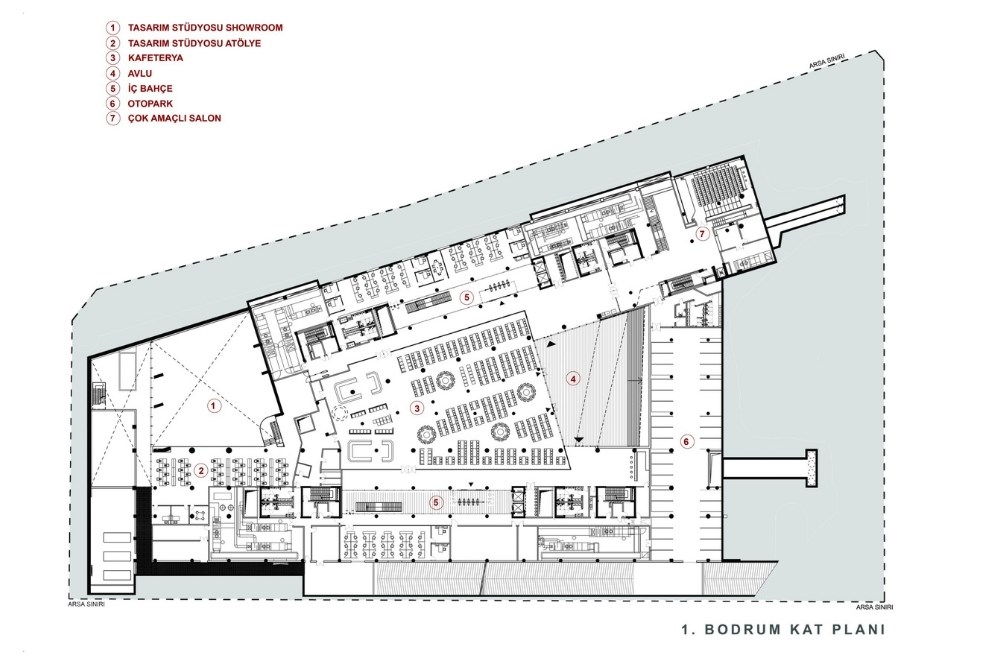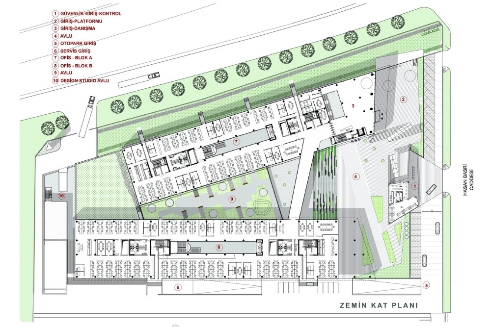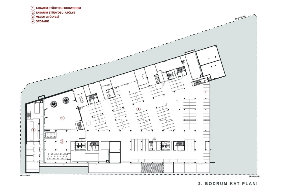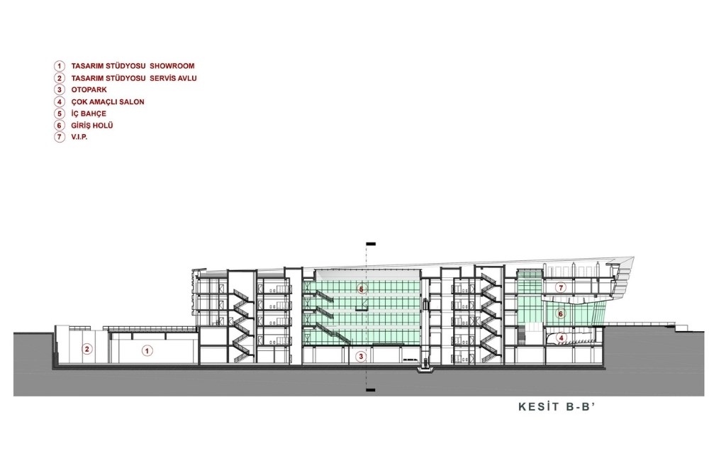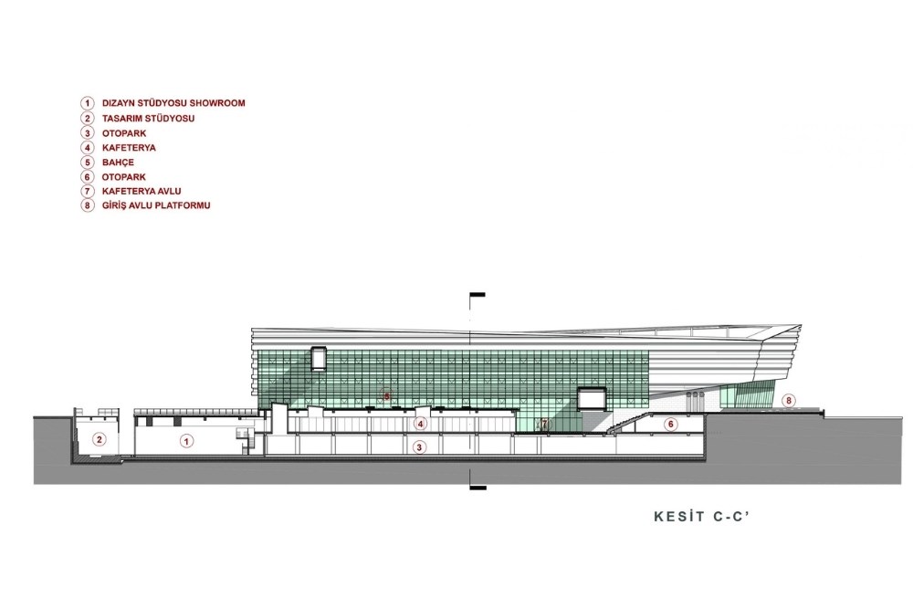 Merkez, tasarım stüdyosu, açık ofisler, kapalı ve açık oto teşhir alanları, sergi salonu, oditoryum, kafeterya, açık/yarı açık teraslar ve avlulardan oluşmaktadır. TEM otoyoluna cephe veren kompleks 2 ana ofis kitlesinin tanımladığı bir avlu oluşturur. Otobana paralel konumlanan ön plandaki blok aynı zamanda buradan gelen gürültü ve rüzgara karşı bir bariyer haline gelir. Böylece arkasında kalan mekanlar tamamen rekreaktif amaçlı açık gezinti ve buluşma alanları olarak kullanılırlar.