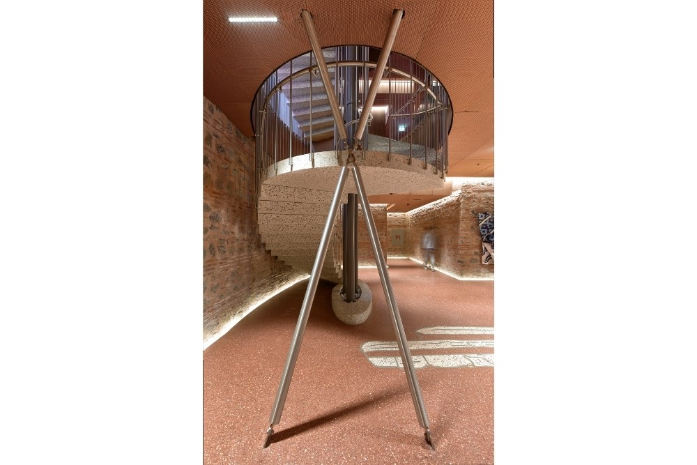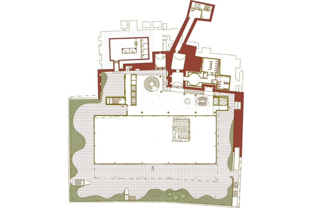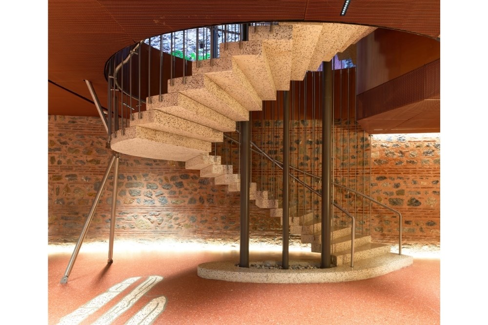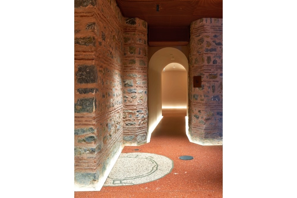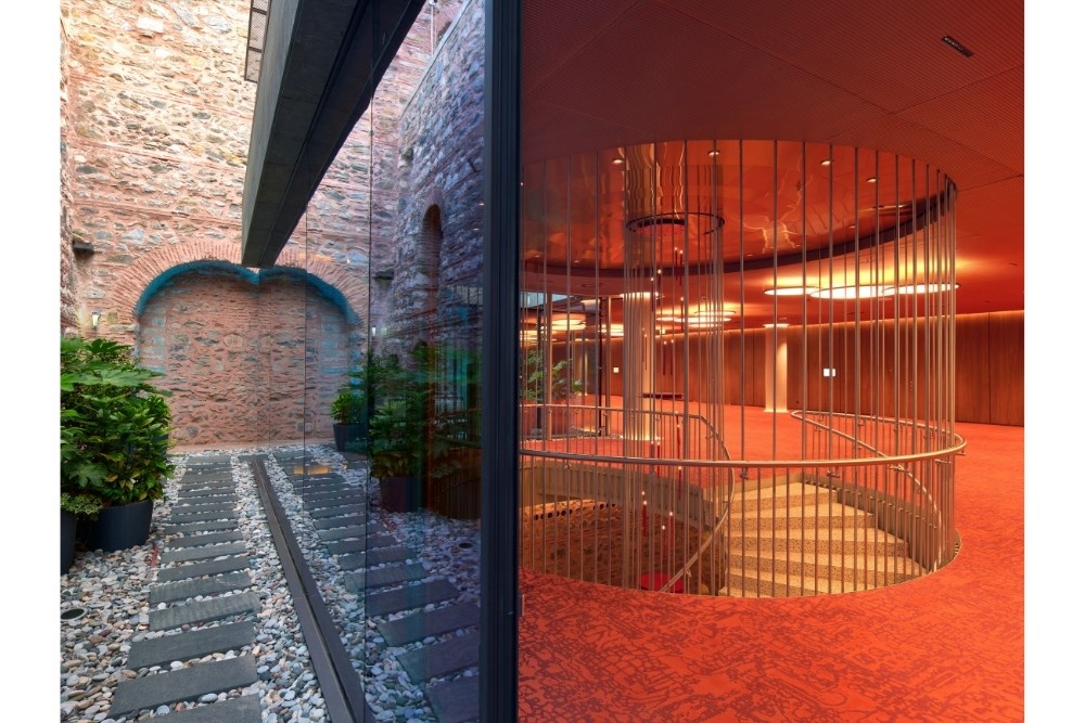 Büyük etkinlik salonunun tasarımında, mevcut tarihi duvarların oranları referans alınmış; bu duvarlar hem iç hem dış mekânda vurgulanarak tasarımın ayrılmaz bir unsuru haline getirilmiştir. Teknik hacimlerin çatıları yeşil teraslar olarak düzenlenmiş, böylece çevredeki yeşil dokunun sürekliliği sağlanmıştır. Çatı arasına yerleştirilen ışık bacaları, doğal gün ışığını iç mekâna taşımaktadır. İç mekândaki ahşap tavan kaplaması ise akustik dengeyi sağlamaktadır. Kullanılan malzemelerde sürdürülebilirliğe önem verilmiş, mümkün olduğunca yerel malzemeler ve kazılarda çıkarılan yapı taşları değerlendirilmiştir.