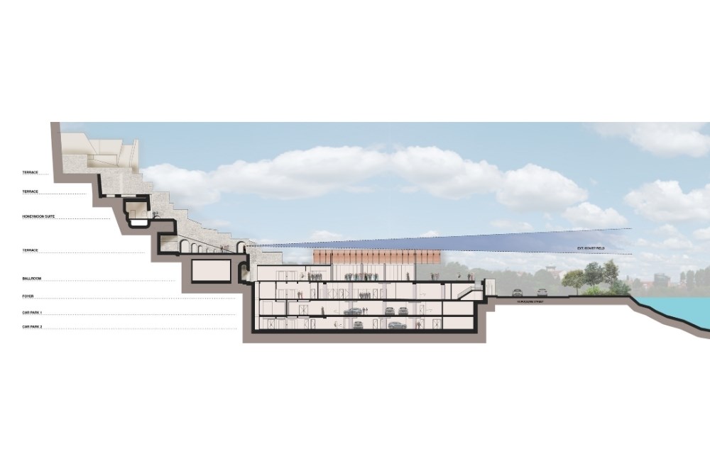 GAD’ın mimari stratejisi, sahil hattında yer alan bu proje için, bölgede bir zamanlar mevcut olan ancak günümüze ulaşmamış iki Boğaziçi yalısının özgün mimari unsurlarından — tuğla istinat duvarları, teraslar, tonozlar ve kemerlerden — esinlenen, yeni ama geçmişle uyumlu bir dil geliştirmiştir. Yeni yapıdaki görünür öğeler, mevcut etkinlik salonu terasının uzatılmasıyla sınırlı tutulmuş; dalgalı bir çelik strüktür ve saçak, Boğaz’ın kıyısındaki dalgaları yansıtan “akışkan” bir çatı formu oluşturmuştur. Bu alan, düğünler ve kurumsal etkinlikler için kullanılan çok amaçlı salonu örtmekte ve cam cephe arkasında yer alan ana hacmi Boğaz manzarasına gizli bir biçimde açmaktadır. Salonun altındaki katlarda mutfak ve otopark birimleri yer almaktadır.