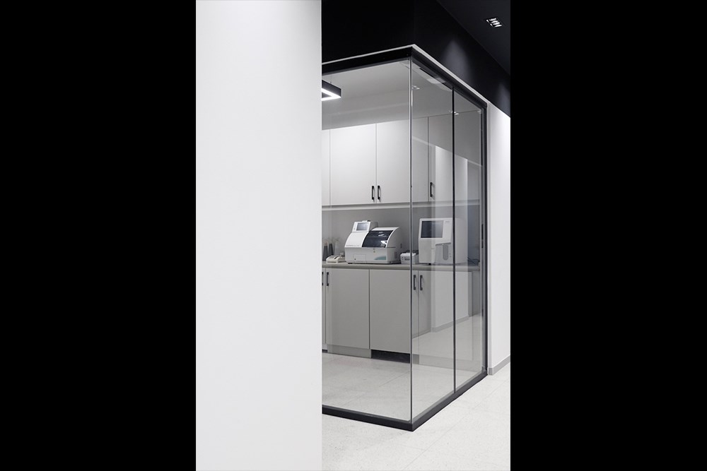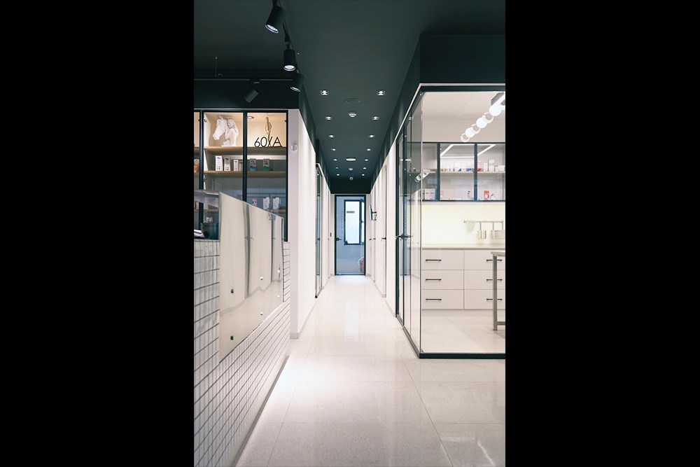 Koridor girişi muayene alanı başlangıcı olarak düşünüldü. Beyaz duvarlar arasında misafir-hekim geçirgenliği ve koridordan bakış perspektifi baz alındığında, laboratuvar alanı şeffaflaştırıldı. Bu sayede dolu ve beyaz bölgede bir kırılım sağlandı. Daha sonraki alanların klinik bazında özel alanlar olması sebebi ile şeffaflaştırma yerine duvarlar daha dolu tasarlandı.