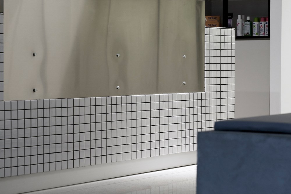 Klinik giriş alanı karşılama masası, pet ürünleri satış birimi, oturma ve bekleme salonu olmak üzere üç ana bölümde tasarlandı. Karşılama masası seramik malzeme ve alüminyum sac ile birlikte kurgulandı. Arka tarafında devam ettirilen alüminyum plaklar sayesinde parlayan gri yüzeyler içerisinde masa ön plana çıkarıldı.
