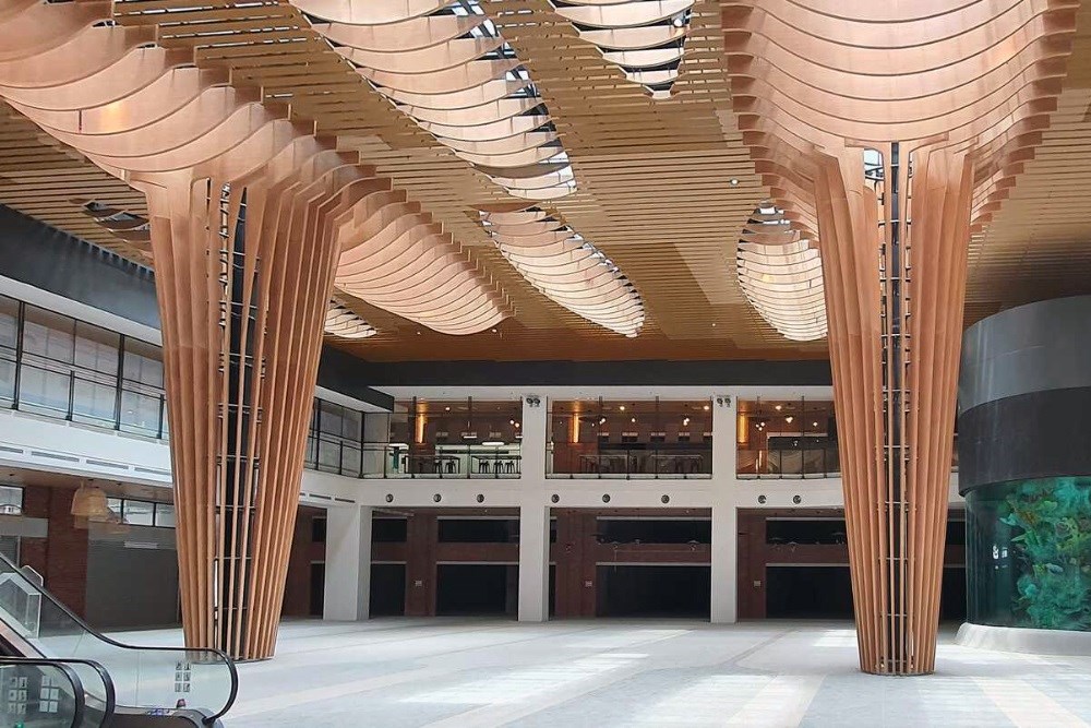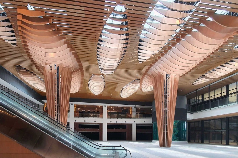 Ayrıca, tavan tasarımındaki bulut formu efekti ile de hem iç mekana daha fazla doğal ışık alınmış, hem de tropikal denizcilik sembolize edilmiş olur. Her biri farklı formda üretilerek, parametrik tasarım öğesi görevi gören tavan panelleri, iç mekan tasarımının sanatsal ifadesini derinleştirmeye katkı sağlamıştır.