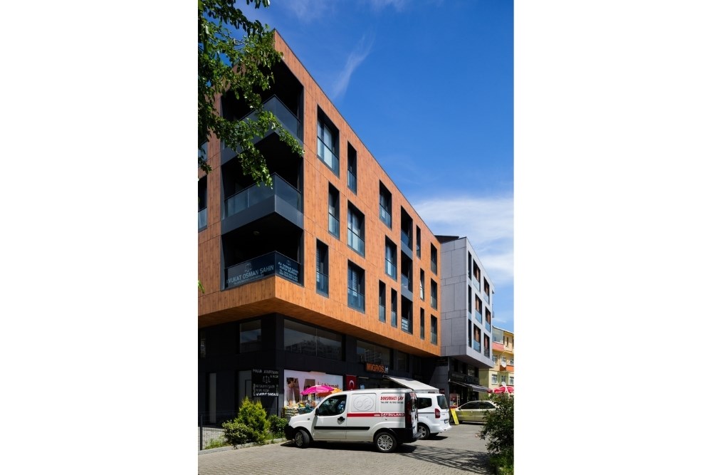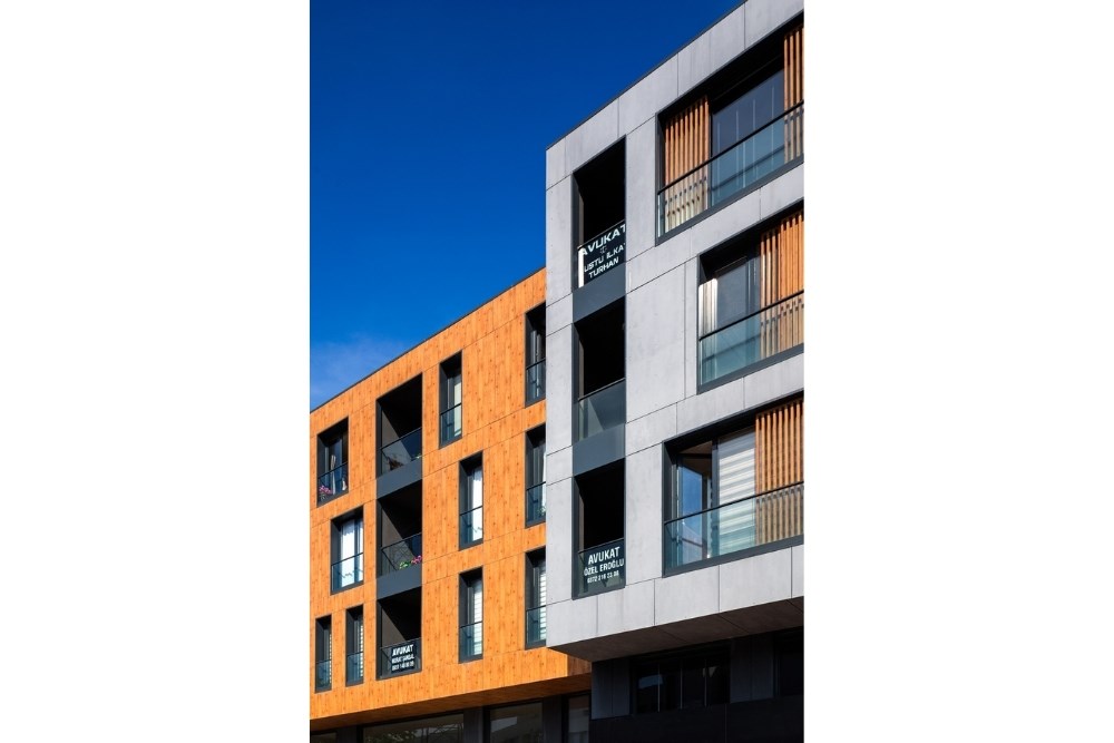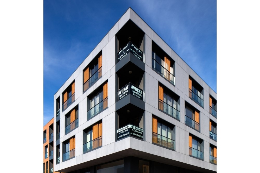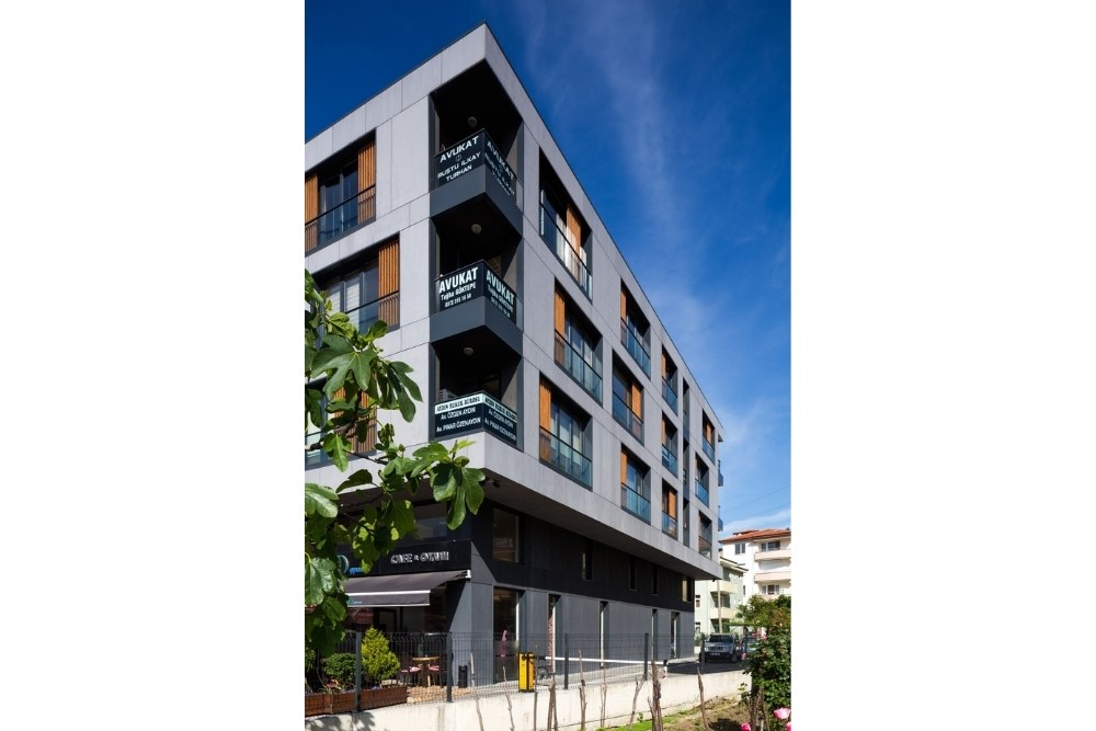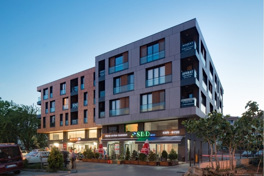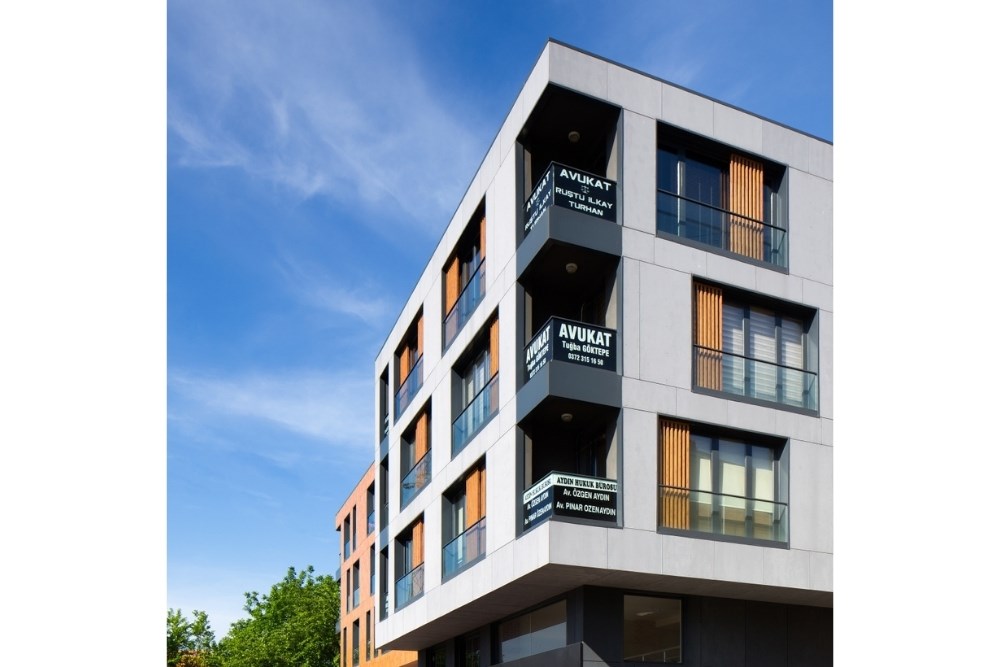 Konutların girişi arka, ofislerin girişi ise ön cepheden verildi, her iki işlevin çekirdekleri ve dolaşım holleri yan yana ama birbirine karışmayacak biçimde çözülmüştür. Bina kütlesi ve cephesinin farklı işlev alanlarını ayrıştırması amaçlanmıştır. Bu doğrultuda, konut ve ofis bölümleri bitişik iki farklı yapı izlenimi verecek biçimde kaydırılmıştır. Kütledeki ayrım cephede mağaza katında koyu gri, ofis bölümü cephesinde açık gri renk, konut bölümü cephesinde ise ahşap dokusu kullanımı ile pekiştirilmiştir.
