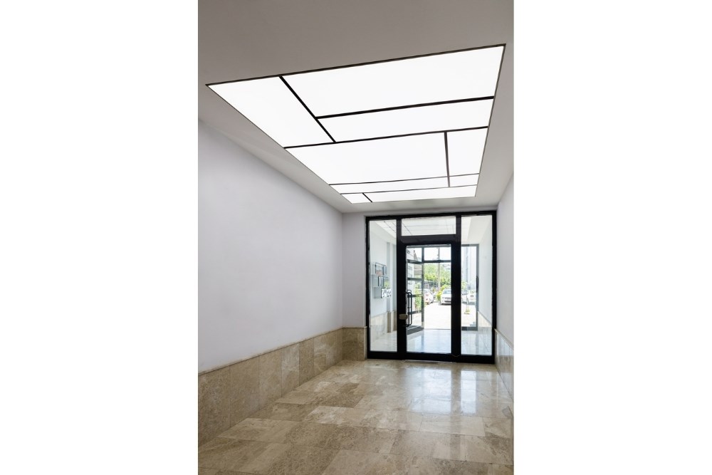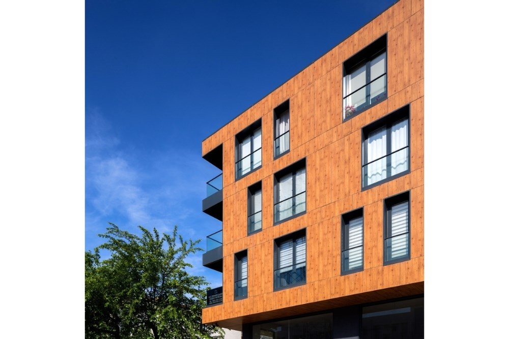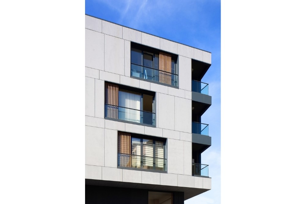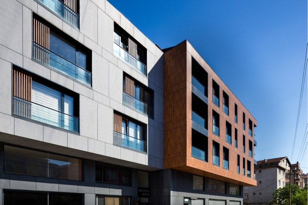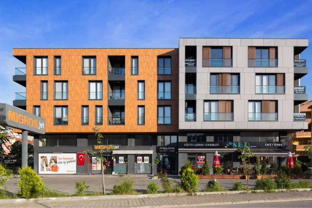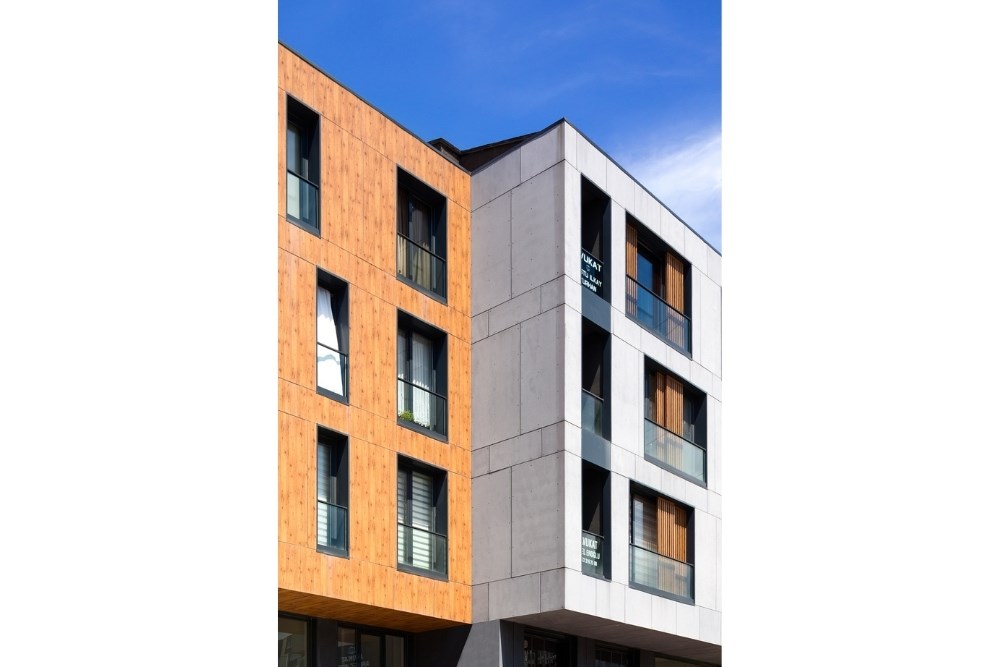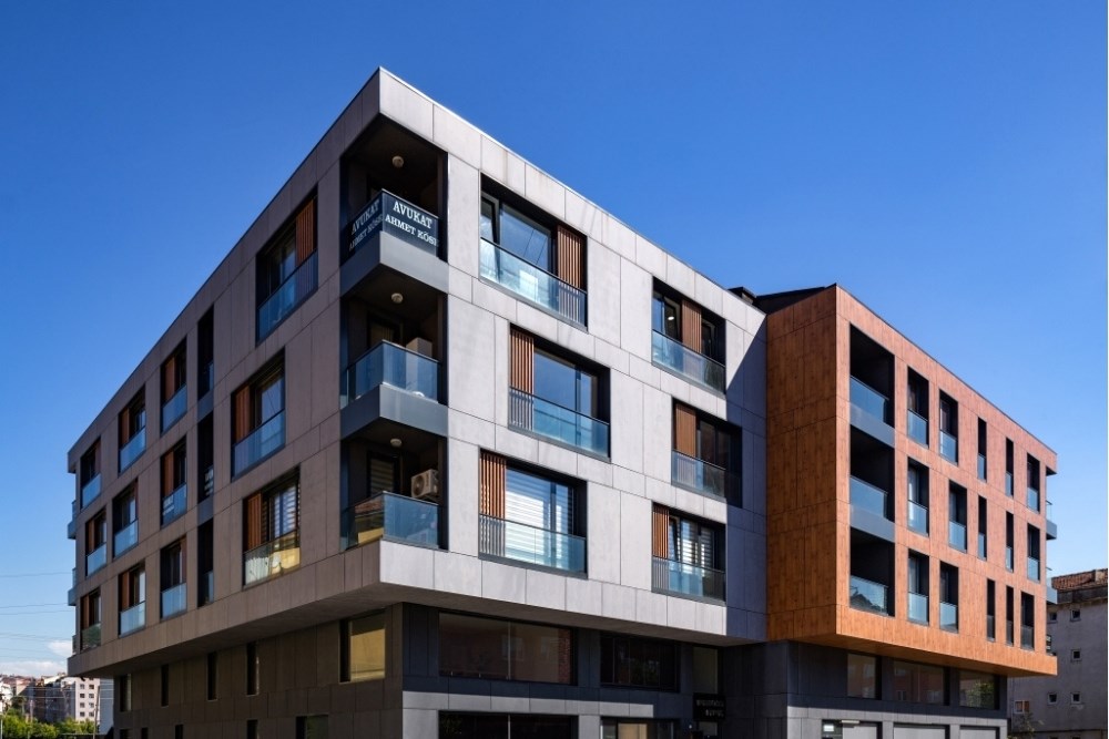 Konutların girişi arka, ofislerin girişi ise ön cepheden verildi, her iki işlevin çekirdekleri ve dolaşım holleri yan yana ama birbirine karışmayacak biçimde çözülmüştür. Bina kütlesi ve cephesinin farklı işlev alanlarını ayrıştırması amaçlanmıştır. Bu doğrultuda, konut ve ofis bölümleri bitişik iki farklı yapı izlenimi verecek biçimde kaydırılmıştır. Kütledeki ayrım cephede mağaza katında koyu gri, ofis bölümü cephesinde açık gri renk, konut bölümü cephesinde ise ahşap dokusu kullanımı ile pekiştirilmiştir.