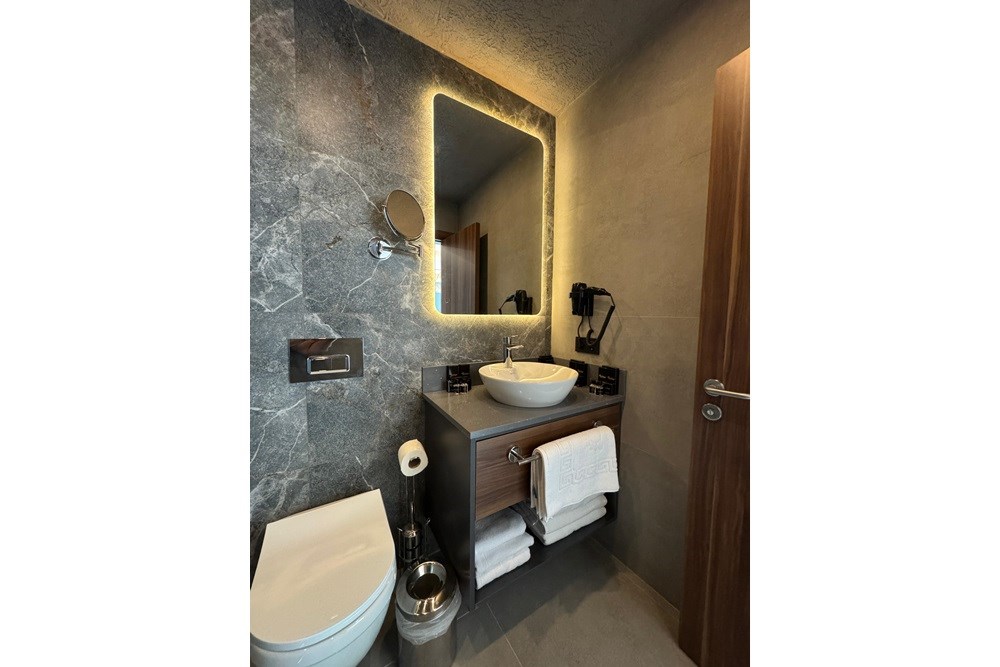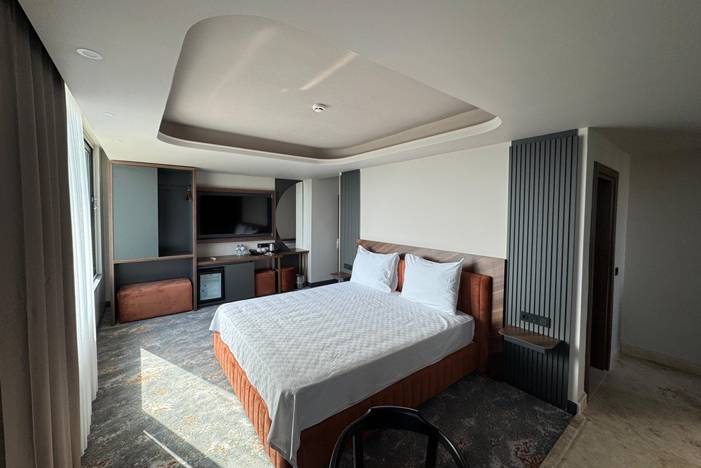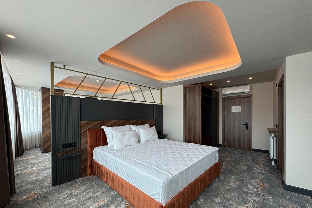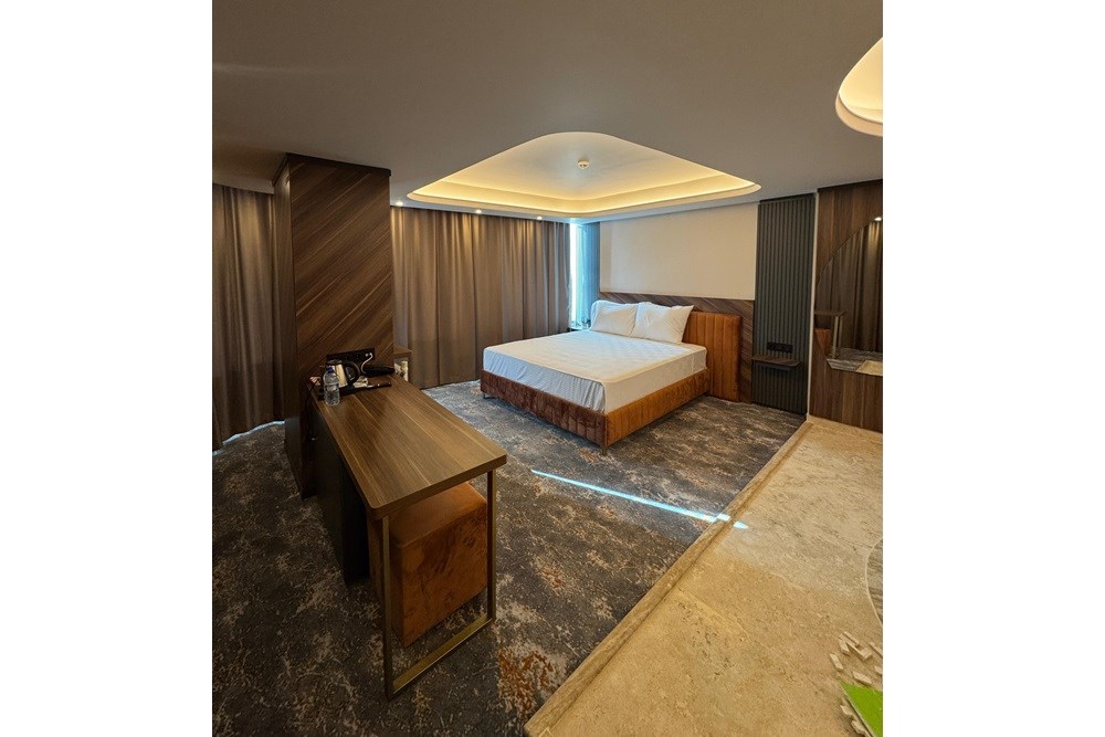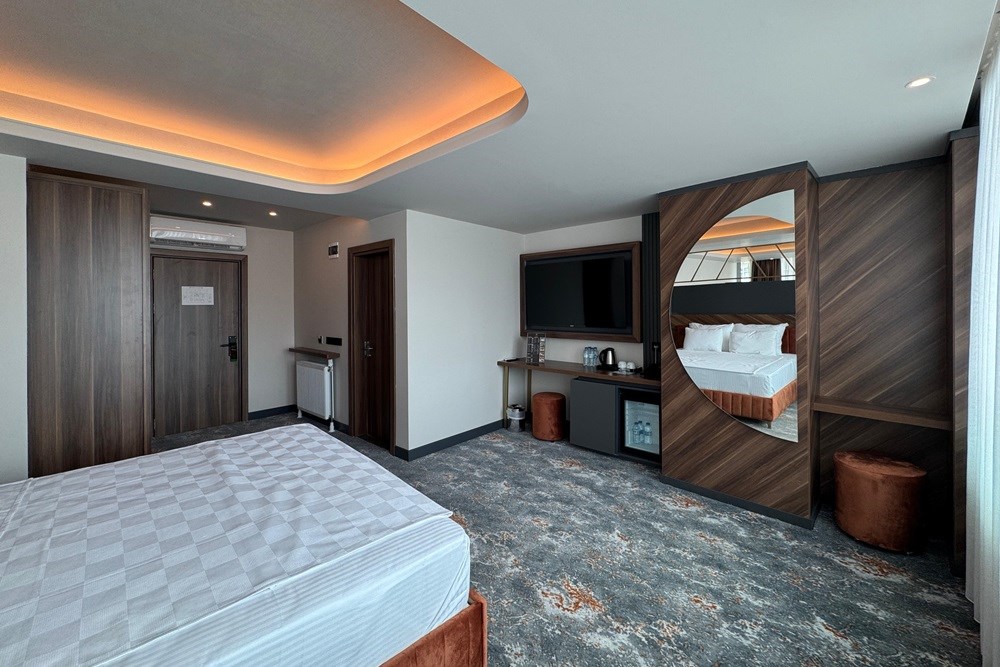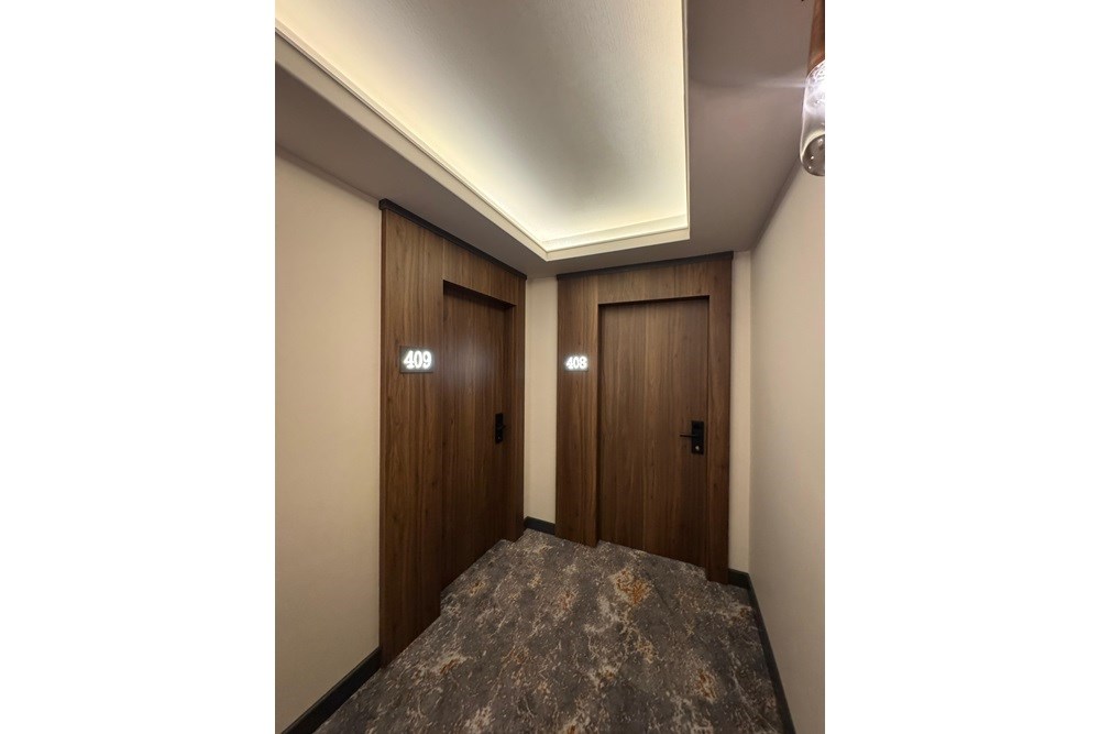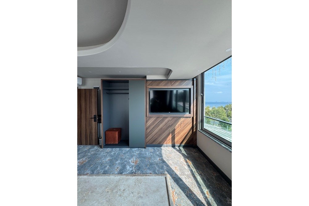 Güncel yangın yönetmeliğine uygun olarak tasarlanan oda giriş kapıları, 30 dakika yangın dayanımı ve elektronik kartlı kilit sistemiyle güvenlik ile konforu bir araya getiriyor. Üretimden montaja kadar tüm süreçte hem fonksiyonelliği hem de estetik beklentileri karşılayan bütüncül bir yaklaşım benimsenmiştir. Geliştirilen çözümler, konaklama alanlarına hem güçlü bir tasarım dili hem de uzun ömürlü kullanım konforu kazandırmıştır.