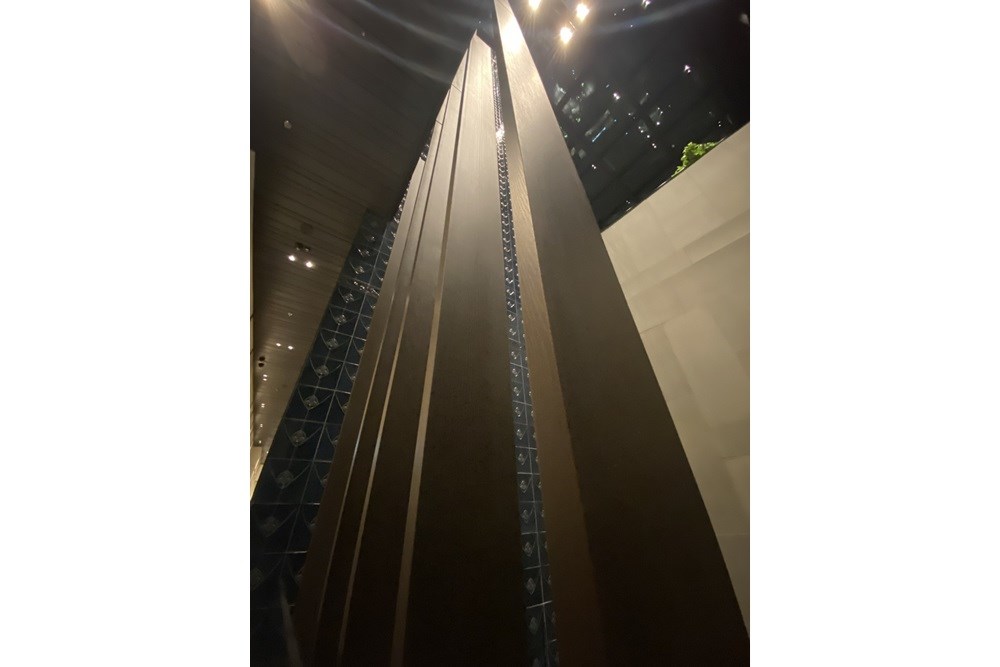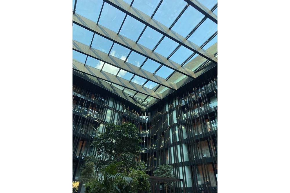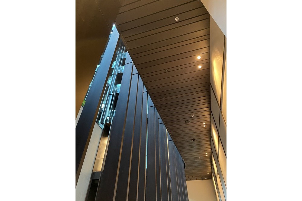 Tavanlarda uygulanan baffle sistemleri, iç mekâna modern bir dinamizm katarken, mimarinin ritmini destekleyen yapısal bir unsur olarak dikkat çekiyor. Ayrıca 20 mm kalınlığındaki Technowood siding kaplamaların skylight bölgelerine entegre edilmesi, doğal ışığın içeri ile buluşmasını kesintisiz ve estetik bir biçimde sağlıyor. Bu detay, mekânda sıcak ve davetkar bir atmosfer yaratılmasına katkı sunuyor.