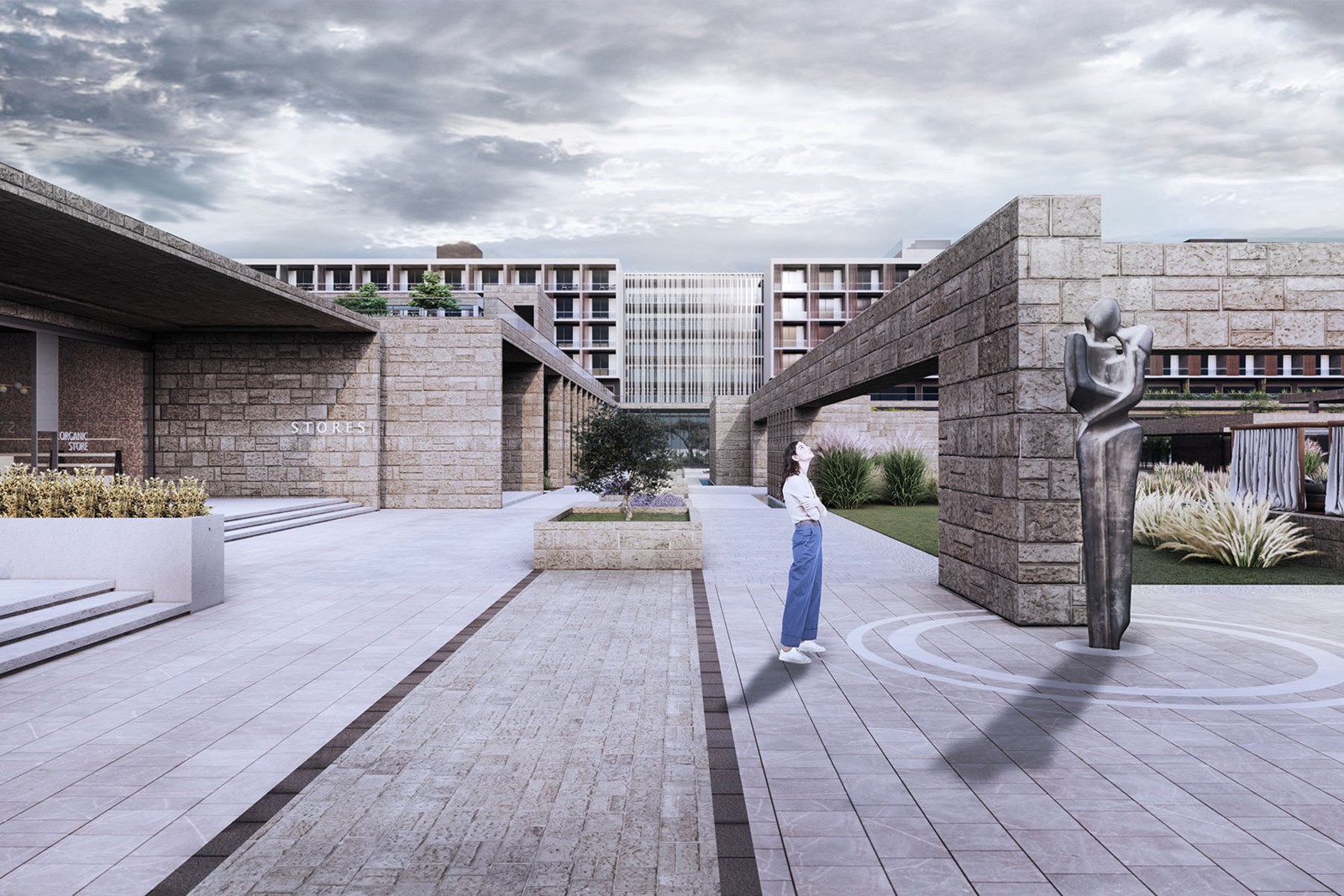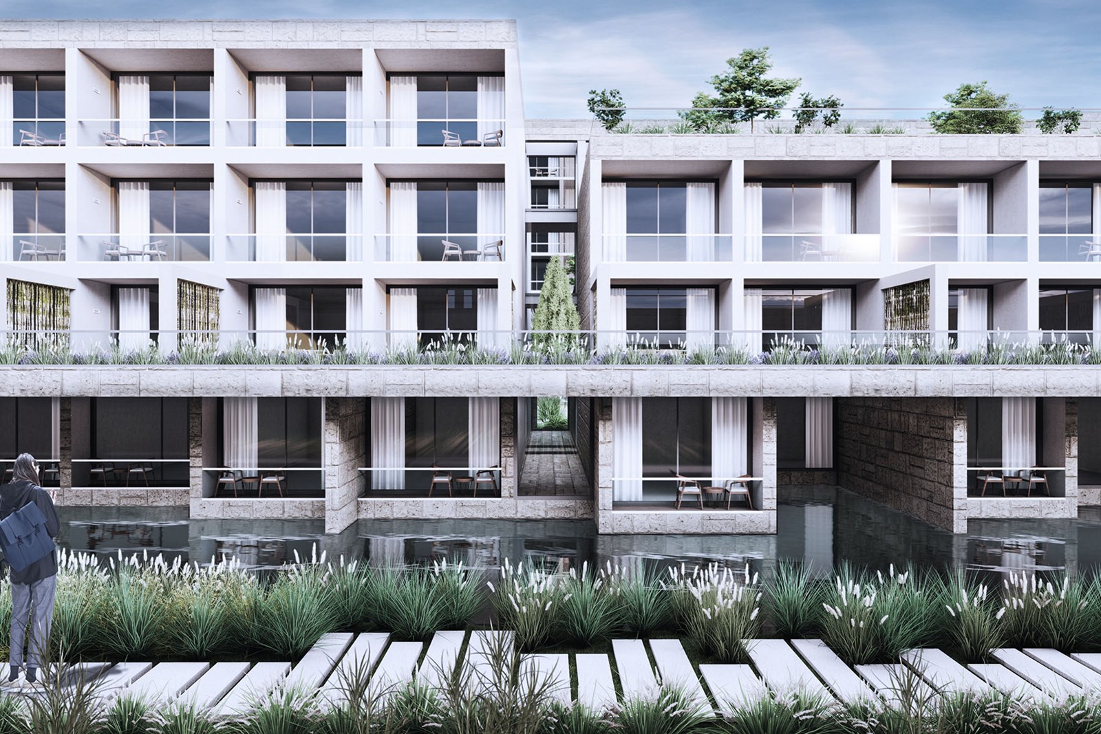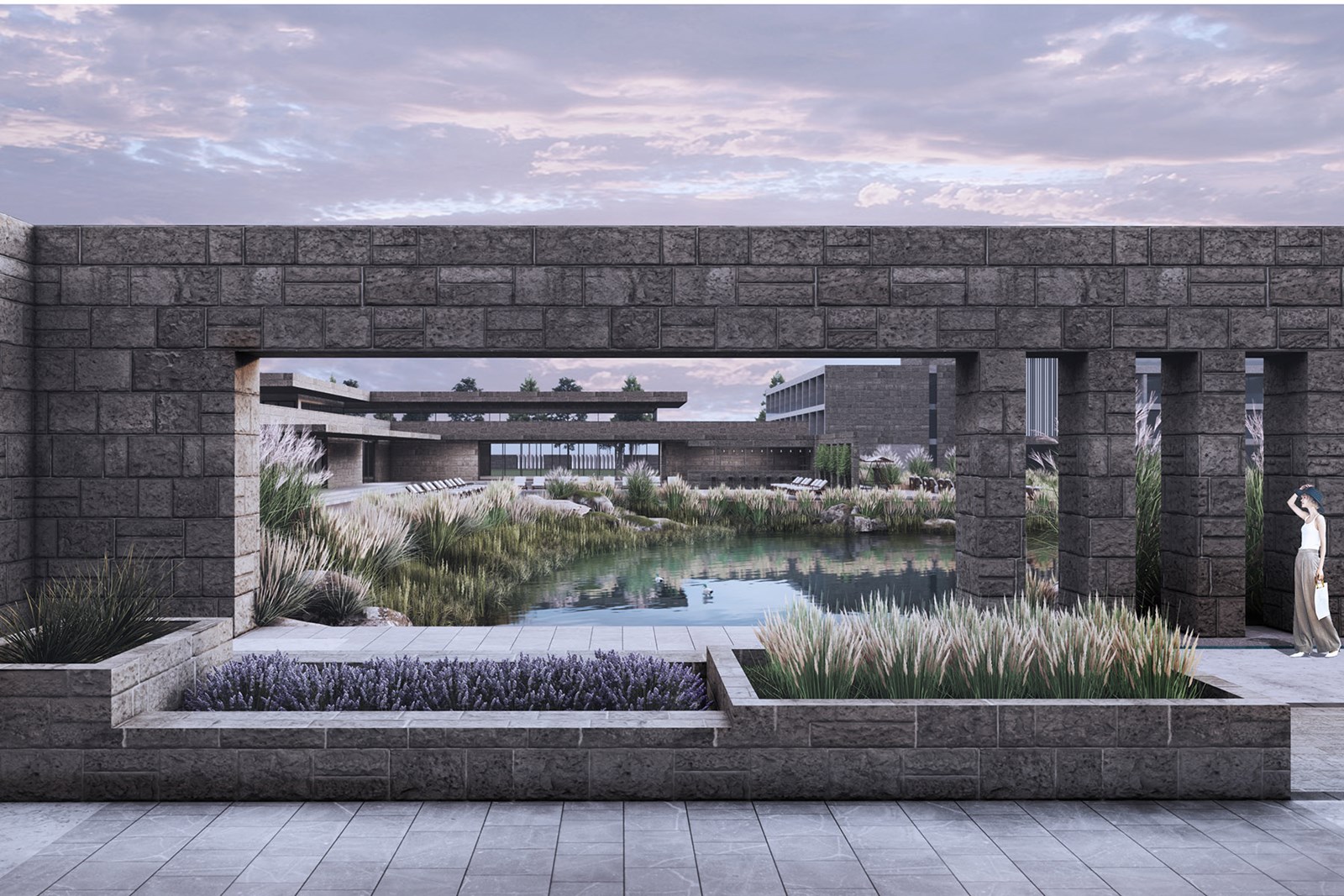 Otel, yaklaşık 60 dönümlük bir araziye yerleşmektedir ve otelin bulunduğu topografya doğal su arklarına sahip, yer üstü ve yer altı doğal kaynaklarını bulunduran bir yapıdadır. Tarihi yerleşkelere yakınlık, bu yerleşkelerle aynı coğrafyaya ve hissiyata sahip olma durumu, verimli topraklarla ve günden güne varlığını yitiren su arklarının kılcal yollarla çevrelenmesi ve denizle bağlanması bu arazinin ana tanımlayıcı unsurları olarak görüldü. Alanın kuzey doğusunda yer alan büyük sulak alan ve bu alandan dağılarak ince bir kılcallıkla alana erişen bir su arkı bulunmakta. Bu kaynağın sürdürülebilir bir karakterde alanda yeniden ele alınarak doğal gölet haline getirilmesi tasarımın şekillenmesi için ilk hamle oldu. Doğal gölete ek olarak alan hem denize doğru yönelen hem de kendi içerisinde güçlü bir sirkülasyon şeması oluşturacak birbirine dik iki aks ile vurgulanıyor. Troya ve çevresindeki antik kentlerdeki kenti vurgulayan su yolları ile birlikte yükselen duvarların yarattığı yere özgü dil kurgusunun bir enstalasyonu bu ana akslarda yeniden canlanıyor. Otele ait mimari kütleler farklı işlevlerde ve ana kütleye doğru farklı yükseklikte artikülasyonlarla tasarlanırken bu artikülasyonların zemin kat – peyzaj ilişkilerinde geçirgen bir tasarım dili geliştirildi. Böylelikle alan içerisinde, ziyaretçiler için oldukça erişilebilir bir sirkülasyon şeması ortaya çıktı. Ana kütle monolitik ve yalın bir kimliğe sahip. Alan içerisinde de bir başlangıç bir başka deyişle karşılama kütlesi niteliğinde. Operasyonel ihtiyaçların da karşılandığı ana kütle diğer kütleleri besleyecek bir yapıda geliştirildi. Bu kütlenin çevresinde farklı uzanımlar ile tasarlanmış kütleler daha niş fonksiyonlara sahip. Ayrıca farklılaşmış konaklama deneyimleri de ana kütle dışında, iki farklı kütlede ‘göl konaklama’ ve ‘rekreasyon konaklama’ olarak ele alınmıştır. Bütüncül orta alan peyzajı hem kütlelerin açık fuaye alanı olarak çalışır hem de doğal peyzaj elemanlarının sergilendiği bir açık hava sergi alanı gibi davranır. Çeperlerde ise yerleşkeyi kendi içerisinde izole eden güçlü bir peyzaj tampon alanı tasarlandı. Birbirinden bağımsız fonksiyonlara sahip kütlelerin doğal zemin kotundaki erişilebilirliğinin yanı sıra ikinci bir peyzaj kotu da güçlü bir bağlantı öğesi olarak ilişkili kütleler arasında sağlandı. Bu erişim ile birlikte ana kütle ile konferans yapısı arasında güçlü bir bağ oluşturulması öngörülmüştür. Mimari formların tamamlayıcısı olarak malzeme seçimleri kurgunun önemli bir parçası. Bölgeye özgü doğal taş türevlerinin cephelerde kullanılması, peyzajı oluşturan yüzeylerde yine doğal malzemeler tercih edilmesi gibi.. Bu noktada peyzaj katmanlarının iki dilinden bahsedebiliriz; biri alanın içerisindeki su dinamiğinden yola çıkarak oluşturulmuş gölet ve çevresindeki organik formlar, bir diğeri peyzaj akışı içerisinde tanımlı işlevsel alanlardaki çizgisel geometriler.