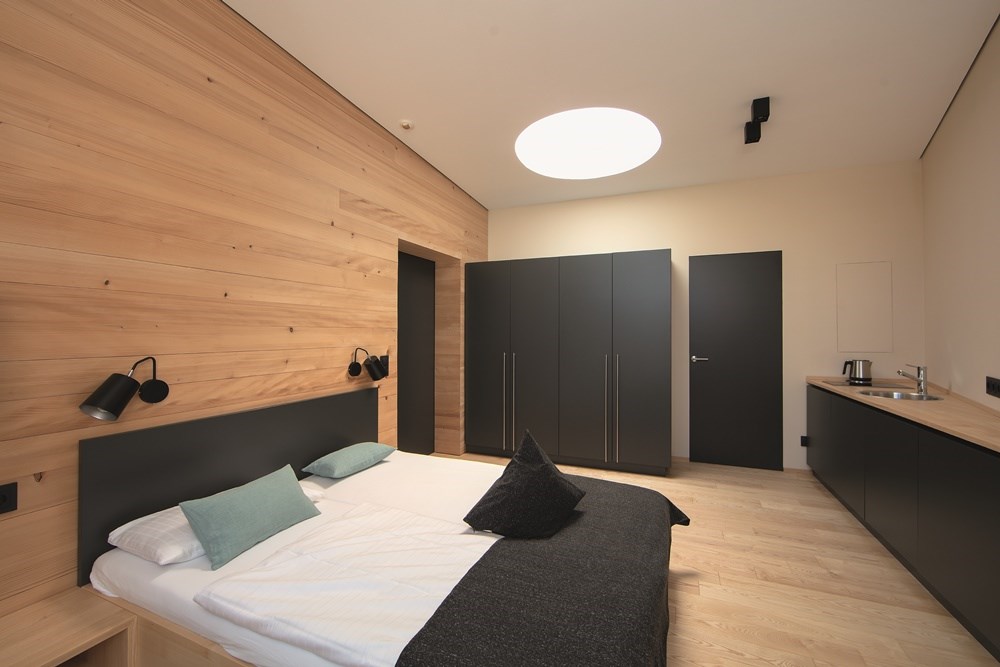 Yeni misafirhane sekiz ayda inşa edildi. Bina, altıgen petek şeklinde birbirine bağlı altı yapıdan oluşuyor. Yeni bina için doğal malzemelerle sürdürülebilir inşaat yöntemi seçildi. Ahşap iskeletli duvarlarda, başka malzemelerin yanı sıra dış cephe kaplaması olarak buhar geçirimli EGGER DHF kaplama levhası kullanıldı. Ayrıca duvarların iç kısmında da EGGER OSB 4 TOP levhalar tercih edildi. Çatıysa yine OSB 4 TOP levhalar kullanılarak ahşap kiriş üzerine sundurma çatı olarak inşa edildi. Doğal taş cephe ise hoş bir görsellik sunuyor. Son olarak, binanın çatısına eklenen şifalı otlar ve lavantalar ile yoğun bir yeşillendirme çalışması uygulandı.