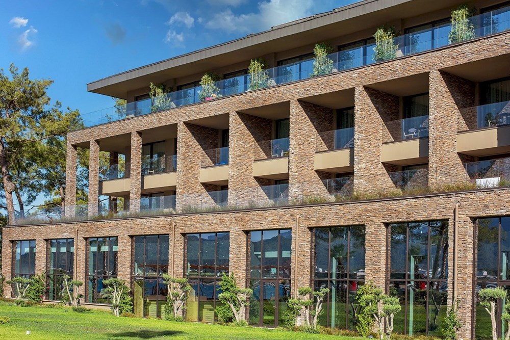 Otelin tasarımında Roma’daki Kolezyum yapısı etkisini gösterir. İç ve dış mekanlarda kullanılan Stonewrap kültür taşı, 11.000 m2’den fazla bir alanı kaplar. Modüler döşeme kolaylığıyla hızlı ve estetik bir çözüm için kullanılan Kronos dekoratif taşı, yeşil ve maviyle ilişkisini doğallığını bozmadan kuruyor. Kronos taşının kahve tonu, huzurlu bir ortam sağlamak adına kullanılarak misafirlerine keyifli bir ortam sunuyor.