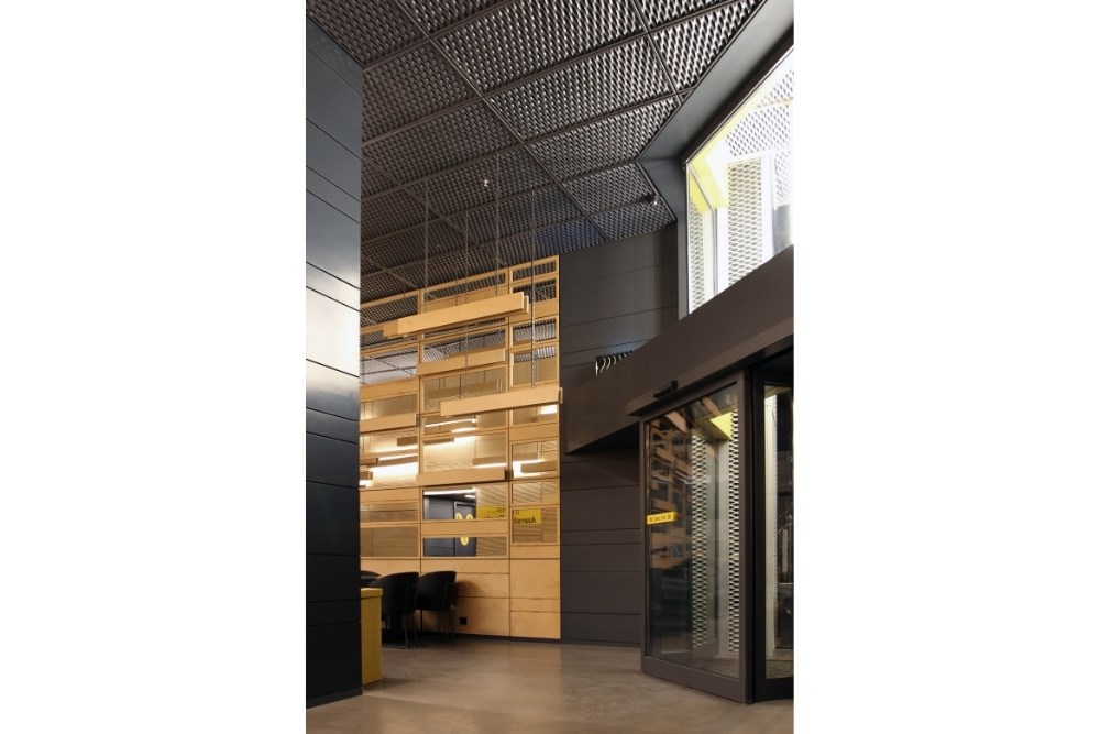 Gerek tamir atölyelerinde sıkça kullanılması, gerekse de dokusunun otomobil gövdelerindeki havalandırma ızgaralarını andırması nedeniyle cephede ağırlıklı olarak genleştirilmiş metal paneller yeğlenmiştir. Komşu parselde yer alan parktaki bitkilerin zamanla girintili yan cephe yüzeyini sararak yapıyı süslemesi amaçlanmıştır.