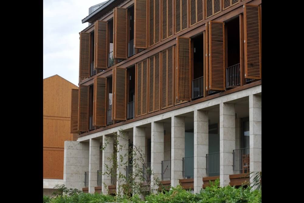Projenin önemli ve çarpıcı tasarım öğesi olan ahşap güneşlik, panjurlar ile Thermowood dış cephe kaplamada patentli bir ürün olan dünyada ilk ve tek KEIM LIGNOSIL potasyum silikat ahşap boyaları tercih edilmiştir.