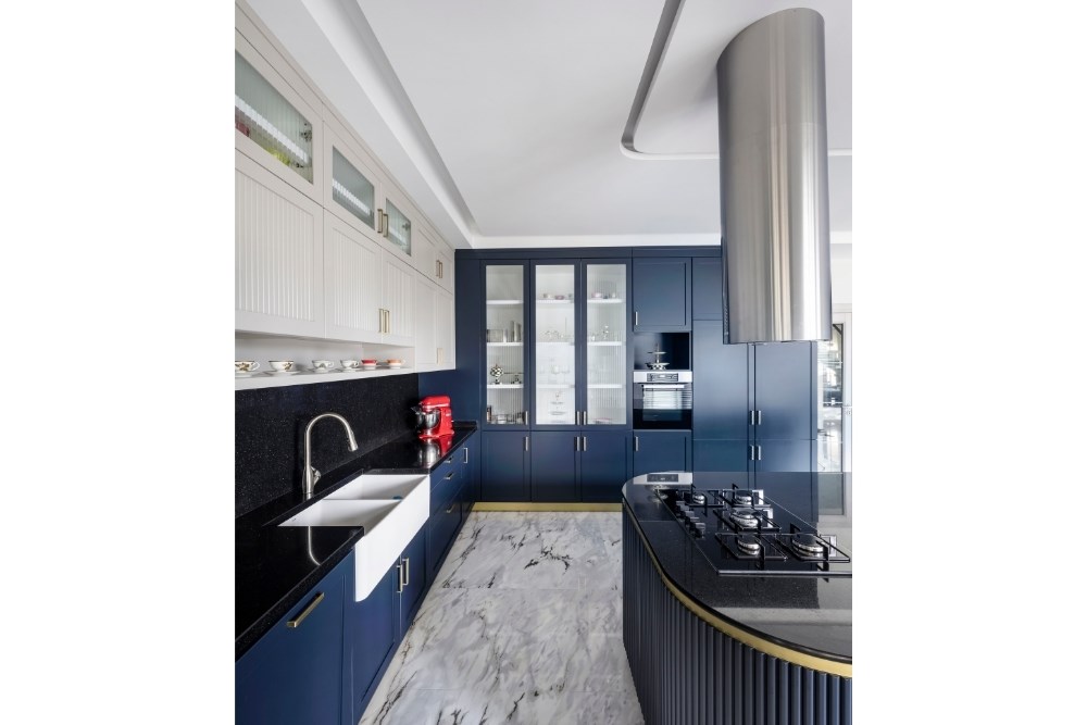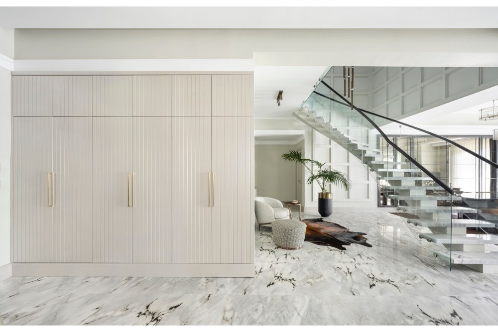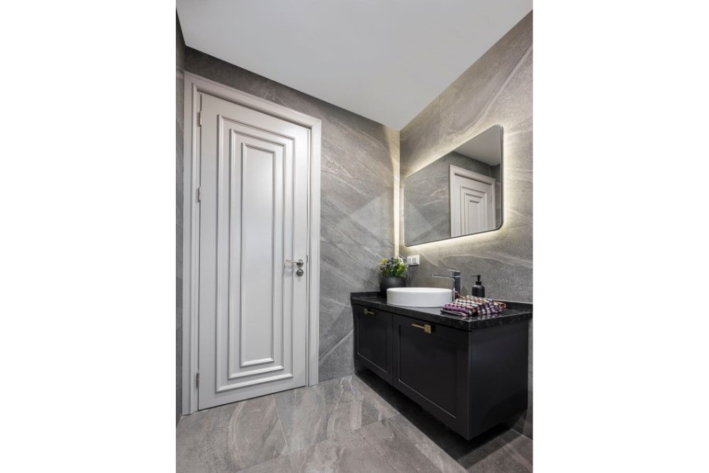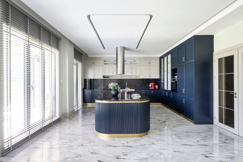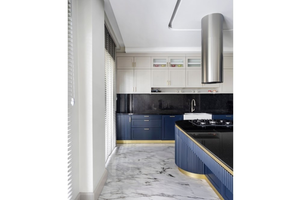 Bahçeyi iç mekândan hissedebilme arzusu ile çıkılan tasarım yolculuğunda, evin ana merkezi merdiven olarak belirlenmiştir. Burada kullanılan mermerin tonu, mutfak dolaplarının tasarımına etki etmiştir. Mutfakta konumlanan ada ünitesi ve tavan arasında bir uyum yakalanmıştır. Koridor boyunca devam eden duvar kaplamaları, salonda da sürdürülerek TV ünitesine dönüştürülmüştür. Tüm tasarım detaylarında, süregelen ve bütünlük oluşturan bir etki yakalanması hedeflenmiştir. Aydınlatmalarda da tamamlayıcı bir kurgu oluşturulmuştur. Mutfakta, ada izdüşümüne paralel gizli LED aydınlatma kullanılırken, bu dil koridor ve yatak odasında da devam etmiştir. Salon ve merdiven boşluğunda ise sarkıt aydınlatmalarla farklı bir ışık oyunu yaratılmıştır. Evin iç mekânlarını geniş ve aydınlık göstermek için mermer ve aynalara başvurulmuştur. Açık renkli İstanbul Blu mermer ile ferahlık hissi yaratılırken, salon bölümü için tasarlanan aynalı dolap ile mekâna hacim kazandırılmıştır. Fonksiyonel bir tasarıma ve tonlar arasında devamlılığa sahip olan proje ile bir evin hem dinamik hem de dingin olabileceği gözler önüne serilmiştir.