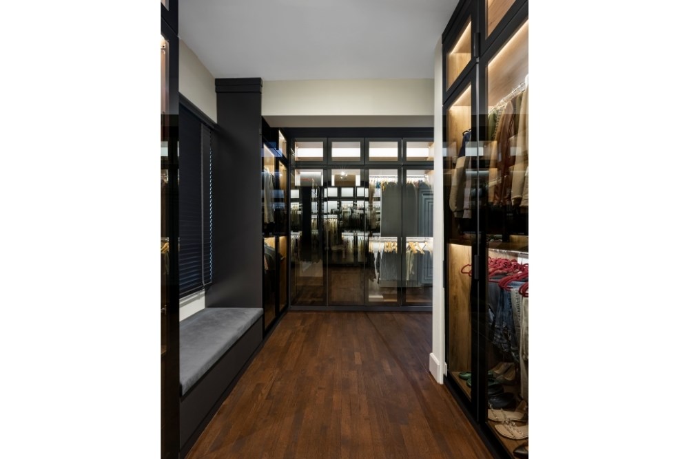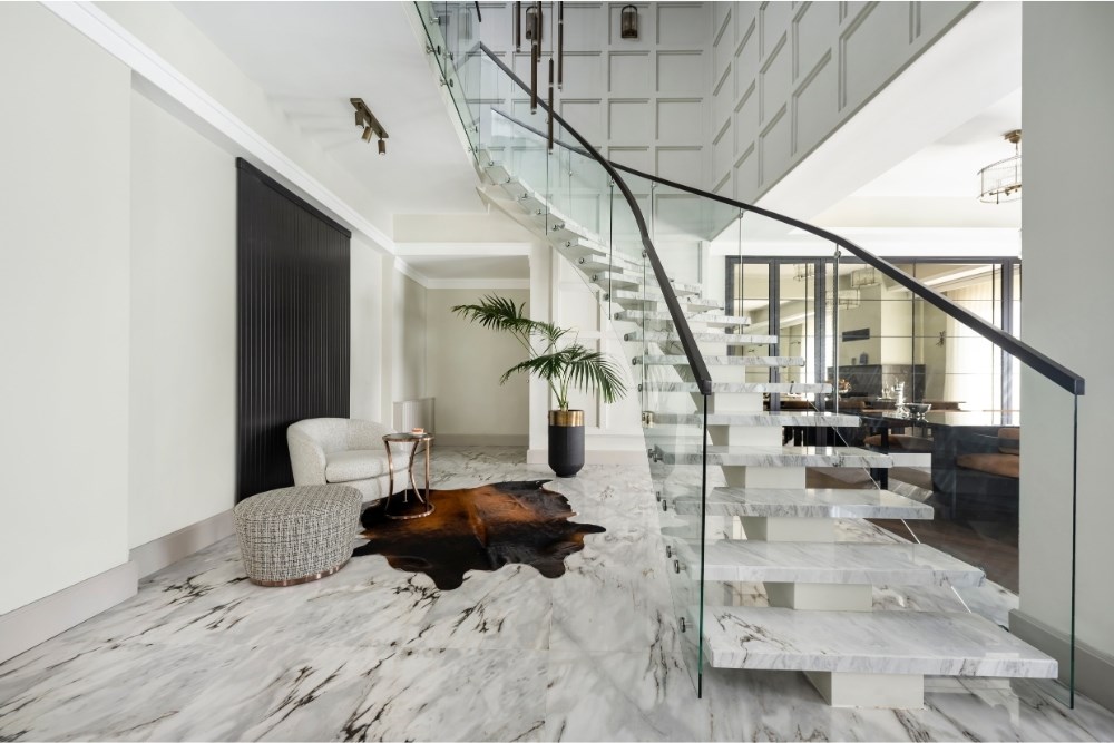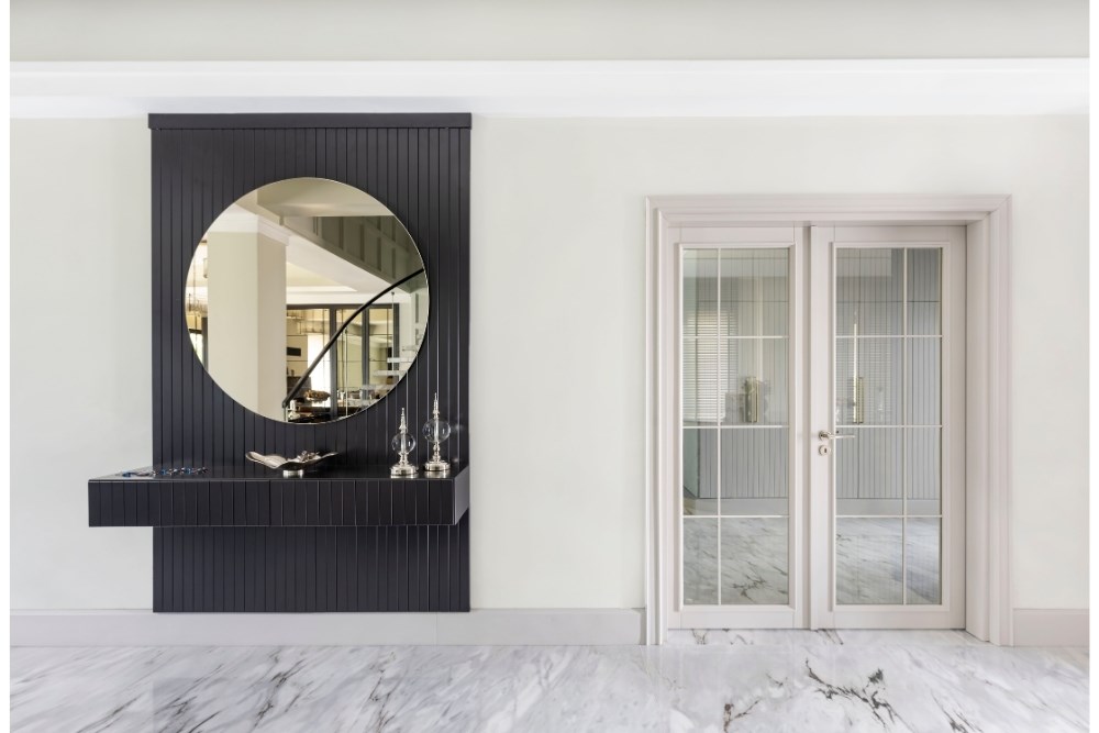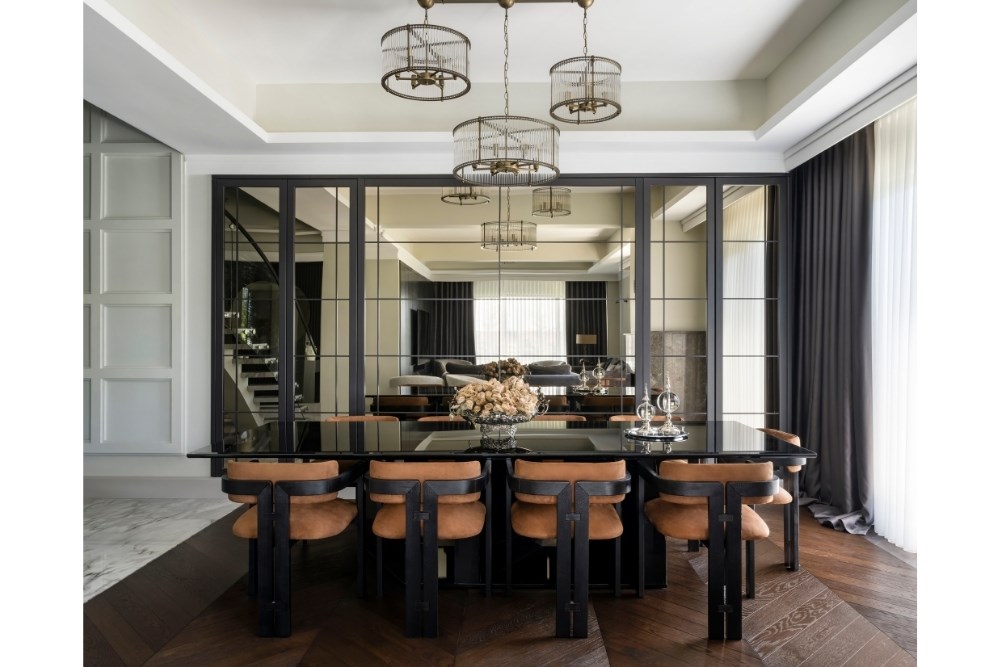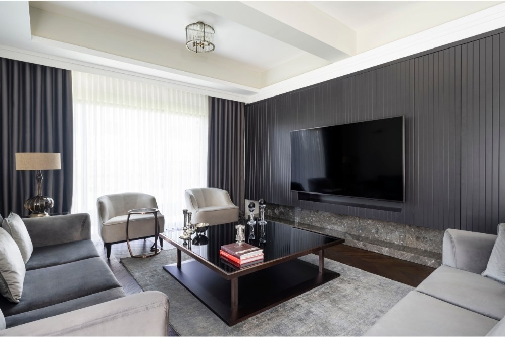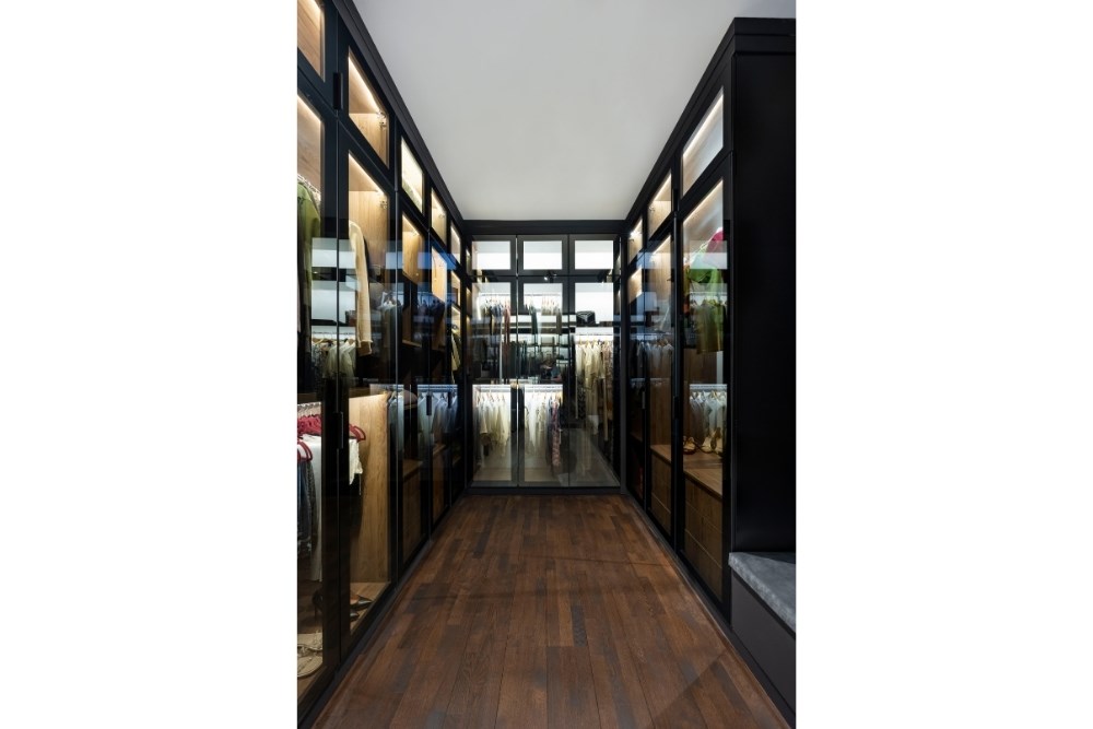 Bahçeyi iç mekândan hissedebilme arzusu ile çıkılan tasarım yolculuğunda, evin ana merkezi merdiven olarak belirlenmiştir. Burada kullanılan mermerin tonu, mutfak dolaplarının tasarımına etki etmiştir. Mutfakta konumlanan ada ünitesi ve tavan arasında bir uyum yakalanmıştır. Koridor boyunca devam eden duvar kaplamaları, salonda da sürdürülerek TV ünitesine dönüştürülmüştür. Tüm tasarım detaylarında, süregelen ve bütünlük oluşturan bir etki yakalanması hedeflenmiştir. Aydınlatmalarda da tamamlayıcı bir kurgu oluşturulmuştur. Mutfakta, ada izdüşümüne paralel gizli LED aydınlatma kullanılırken, bu dil koridor ve yatak odasında da devam etmiştir. Salon ve merdiven boşluğunda ise sarkıt aydınlatmalarla farklı bir ışık oyunu yaratılmıştır. Evin iç mekânlarını geniş ve aydınlık göstermek için mermer ve aynalara başvurulmuştur. Açık renkli İstanbul Blu mermer ile ferahlık hissi yaratılırken, salon bölümü için tasarlanan aynalı dolap ile mekâna hacim kazandırılmıştır. Fonksiyonel bir tasarıma ve tonlar arasında devamlılığa sahip olan proje ile bir evin hem dinamik hem de dingin olabileceği gözler önüne serilmiştir.