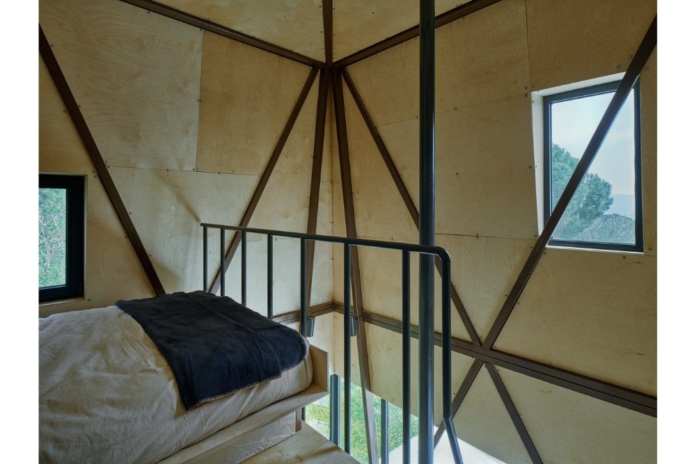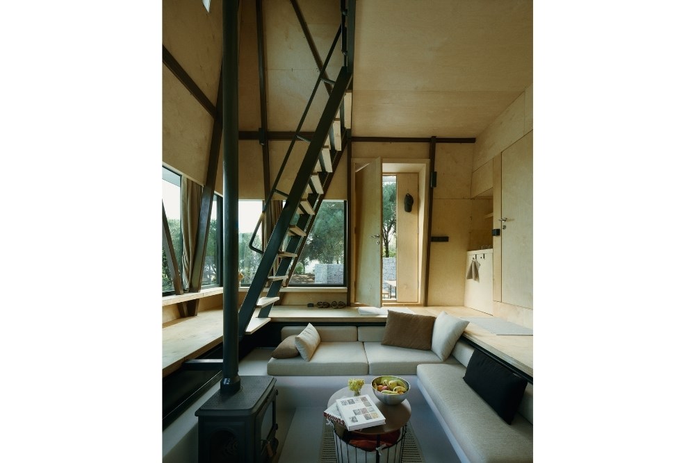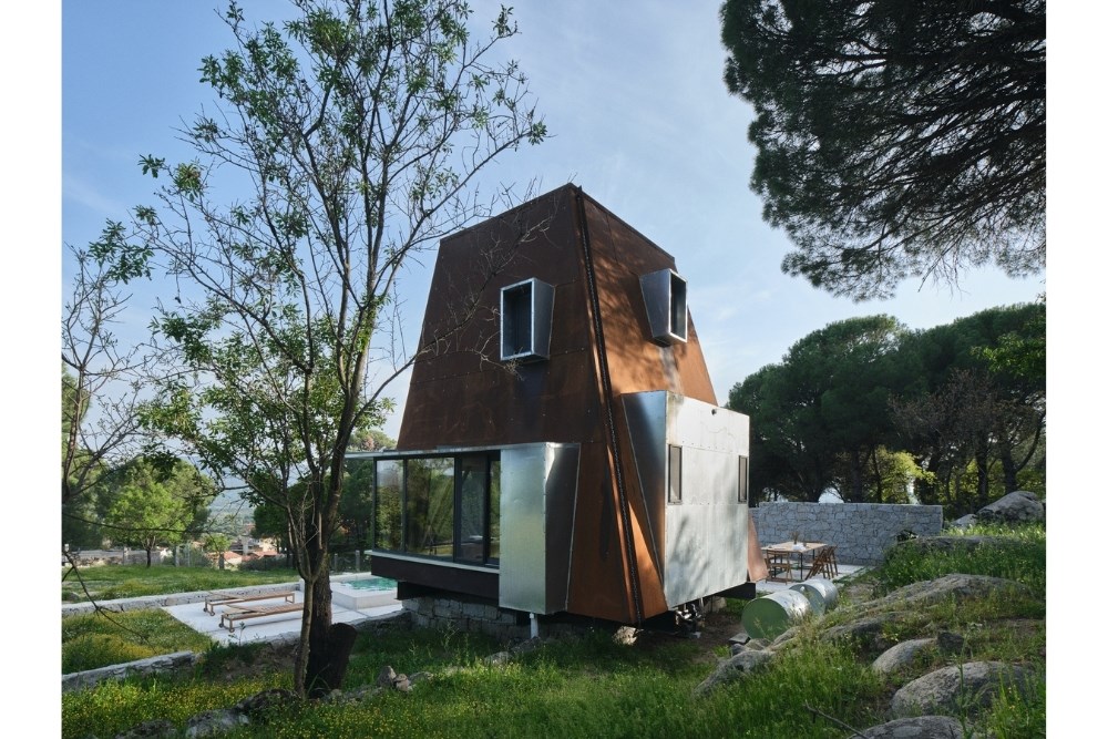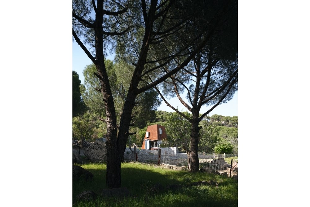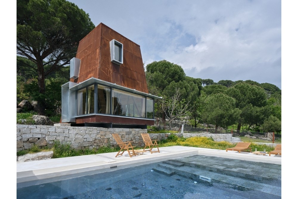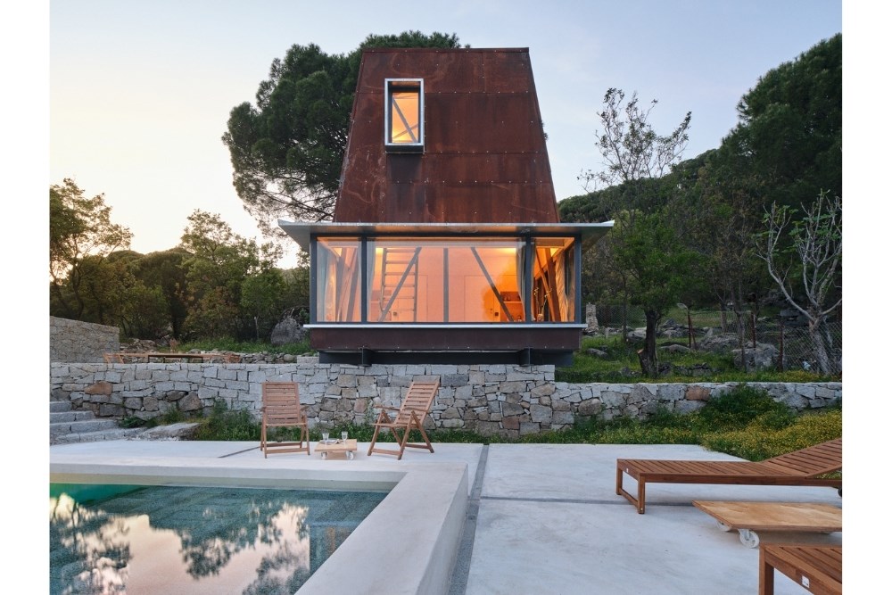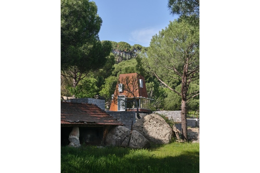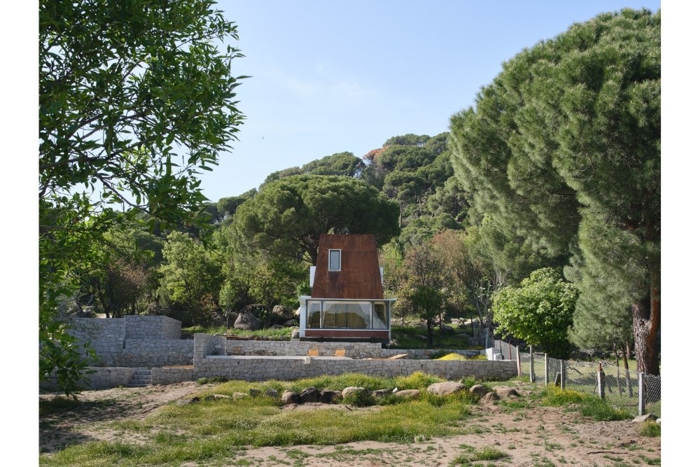 “Cabin in Woods”, kentsel alandan uzak, Bergama’nın Kozak Yaylası’nda, bir köyün yakınındaki tepede konumlanmış, kısa dönemli kiralamalar için tasarlanmış küçük bir kabin projesidir. Eski bir üzüm bağının içerisindeki mevcut kuru taş set duvarlarından birinin üzerine oturan yapı, bir yandan var olan dokuya asgari düzeyde müdahale ederken, diğer yandan çelik yapı sistemi ve metal cephesiyle doğadan tümüyle ayrışır.
