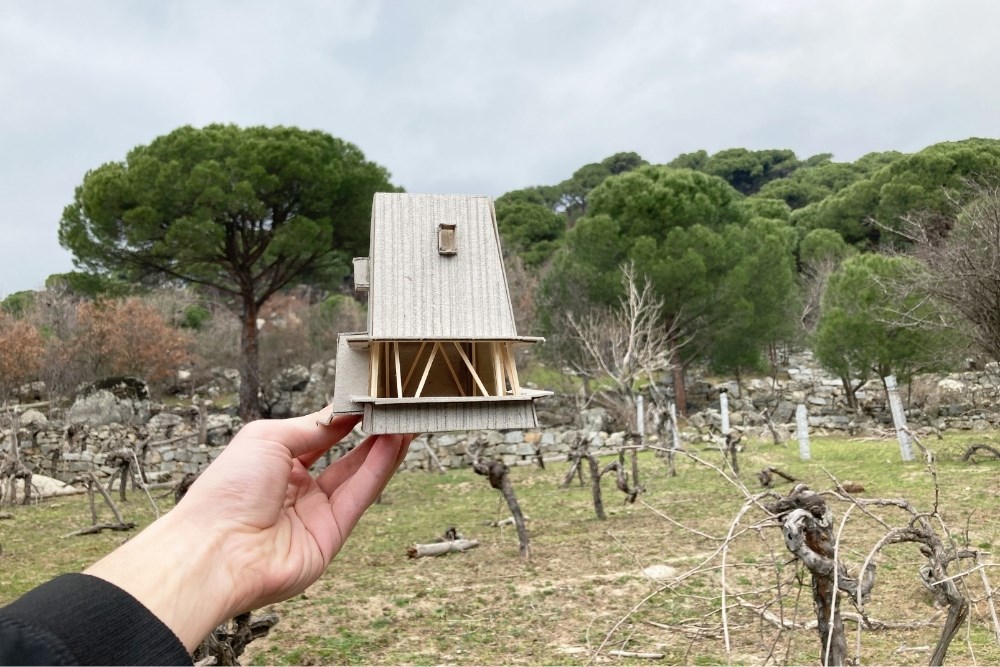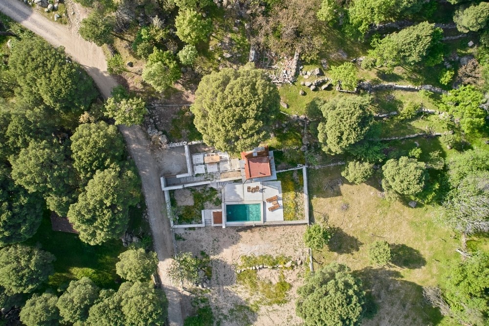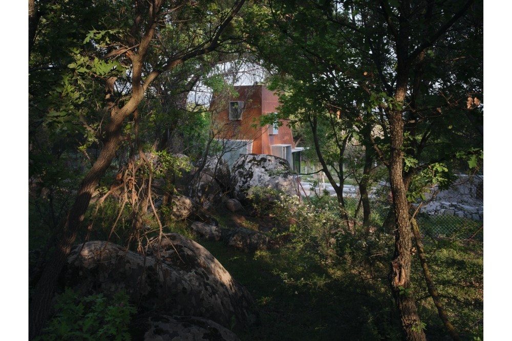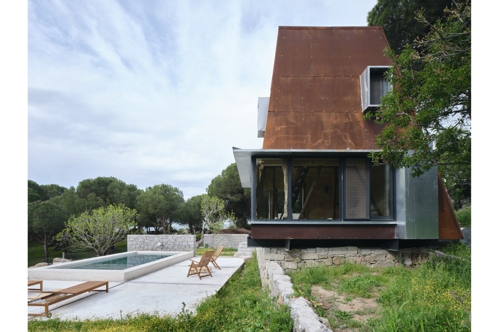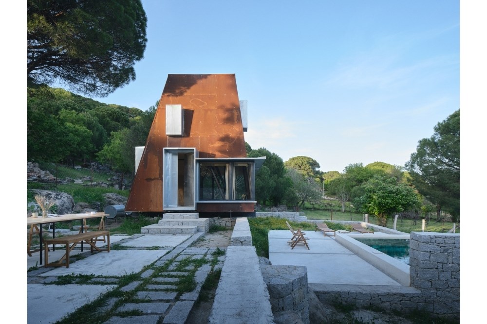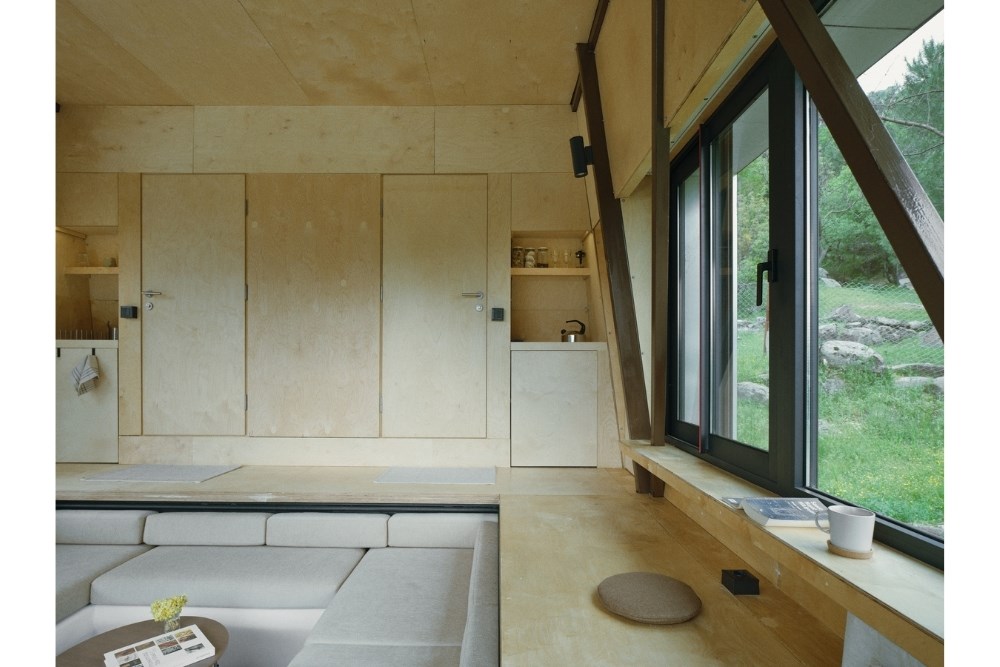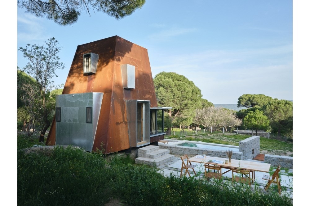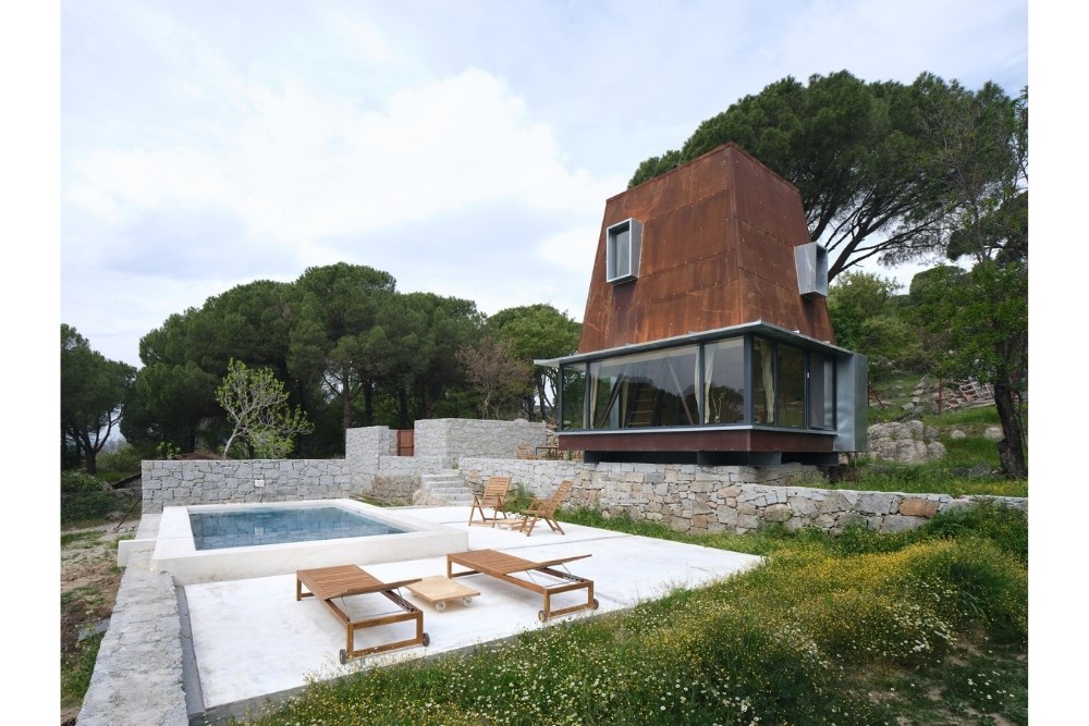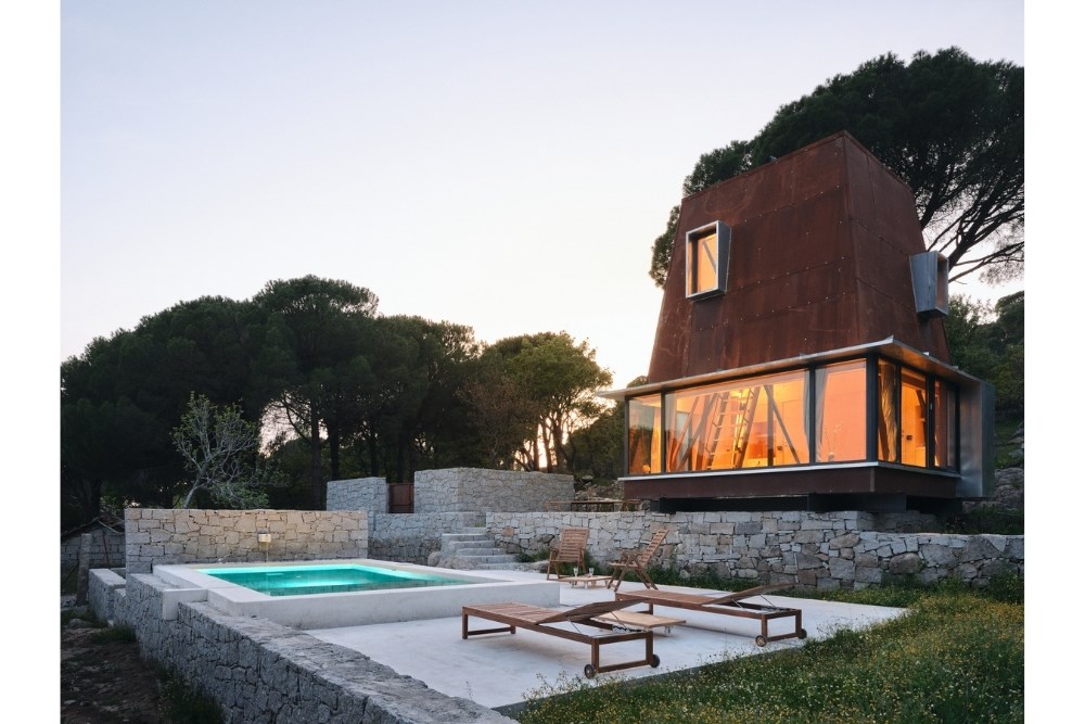 “Cabin in Woods”, kentsel alandan uzak, Bergama’nın Kozak Yaylası’nda, bir köyün yakınındaki tepede konumlanmış, kısa dönemli kiralamalar için tasarlanmış küçük bir kabin projesidir. Eski bir üzüm bağının içerisindeki mevcut kuru taş set duvarlarından birinin üzerine oturan yapı, bir yandan var olan dokuya asgari düzeyde müdahale ederken, diğer yandan çelik yapı sistemi ve metal cephesiyle doğadan tümüyle ayrışır.