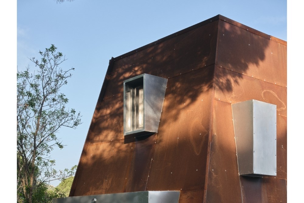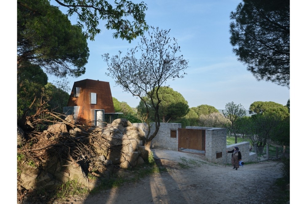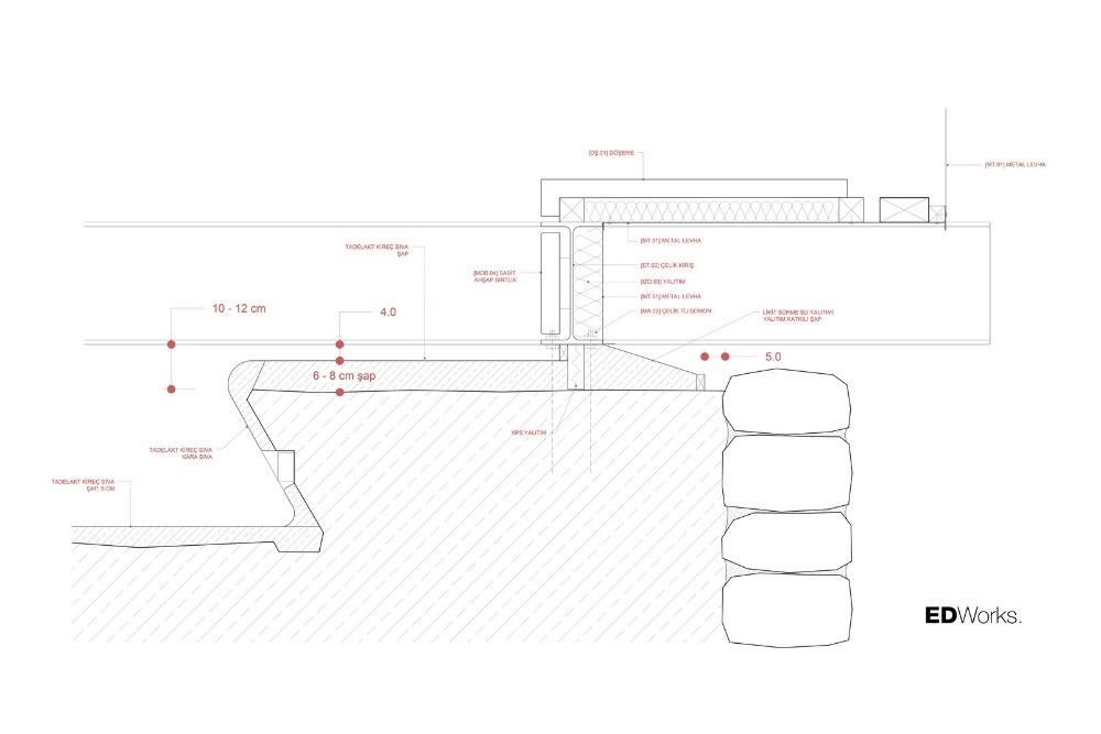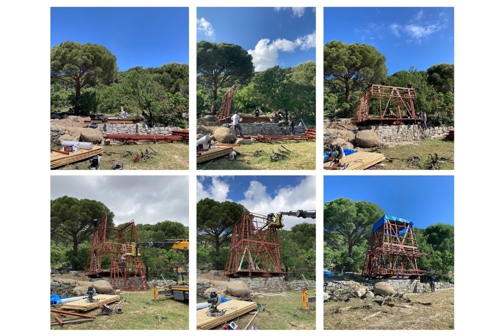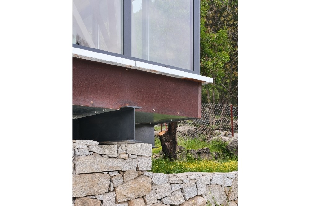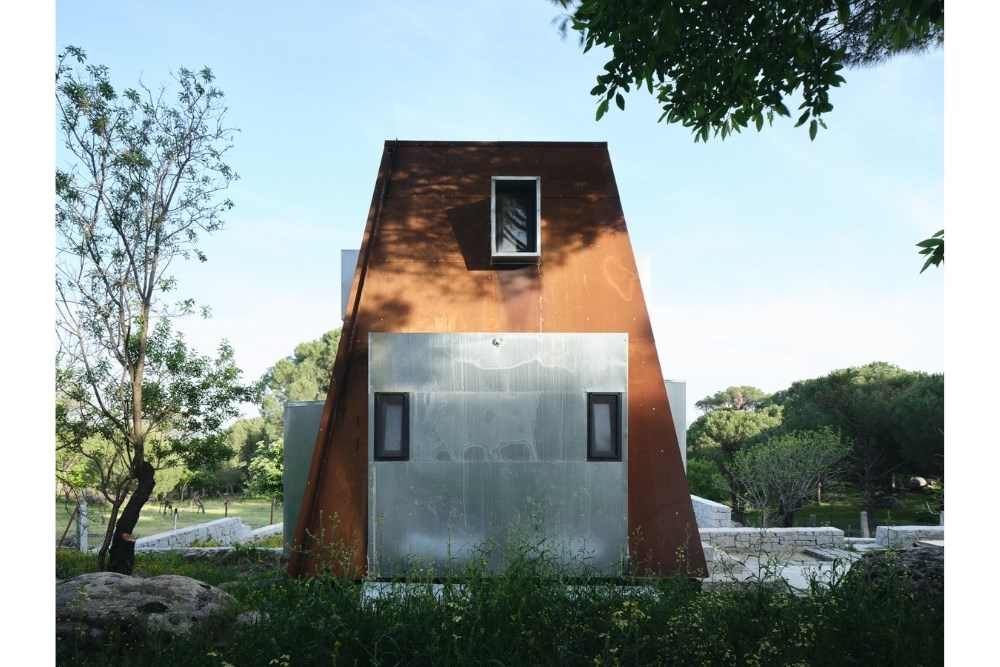 Temel için güçlendirilen set duvarı, bilinçli olarak arazideki taşların mevcut, gelişigüzel ve düzensiz örgüsüyle tamamlanmış; içerisine yerinde dökme (in-situ) betonarme temel dökülmüştür. Topoğrafyadan koparılmış, havada asılı duran çelik iskelet sistemi ve korten metal cephe plakaları ise prefabrik olarak atölyede üretilmiş, arazide yalnızca kurulumu gerçekleştirilmiştir.